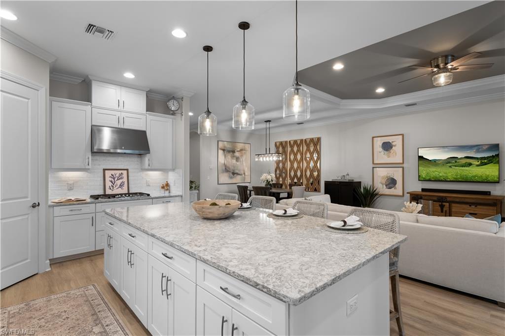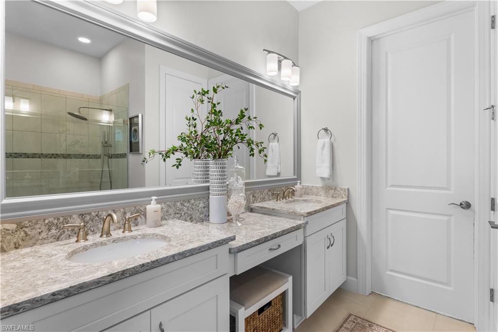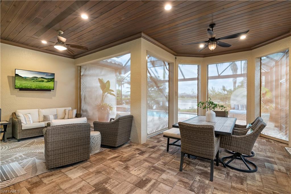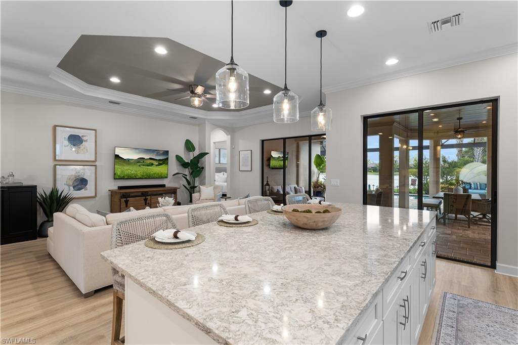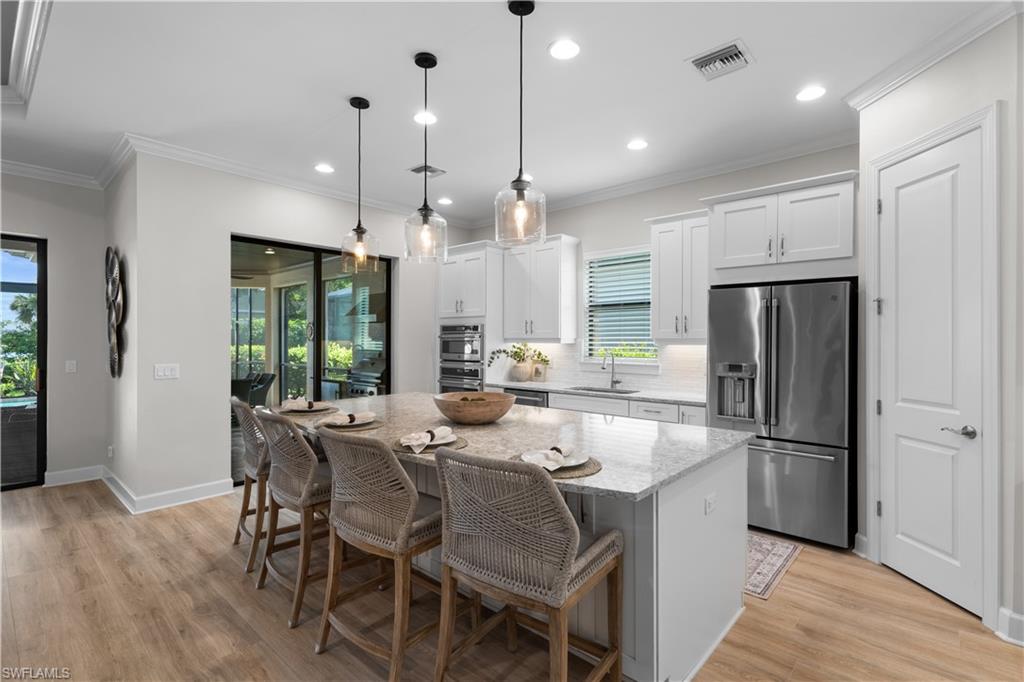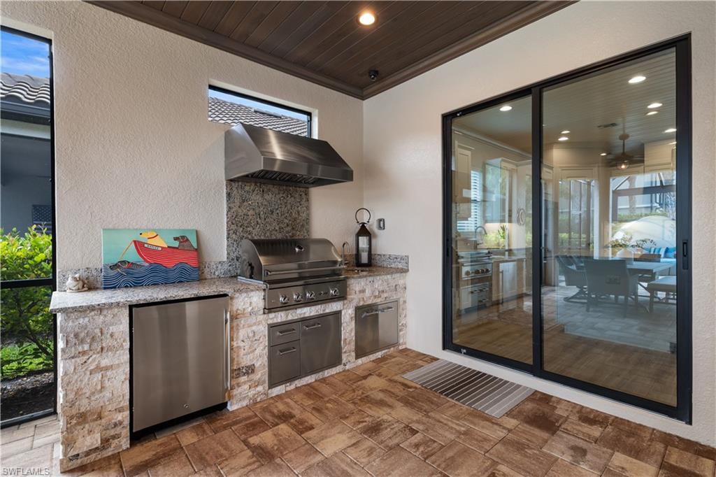 LIVE A VACATION LIFESTYLE IN ESPLANADE! FULL GOLF MEMBERSHIP INCLUDED! This immaculate and well appointed “Lazio” features expansive views overlooking the lake and over $175k IN RECENT UPGRADES! Inside, you will find 3 bedrooms, den, 3 full baths, and just over 2300 sq ft of open concept living space. From the moment you walk in the door, you are greeted with wood floors throughout the common areas & den and two sets of sliding glass doors to the extended lanai complete with custom outdoor kitchen, GAS heated pool with raised spa, picture window screen, motorized roll down hurricane shutters, stained cypress wood ceiling, and lush landscaping. The kitchen is the heart of the home and features shaker style cabinetry, Cambria quartz countertops, pantry with custom shelving, and GE Cafe appliances including a GAS cooktop & wall oven. This home is totally storm ready with a WHOLE HOUSE GENERATOR and complete hurricane protection. Other fine appointments include: BRAND NEW HVAC; BRAND NEW GAS POOL HEATER; plantation shutters on all windows; expanded primary & front guest bedrooms with bay windows; primary suite walk in closet with custom shelving/drawers; hurricane impact front door with matching sidelights; air conditioned extended garage with motorized ceiling storage racks & epoxy floor; freshly painted interior and exterior; spacious Laundry Room with cabinetry; rescreened pool cage (roof/2024); extensive crown molding; updated bathroom light fixtures; tankless GAS hot water heater; 8' doors/10' ceilings; extensive professionally enhanced landscaping with professional landscaping lighting; updated & upgraded bedroom carpet/padding; and more! Esplanade Golf & Country Club of North Naples offers a true “Lifestyle Community” with world-class amenities, including a resort pool with cabanas and the popular “Bahama Bar,” tennis, pickleball, bocce, a 14-mile network of bike/walking trails, and an 18-hole private golf course. The impressive 15,000 Sq Ft clubhouse features a restaurant, bar, wine-tasting room, wine lockers, and a Starbucks-style café. Best of all, the property’s landscaping, irrigation, golf membership, and all community amenities are covered under a quarterly fee of just $3,412—no additional fees or memberships required! Don't miss your opportunity to own this exceptional home in one of Naples’ most sought-after communities. Schedule your tour of this stunning home and Esplanade Golf & Country Club today! COMING SOON TO ESPLANADE (2026): Fully renovated and expanded poolside Bahama Bar; expanded outdoor bar at the Barrel House; expanded golf practice range; and an AIR CONDITIONED INDOOR PICKLEBALL COMPLEX with four indoor courts.