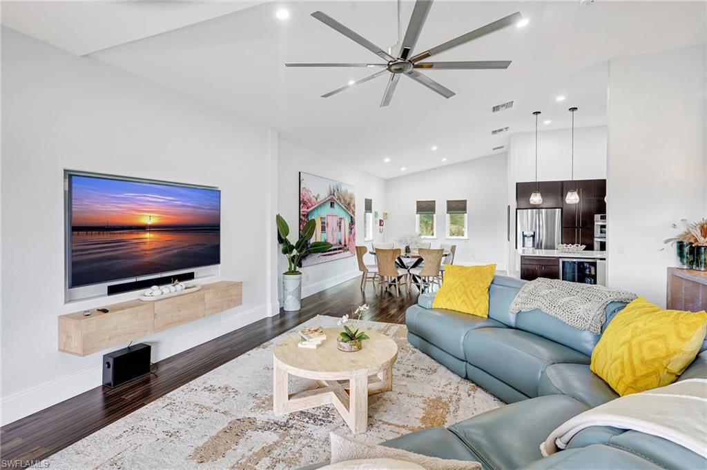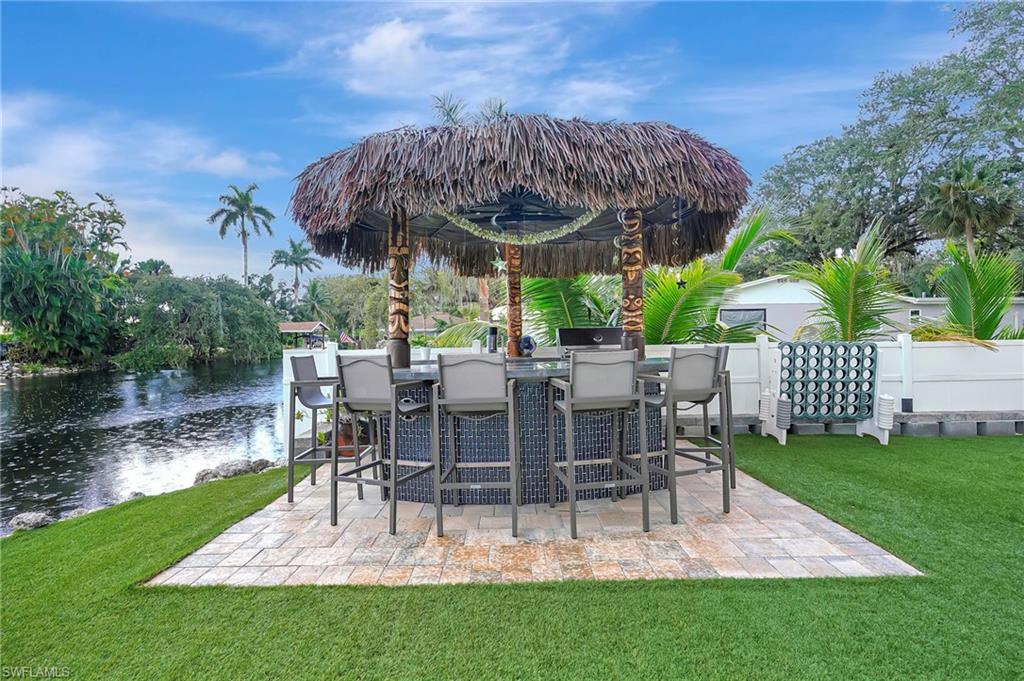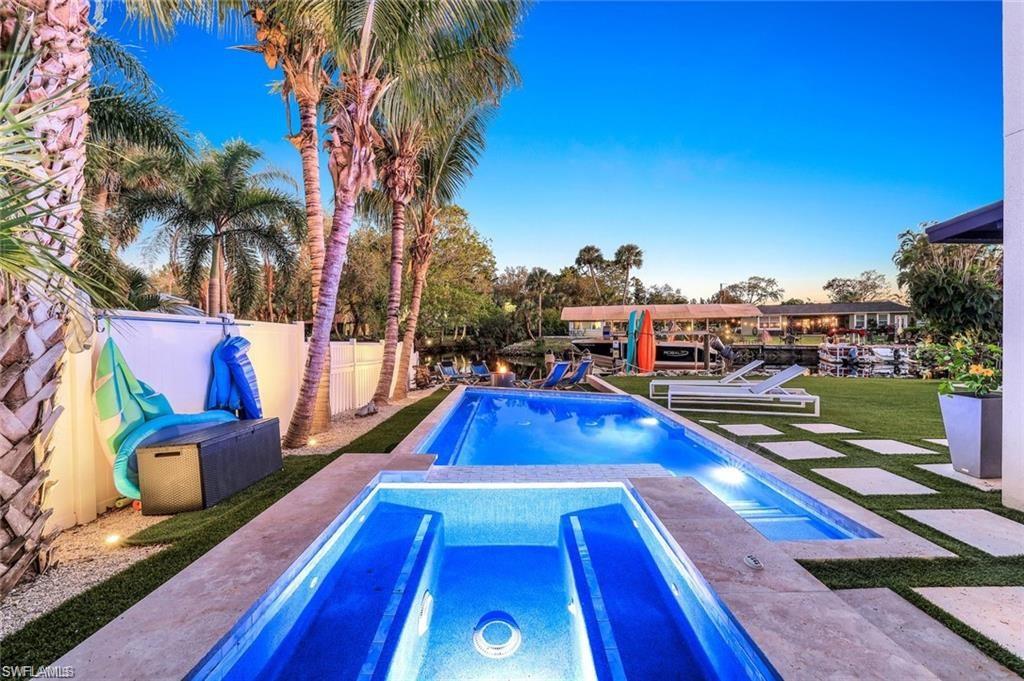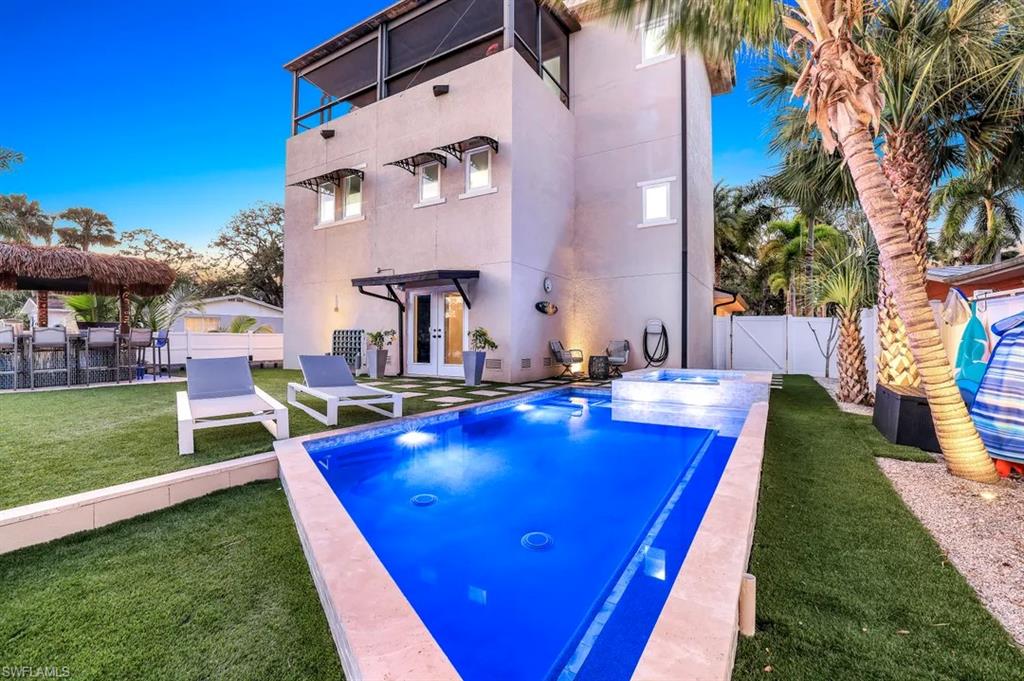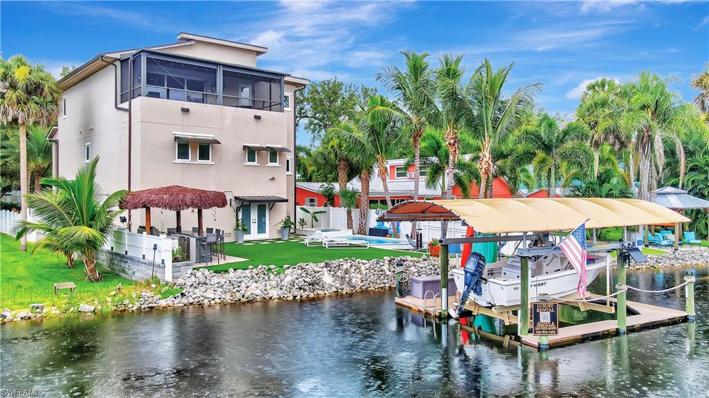 Welcome to the exceptional riverfront gulf access home featuring, a perfect balance of luxury, craftsmanship, and coastal living. Tucked away on a quiet dead-end street along the Imperial River, this 3 bedroom + den, 3 bath home was built in 2014 and designed to capture the beauty of Florida waterfront living from every angle. The open-concept layout flows effortlessly. Beautiful high ceilings, rich wood and tile flooring, and impact-resistant casement windows showcase timeless quality and attention to detail. The heart of the home features a chef’s kitchen with an oversized island, double wall ovens, cooktop, custom cabinetry, water treatment system, and stainless-steel appliances — all overlooking the spacious great room and dining area. Step outside to your private tropical retreat, with a heated saltwater pool and integrated spa, custom upgrades, and ambient lighting. The fenced backyard is beautifully landscaped and leads to your own private dock on the Imperial River, complete with boat lift, composite decking, water and electric service, and a tiki hut — the perfect place to unwind as the sun sets over the river. With Gulf access via bridges, you’ll enjoy easy navigation to Estero Bay and the Gulf of Mexico, ideal for boating enthusiasts. The primary suite, located upstairs for privacy and elevated views, features a luxurious bath with dual sinks, soaking tub, and multiple shower heads. Additional bedrooms offer generous space for family or guests, while the den provides the flexibility for a home office or hobby room. This home also includes a 2-car attached garage, decorative paver driveway, metal roof, impact glass throughout, and low-maintenance stucco exterior. Practical features such as a central irrigation system, automatic sprinkler, laundry tub, built-in cabinets, and ample storage blend seamlessly with its elegant design. Situated just blocks from the vibrant energy of downtown Bonita Springs, this property offers no HOA fees, no restrictions, and easy access to downtown Bonita Springs, the Gulf beaches, Riverside Park events, and US-41 shopping and dining. It’s the ideal combination of peace, privacy, and proximity. Enjoy the beauty of waterfront living — kayak, fish, or boat right from your backyard while taking in serene river views and warm coastal breezes. Whether you’re seeking a full-time residence or seasonal escape, 27281 S Riverside Drive offers everything you need to get the Florida lifestyle.