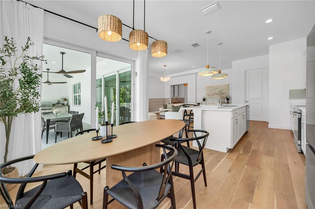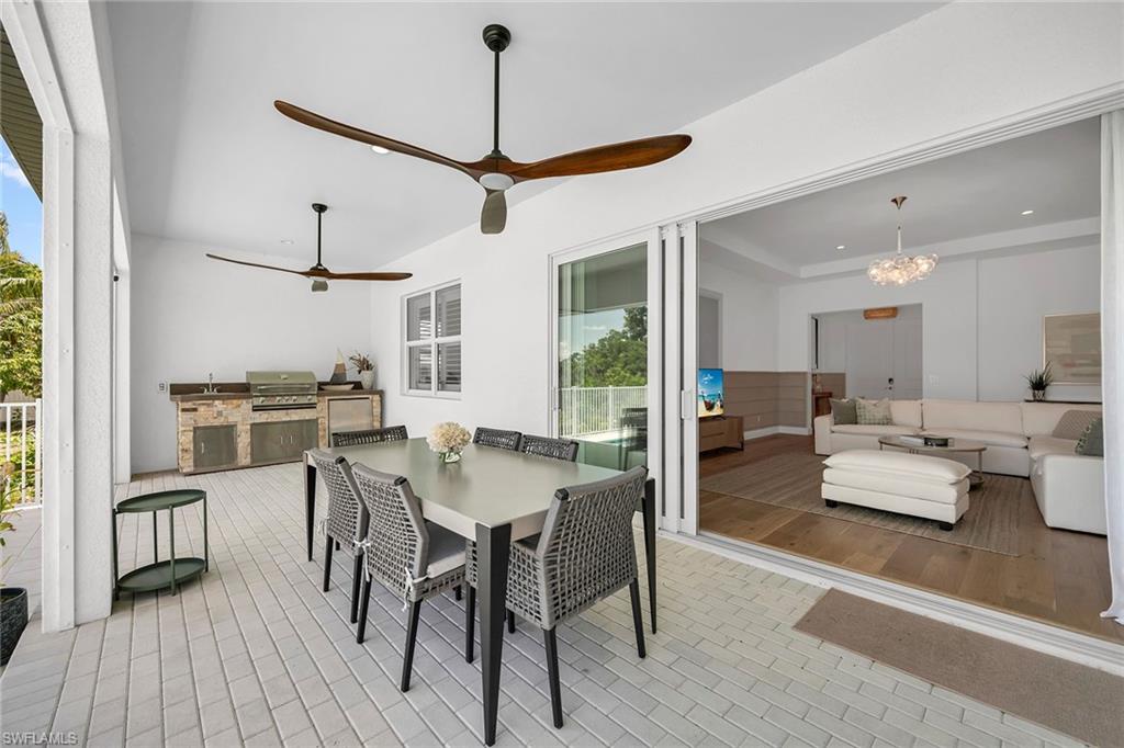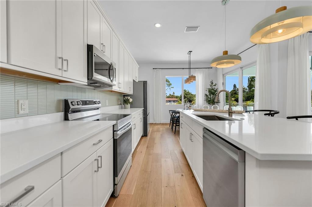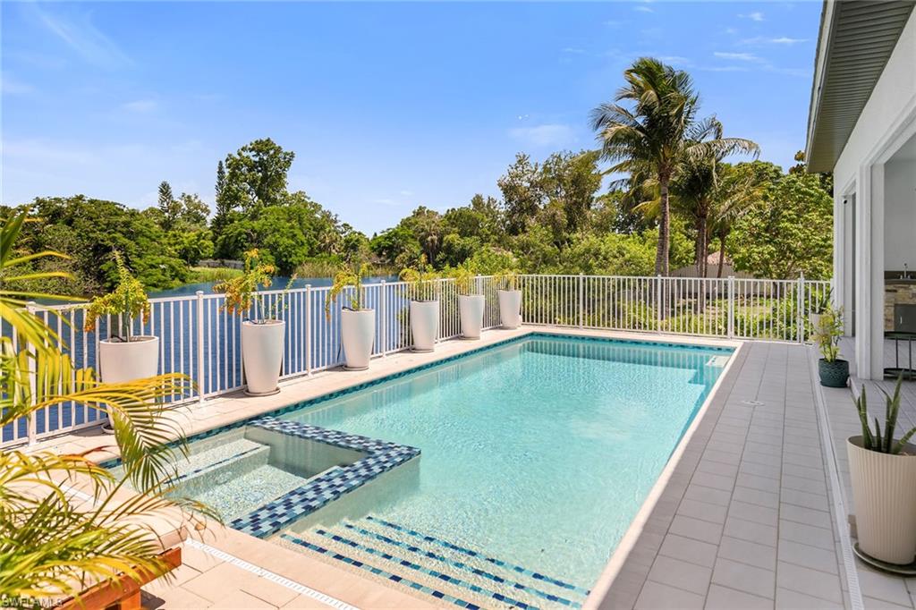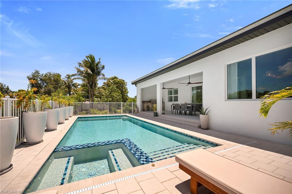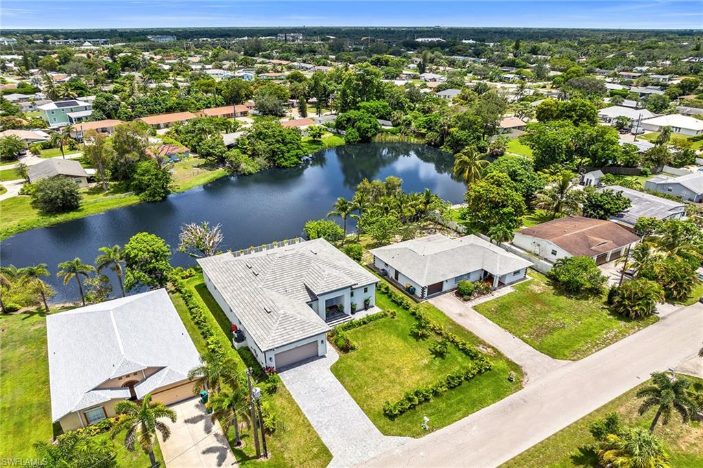 Enjoy the ultimate in luxury coastal living with this new, never-lived-in single-family pool home offering a rare combination of modern design, lakefront views, and a prime central Naples location with no HOA fees. Sitting at a high elevation of 14.8 feet, this property provides peace of mind and added security. Just minutes from world-renowned beaches, shopping, dining and top attractions, this stunning residence was custom-built in 2025 by Kaye Lifestyle Homes and professionally furnished, with furnishings negotiable. Designed for full-time living and high-end investment potential, this open-concept four-bedroom, three-bath home features a flat tile roof, soaring 12-foot tray ceilings, wide-plank hardwood floors, and hurricane-impact glass windows and doors throughout. The great room impresses with custom wall detailing and glass sliders opening to tranquil lakefront views. The gourmet kitchen offers white soft-close cabinetry, quartz countertops, a tile backsplash, pendant lighting and a large island with bar seating. A spacious walk-in pantry and new stainless steel appliances, including range, refrigerator and freezer, microwave, and dishwasher, complete the space. The adjacent dining area overlooks the water and provides direct lanai access. Go outside to a private, resort-style lanai featuring covered outdoor living with two modern ceiling fans and a custom outdoor kitchen complete with a built-in stainless steel barbecue, mini refrigerator and sink. The open heated pool and spa, built by Summit Pools, are surrounded by a fully fenced brick paver deck with unobstructed lakefront views, allowing you to enjoy stargazing nights without a cage. A dedicated pool bath provides added convenience for outdoor living. The luxurious owner’s suite offers peaceful lake and pool views, a 3D textured accent wall, two walk-in closets with built-ins and a spa-inspired bath with dual vanities, quartz counters, soaking tub and a walk-in shower with textured tile, rain head, niches and private windows. One guest bedroom has its own en-suite bath with a walk-in shower that also functions as a pool bath, while the remaining guest bedroom is served by a full bath with a custom tile shower and tub combination. The spacious layout includes a versatile fourth bedroom that can also serve as a den, office or study, complete with a closet, modern light fixture and double door entry. Additional upgrades include white plantation shutters throughout, custom trim and baseboards, washer and dryer with utility sink, epoxy garage flooring, Ring doorbell, Arlo camera system and pre-wiring for a generator. Seller offers transferable flood insurance, along with a 10-year builder warranty and 2-10 Home Buyers Warranty coverage for added peace of mind. In desirable Twin Lakes, this lakefront home offers exceptional convenience with no HOA, ideal as a luxurious residence or smart investment.