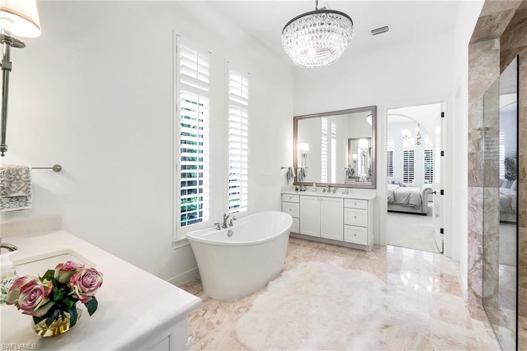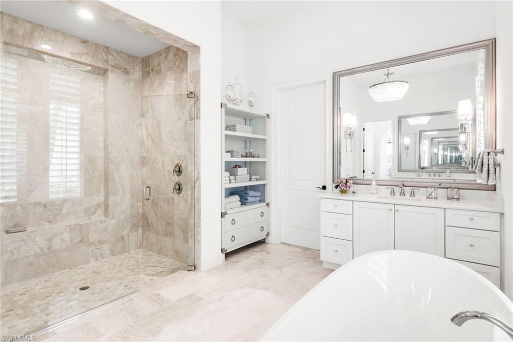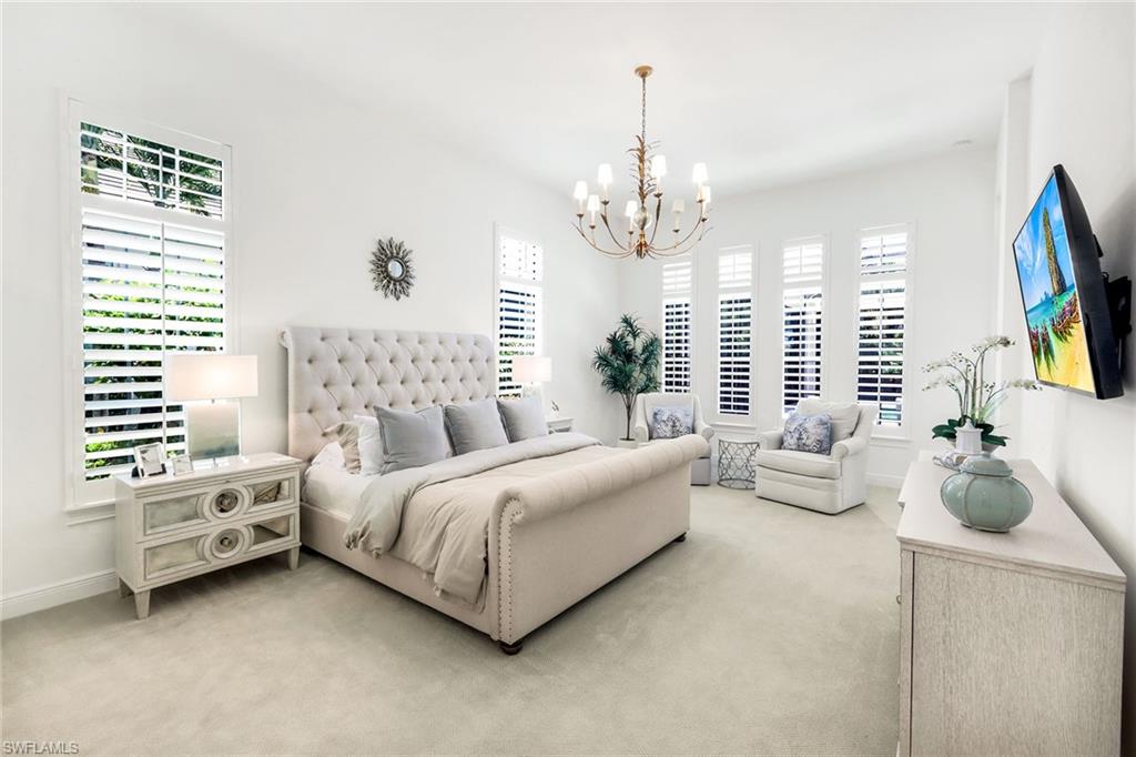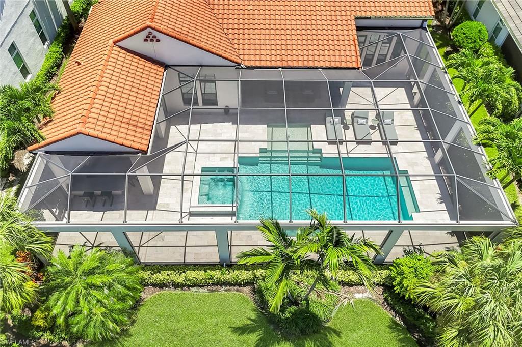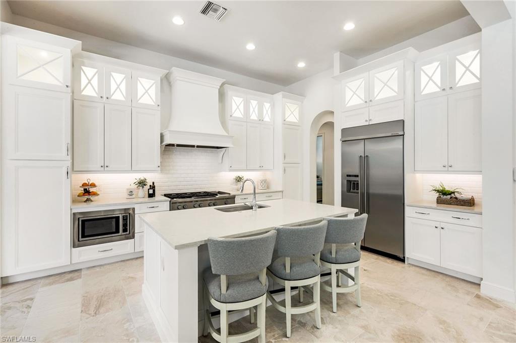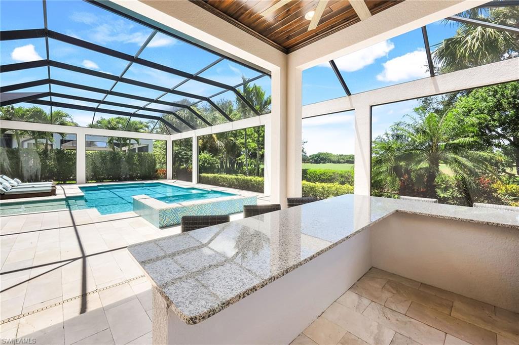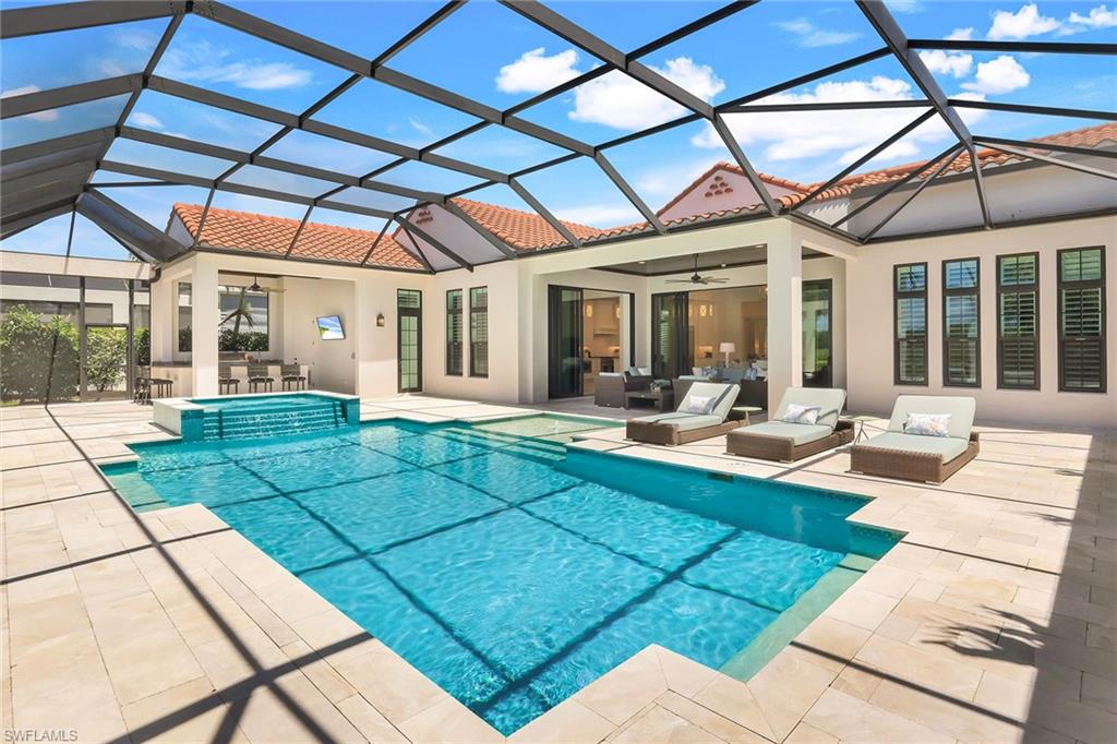 In prestigious Fiddler’s Creek, this exceptional luxury residence offers expansive golf course views, professional landscaping, and delightful outdoor lighting. The charming French door entry opens to inviting 14-foot ceilings, a distinctive foyer, and stunning designer flooring. The exceptional living area opens through 10-foot impact glass doors to the breathtaking pool and summer kitchen beyond. Sun-shelf, bubblers and a delightful spa with sparkling multi-colored tile invite you to spend lots of time in the pool. The wood accent ceiling has a warm and inviting effect on the overall impression of the outdoor area. Inside, the open-concept great room embraces formal dining with seamless access to the expanded lanai. The gourmet-style dining and kitchen area features an oversized island with stunning white quartz and KitchenAid appliances. The custom cabinetry with additional height and glass front doors is exceptional. Pullout shelving, and a custom-designed range hood complete the desirability of soft tropical elegance. Plantation shutters, custom lighting, and ceiling fans exist throughout the home. A sitting area in the primary main suite contributes to the home’s refined style. An exceptionally large walk-in closet is always a good idea and this home has it. The gorgeous main bath is unique and beautifully appointed. Additional features include a three-car garage, extended driveway, and enhanced exterior elevation. The three additional bedrooms are all en suite and continue the color and style of the overall decor. Each with oversized closets. A delightful powder room and niche just off the entrance hallway gives character and appeal to this lovely home. A large laundry room and superior, side-load, three-car garage complete the picture. Residents enjoy award-winning amenities of Fiddler’s Creek, including many new pickleball and tennis courts, a newly remodeled lagoon-style pool, spa and fitness center, with the benefit of gracious formal dining as well as outdoor grill and other dining venues. Recreation opportunities are numerous as well as the option of golf, beach and boating memberships. Minutes from the amenities of Old Naples and Marco Island, this gorgeous home is a delight.