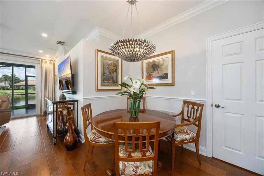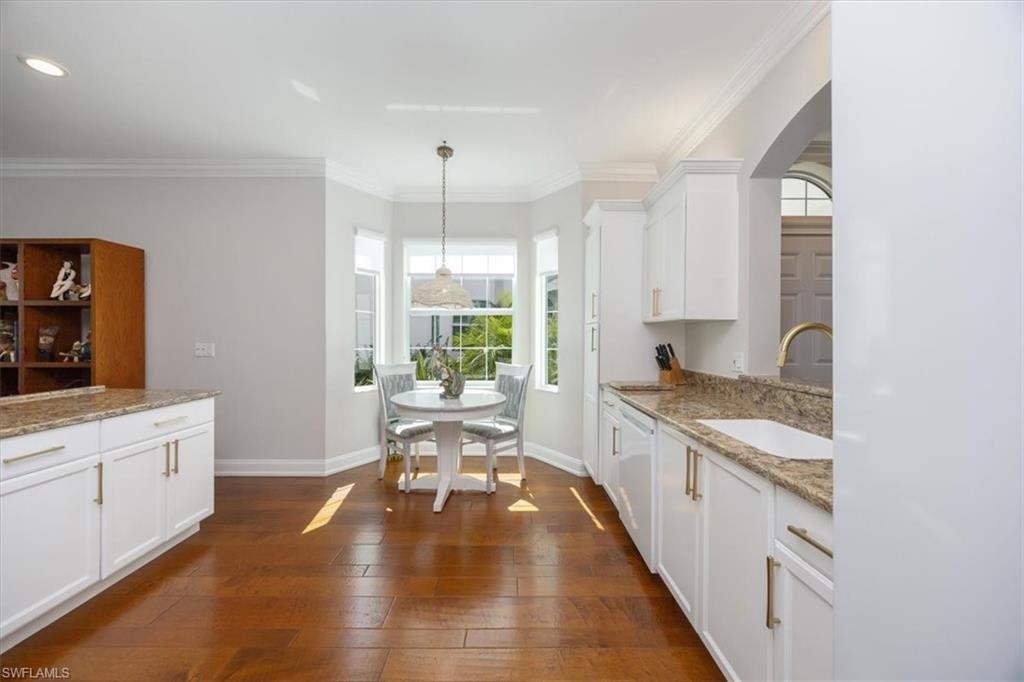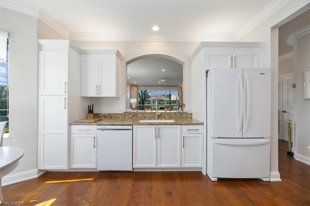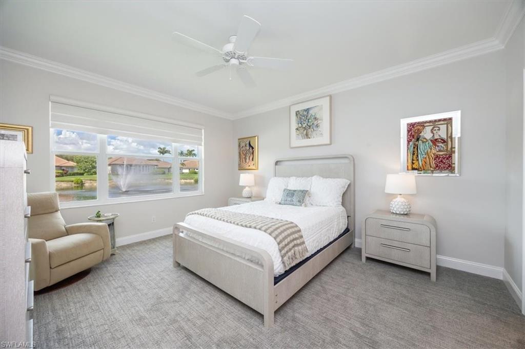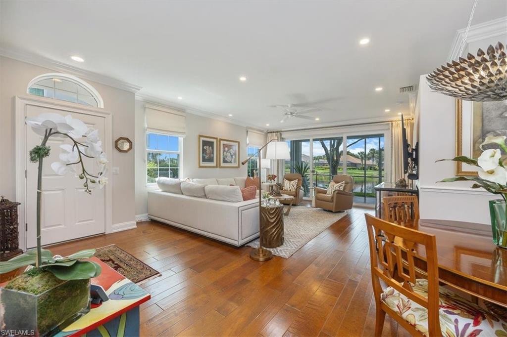 Welcome to this beautifully updated ground-floor end unit in the sought-after Wedgewood neighborhood of The Strand. With 1,449 square feet of living space, this residence blends comfort and style in one of North Naples’ premier gated communities. Inside, the bright, open layout is ideal for both everyday living and entertaining. The spacious kitchen features granite countertops, abundant cabinetry, and an inviting breakfast nook—perfect for enjoying your morning coffee. The living room extends seamlessly to the screened patio, where serene lake views and a tranquil water feature create a peaceful backdrop. The primary suite offers a private retreat with a renovated bath, walk-in shower, and generous closet space. A guest bedroom and beautifully remodeled guest bath ensure comfort and privacy for visitors. Elegant details, including hardwood floors, crown molding, Hunter Douglas blinds, and custom lighting, elevate the home’s timeless appeal. Additional upgrades include impact-resistant windows and electric storm shutters on the lanai. A detached single-car garage with an epoxy floor provides both storage and convenience. The Club at The Strand offers three dining options, a lively calendar of events, and an impressive array of resort-style amenities. Enjoy an Olympic-sized pool, a brand-new state-of-the-art fitness center, a full-service spa, eight HydroGrid Har-Tru tennis courts, pickleball, bocce ball, basketball, and so much more! Surrounded by lush landscaping and set within a peaceful community, the home is just minutes from Naples’ world-class shopping, dining, and Gulf beaches. Whether as a year-round residence, seasonal retreat, or investment property, this meticulously maintained home offers the perfect opportunity to embrace the relaxed yet vibrant lifestyle of Southwest Florida.