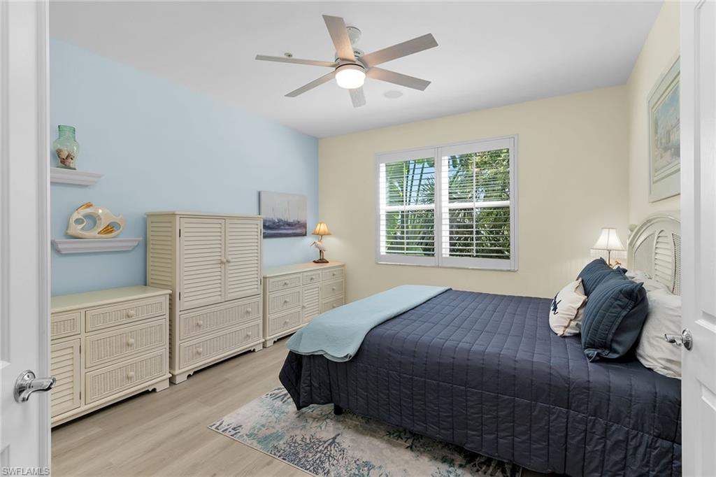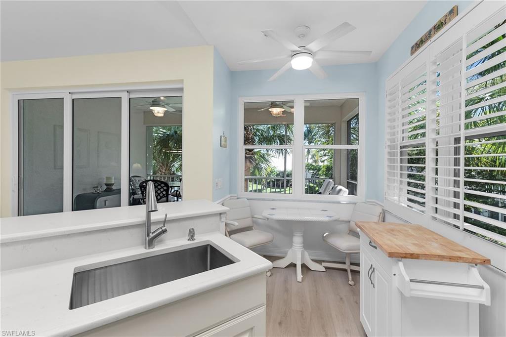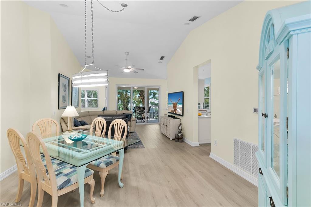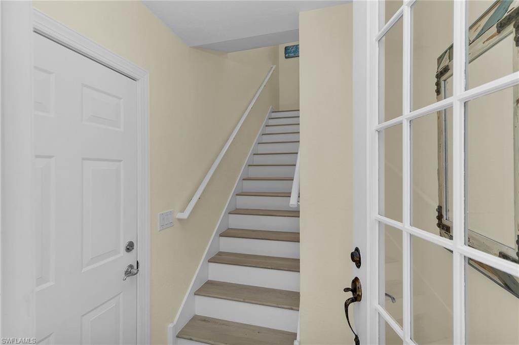On the cul-de-sac in the quaint village of Hawk's Nest, this light and bright end-unit, second-floor condominium is in the upscale gated community of Fiddler's Creek. This beautifully furnished 2 Bedroom plus Den coach home has neutral luxury vinyl plank flooring, creating a smooth flow throughout. With three bedrooms, vaulted ceilings and an open floor plan, this home is spacious and designed to optimize natural light. This upstairs unit features tasteful finishes, impact glass windows and sliding door, creating an appealing atmosphere. The well-appointed kitchen features white cabinetry, modern stainless appliances and ample counter with a bar and eat-in area, while the primary suite provides a peaceful retreat with a spacious en-suite bath and a large walk-in closet. There is a convenient laundry room in this condominium and an attached garage has epoxy flooring. With desirable parking spots, this unit has a 2020 roof and is not far from the village pool. Residents enjoy resort-style amenities including a 54,000-square-foot clubhouse, lagoon-style pools, a fitness center, tennis and pickleball courts, and an array of dining options. Optional golf, beach and marina memberships allow for endless recreation and entertainment possibilities. With its prime location just minutes from Marco Island, downtown Naples, pristine beaches, boating, shopping, movies, theatre, restaurants and airports, this condominium offers the ideal blend of luxury and convenience.