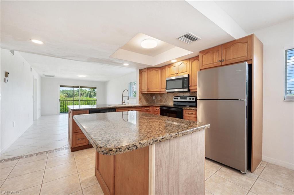 Welcome to Naples Green, where comfort, convenience, and charm come together! This spacious 3-bedroom, 2-bath upstairs condominium offers bright, open living spaces and serene lake and golf course views from your private screened lanai. The updated kitchen is equipped with stainless steel appliances and plenty of cabinetry, while the open-concept layout creates an inviting flow for everyday living and entertaining. The primary suite features a large walk-in closet and a private bath with a step-in shower. Two additional bedrooms provide flexibility for family, guests, or a home office. Additional conveniences include an assigned carport right in front of the unit, ample guest parking, and in-unit laundry. Set within a quiet community of charming two-story buildings, residents enjoy access to a sparkling community pool surrounded by lush landscaping. The prime location places you just minutes from shopping, dining, and entertainment, with easy access to both Downtown Naples and Marco Island. This is your opportunity to enjoy the Naples lifestyle in a clean, well-maintained, and move-in ready home at an affordable price!