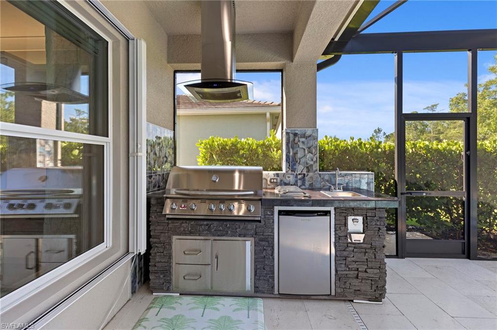 Welcome HOME where elevated design, modern comfort, and resort-style living merge effortlessly. This GL Homes Cabernet floorplan features 3 bedrooms, a spacious den, 2 full bathrooms, and 2,196 sq ft of impeccably upgraded living space crafted for sophistication and ease. An extended paver driveway and widened sidewalk welcome you, enhanced by custom landscaping and outdoor lighting. The 3-car garage showcases epoxy floors, insulated doors and ceiling, overhead storage, mini split A/C, electric bike lift, and a 240V EV charger a true extension of the home. Inside, Level 7 porcelain tile flows through main areas, complemented by custom lighting, wallpapered feature walls, mirrors, sconces, tailored window treatments, and a Sonos whole-home sound system. The gourmet kitchen features Level 7 cabinetry, quartz counters, upgraded Profile stainless steel appliances, a large island with breakfast bar, under- and upper-cabinet lighting, and a breakfast nook overlooking the lanai. The formal dining area is perfect for intimate gatherings. The primary suite offers a serene retreat with a walk-in shower featuring dual shower heads including an upgraded rain shower, private water closet and dual sinks. The stunning backyard oasis features a heated saltwater pool and spa that sparkles beneath the Florida sun, surrounded by a cool-to-the-touch shell stone tile pool deck. The backyard is framed by lush landscaping and elegant lighting, featuring an outdoor shower and a fully equipped summer kitchen with grill, griddle, vented hood, refrigerator, and Italian tile. With about $300,000 in custom upgrades, this home offers luxury and peace of mind with impact-resistant windows, accordion and electric roll-down shutters, tinted windows, a Kohler whole-house generator, solar panels, and a whole-house water filtration system. Valencia Bonita is a vibrant 55+ community offering resort-style amenities such as a clubhouse, pools, fitness center, pickleball and tennis courts, and social events all set amid beautifully maintained grounds. Meticulously maintained and move-in ready, this exceptional home invites you to relax and enjoy an unparalleled lifestyle.