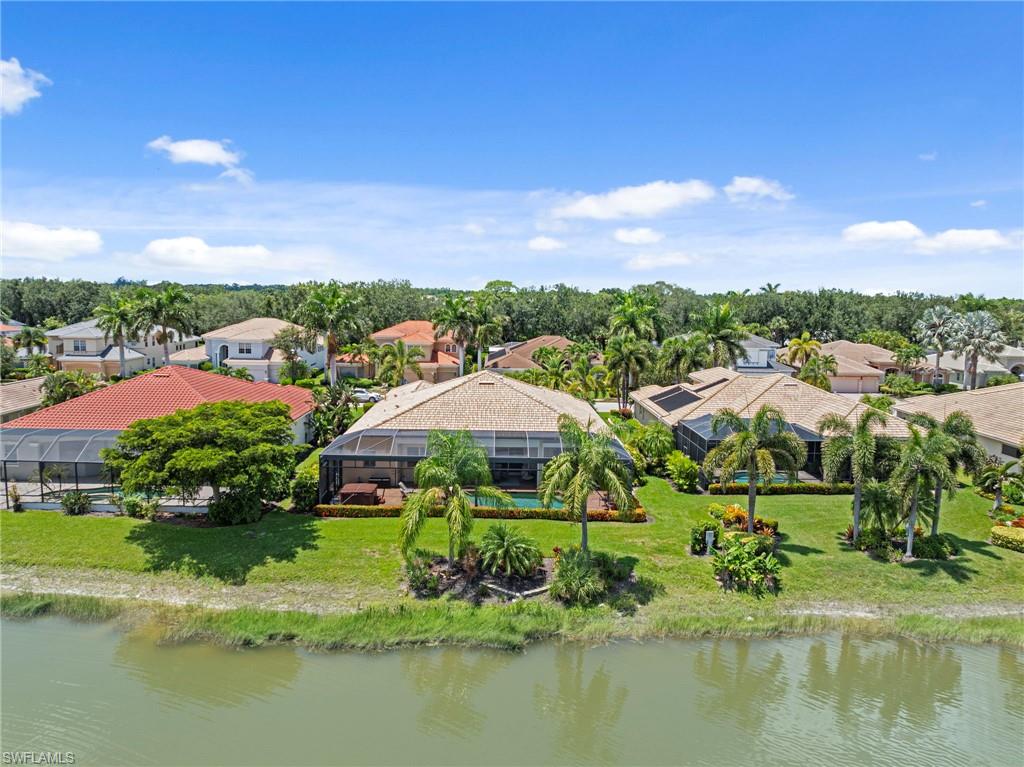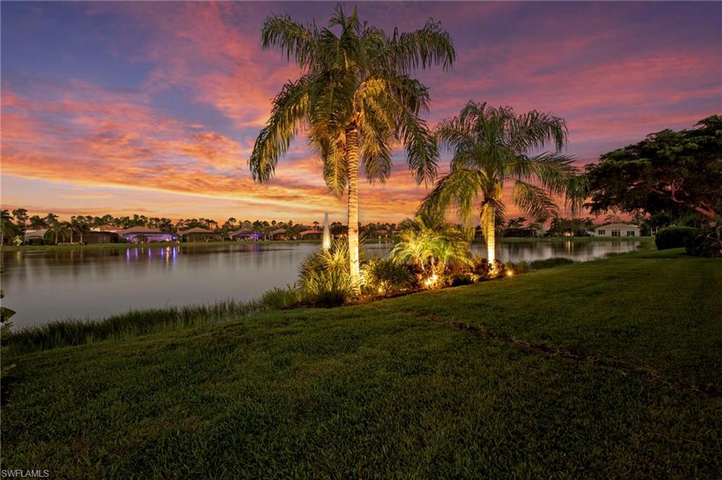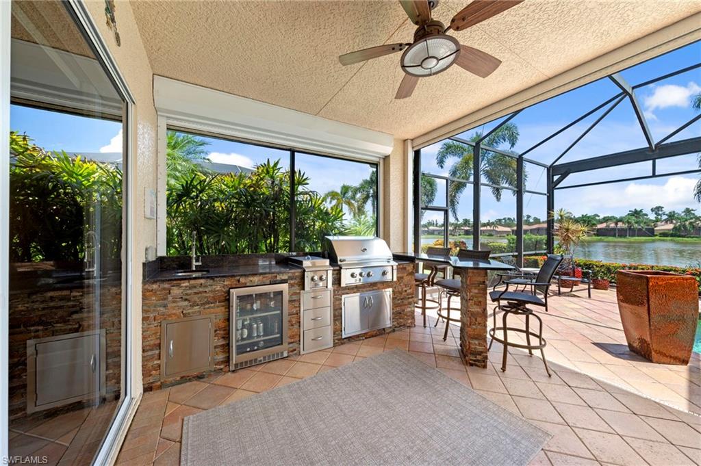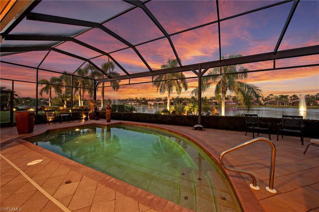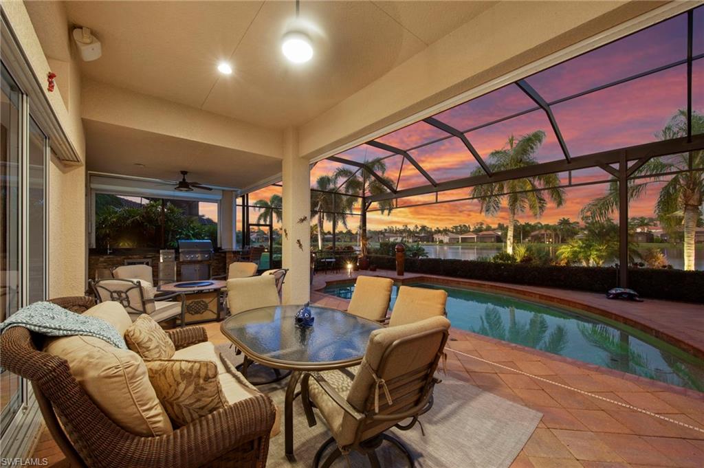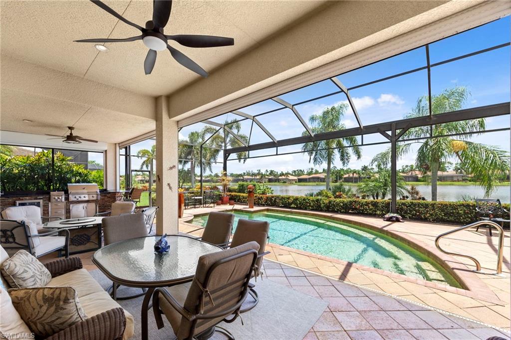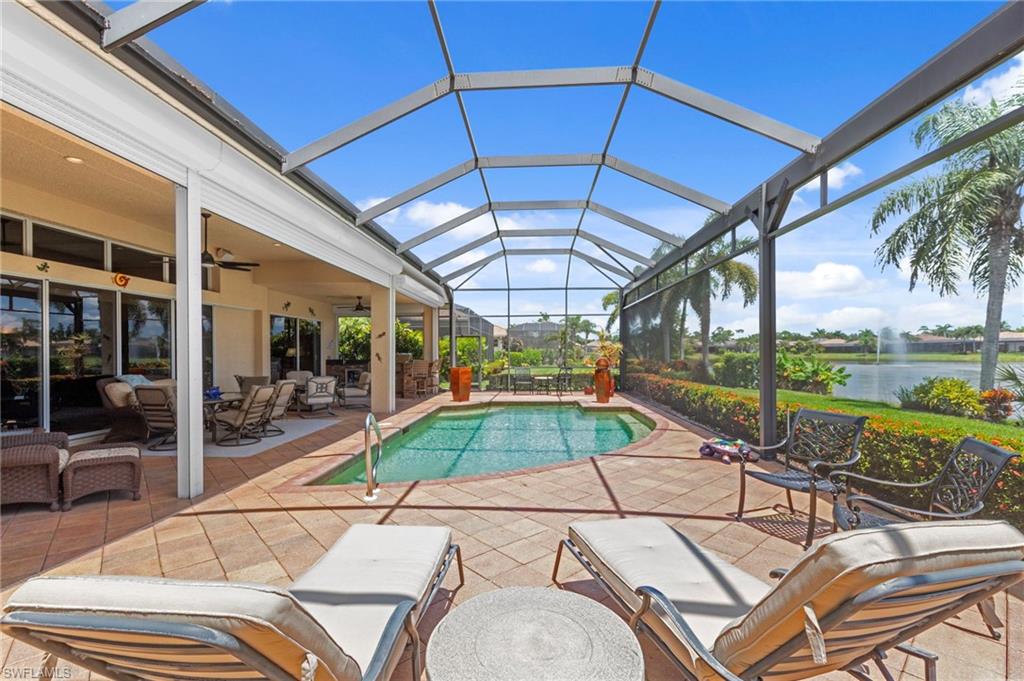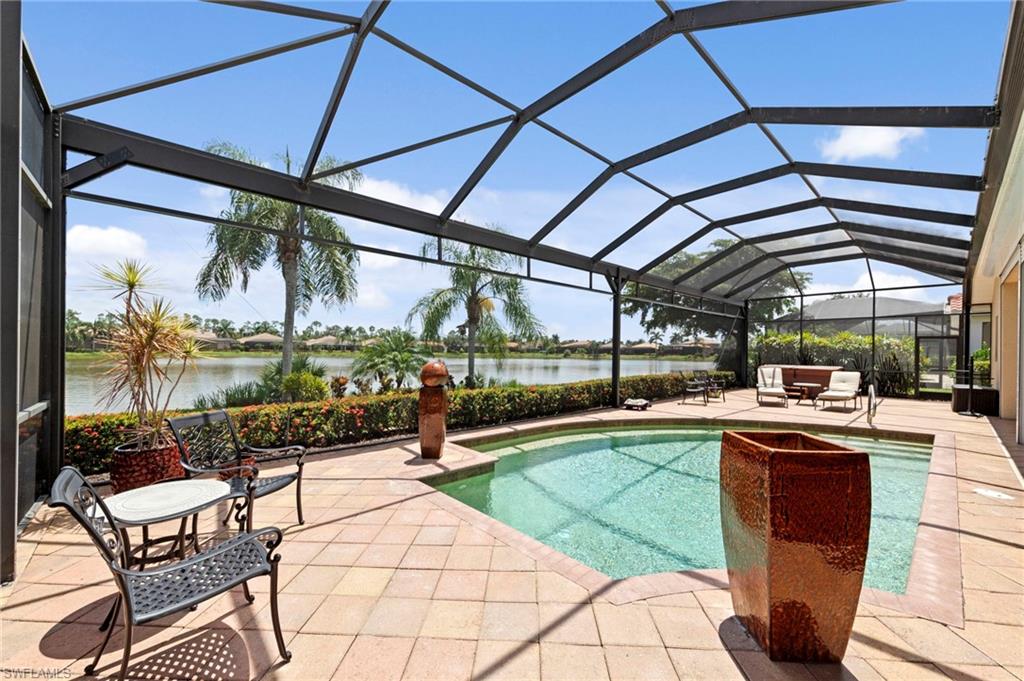 This sought-after Aragon model sits on a premium lakefront lot with sweeping wide-water views and numerous upgrades, blending relaxed sophistication with modern comfort. Spanning over 3,100 square feet, the home offers four spacious bedrooms (or 3 beds + home office) and four full bathrooms, all thoughtfully designed for both everyday living and entertaining. The open great room floor plan with soaring ceilings creates an airy, inviting atmosphere, anchored by a gourmet kitchen with granite countertops, stainless steel appliances, and a generous center island—perfect for gatherings with family and friends. The master suite is a true retreat, with tray ceilings, dual walk-in closets, 8-foot sliding glass doors to the lanai, and a spa-like bathroom featuring dual vanities, a soaking tub, and a walk-in shower. New LVP flooring runs throughout all bedrooms, offering style, durability, and comfort with no carpet. Walls of sliding glass open to the screened lanai, where a sparkling SALTWATER POOL is framed by a new panoramic screen that enhances the wide-water view. A full outdoor kitchen and spacious lanai provide the perfect setting for entertaining or enjoying peaceful lakefront living. For added peace of mind, the home features a newer roof, A/C's, pool heater, and water heater, along with IMPACT GLASS windows, a WHOLE-HOUSE GENERATOR, and roll-down hurricane shutters. Belle Lago residents enjoy resort-style amenities including a clubhouse, fitness center, resort pool, tennis and pickleball courts, walking trails, and a lively social calendar. Residents also have the option of joining neighboring Estero Country Club, with private golf cart access between the two communities. Ideally located near Coconut Point, RSW Airport, FGCU, and the Gulf beaches! Don't miss a rare opportunity to own one of Belle Lago’s most desirable lakefront residences, offering timeless elegance, a central location between Fort Myers and Naples, and the added security of being in low-risk Flood Zone X.