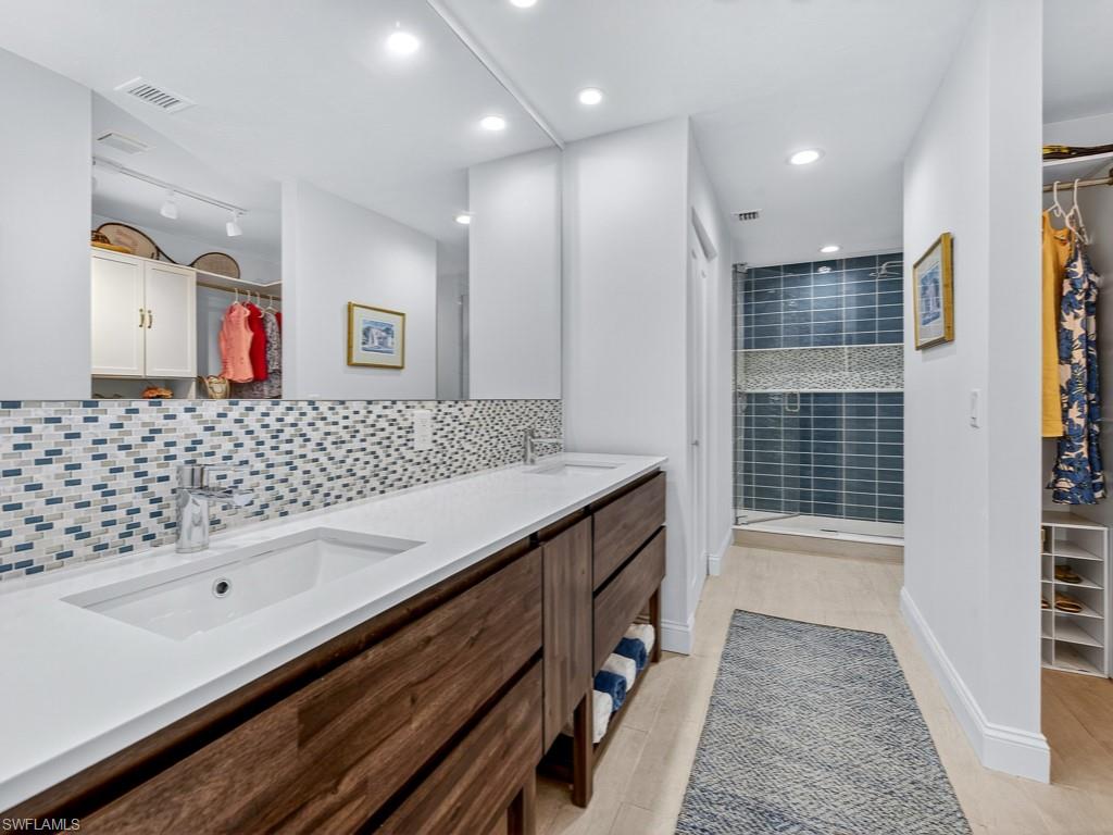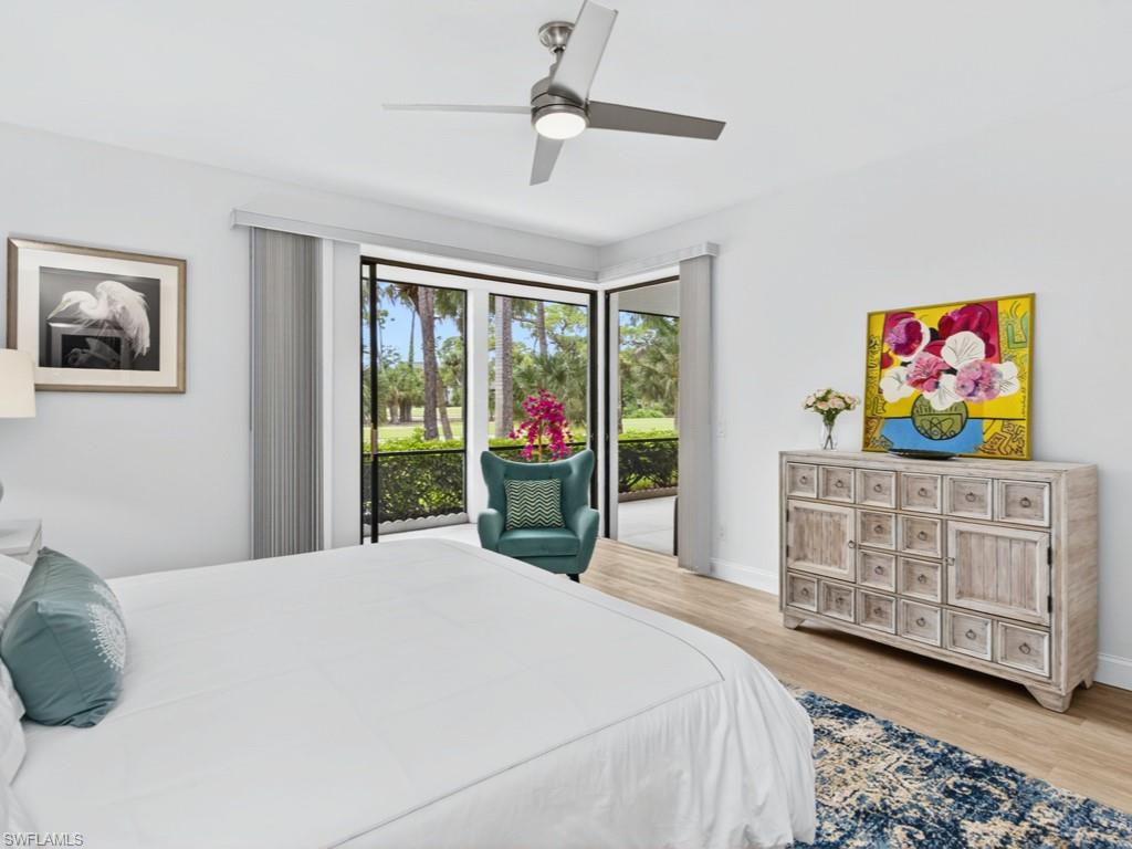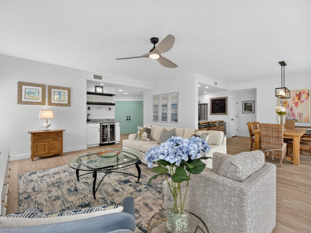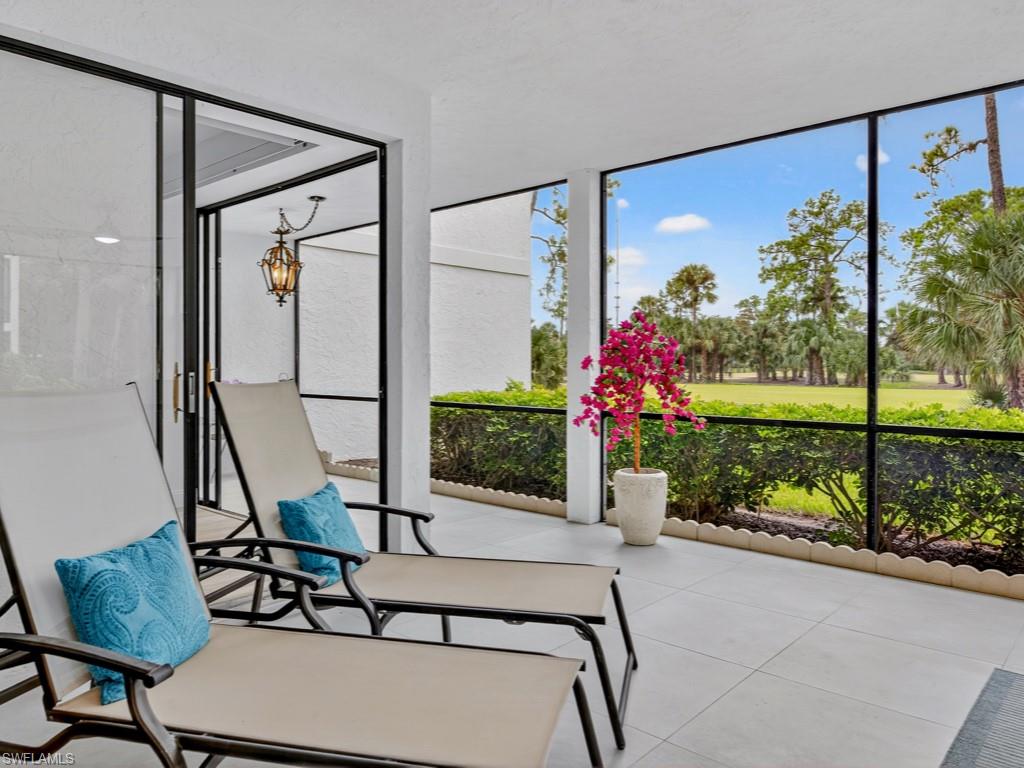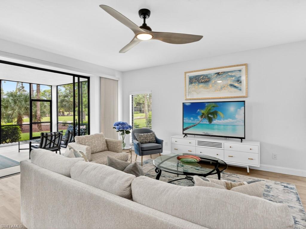IMMEDIATE GOLF MEMBERSHIP AVAILABLE | TURNKEY | RENOVATED SHOWSTOPPER! Experience the best of Naples living in this 3 BR, 3 BA (all en-suite) residence in Eagle Creek Golf & Country Club. Nearly 2,000 SF of open living blends effortless style with everyday comfort—lives like a single-family home. Thoughtfully renovated with quality finishes, stylish furnishings, and updated systems throughout. Primary suite and second master suite feature custom closets, designer walk-in showers showcasing custom glass and mosaic stone, DBL sinks, quartz tops. The third bedroom—a sun-filled guest suite—includes a gorgeous designer bathroom highlighting Merola porcelain floor tile and tub. A fabulous gourmet kitchen shines with quartz countertops, imported aqua tile backsplash, and stainless appliances, while a custom wet bar with Brazilian granite and dual-zone beverage fridge elevates entertaining. Step out to an expansive 500 sf screened lanai showcasing a 20-ft opening with brand-new, storm impact sliders (California-style), 30 x 30 Arctic-white porcelain tile, all-new screening—framing spectacular golf-course views of the coveted 4th hole. Additional highlights: newer A/C, designer lighting & hardware, abundant storage (separate outdoor storage), and covered parking. Enjoy resort-style amenities—NEW clubhouse for dining & entertainment, pickleball, tennis, bocce, pool, fitness center, and yoga studio—minutes to Naples beaches, Olde Naples, and Marco Island. Social or Golf Membership required.