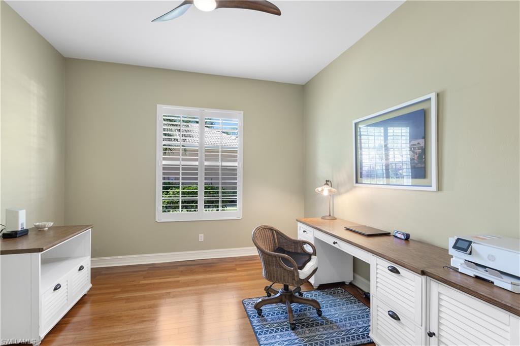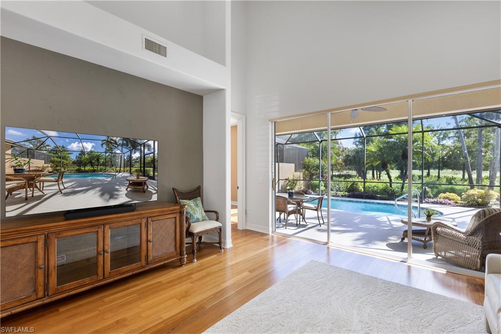 It has been over 4 years since the rarely available, & largest floor plan Villa in Grandezza’s Saraceno section such as this has been offered for sale. Enjoy over 2500 square feet of luxury with many highlights & features such as lovely golf & tropical views, a heated pool, attractive wood flooring throughout, desirable front entry w/etched glass door, plantation shutters, 3 Br + Loft/Den on 2nd floor + a 2nd floor suite w/balcony perfect for your guests, 3 full baths, ample storage including cabinets & racks in garage & custom closets in main bedroom, sunseen screening on lanai sliders & front door, + plenty of updated features : the kitchen has newer Quartz Counter tops & appliances including refrigerator (2024) , New A/C (2025), Water Heater (2022), Kevlar storm screens across lanai (2024) + clear custom fitted shutters , Pool resurfaced + equipment (2022) , Pool Heater (2022) and Roof (2019) + if bad storms come, Saraceno is on the same power grid as the Hertz Arena across the street from Grandezza, thus power rarely goes off. The community has year-round, active social activities , a 53,000 sq. ft. clubhouse, championship golf not mandatory to join, & is in one of SW Florida’s prime locations near malls, shopping centers, FGCU, hotels, Restaurants, the airport & more to come!