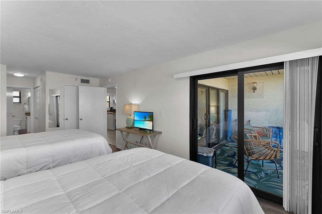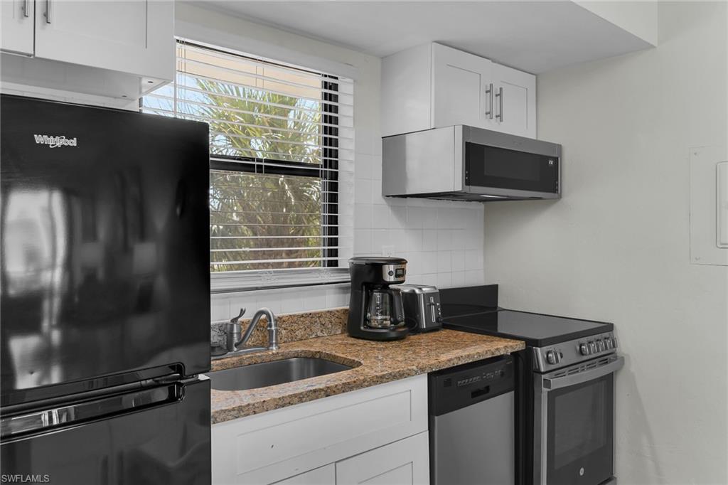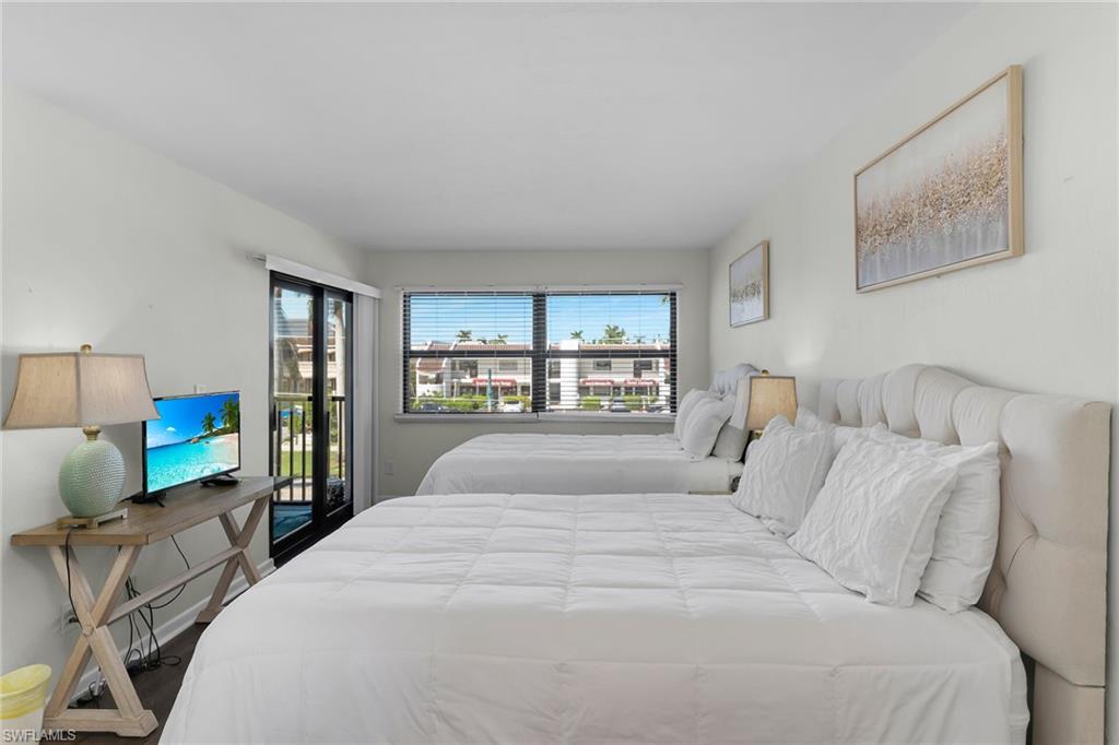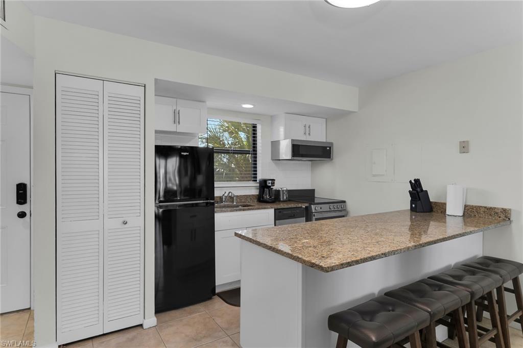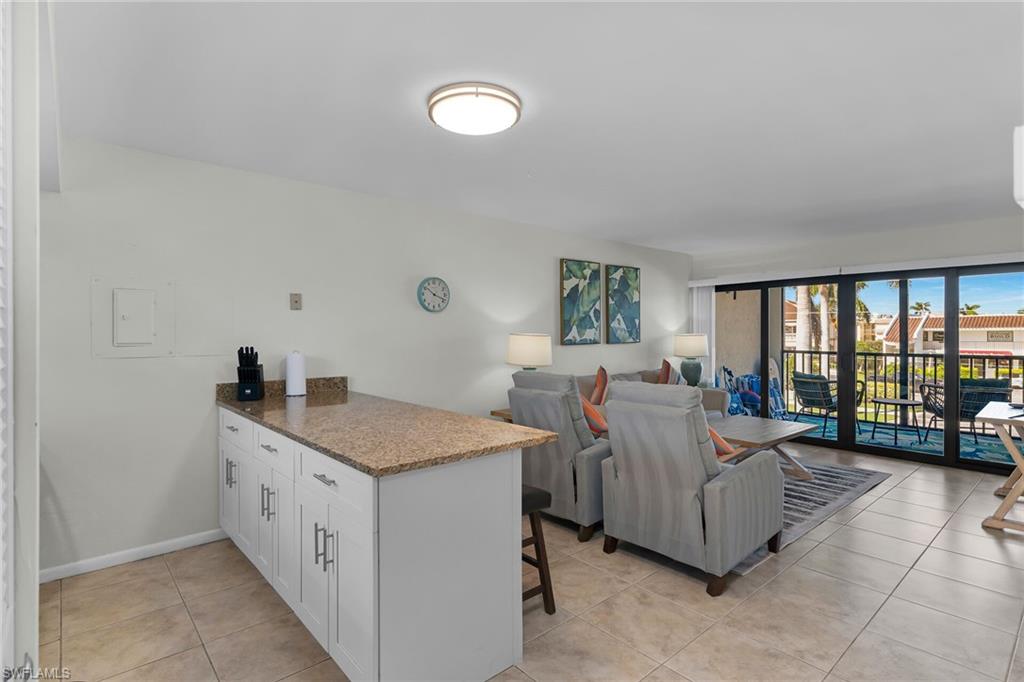 Anglers Cove condo with sunny west exposure. All new hurricane rates doors and windows already permitted and installed in 2024 for maximum protection. Great investment condo with weekly rentals allowed and electric included in condo fee. Anglers Cove is a waterfront resort style community with boat docks available for leasing and is direct Gulf access. Along with 2 huge pools 2 hot tubs, 2 tennis courts. Walk into a beautiful open floor plan with functional kitchen with newer appliances, granite countertops, tiled backsplash, new shaker style cabinets and updated lighting. A kitchen island with stools, a perfect place to entertain while in the kitchen. Big master bedroom with 2 beds and a pull out couch in living room a great set up for family and or a rental unit. A lanai to sit on to enjoy the tropical Florida air and watch the world go by. This condo is sold turnkey furnished for a convenience. Don't wait to make this your new Florida home!
