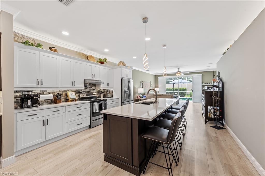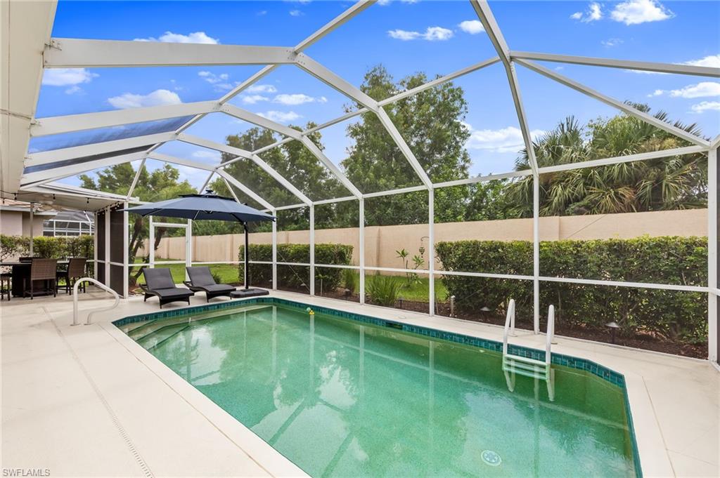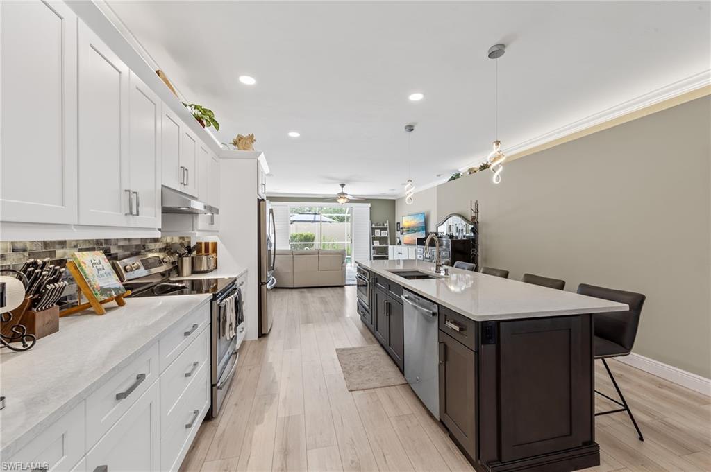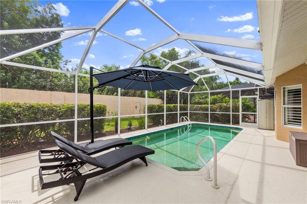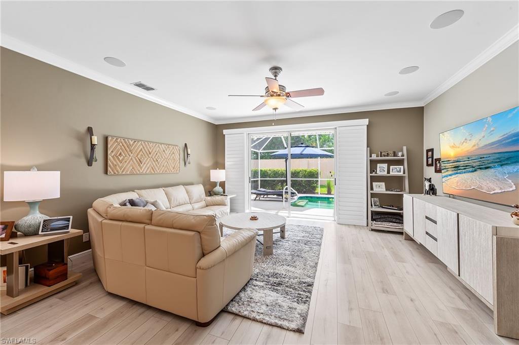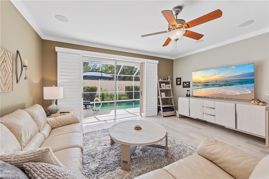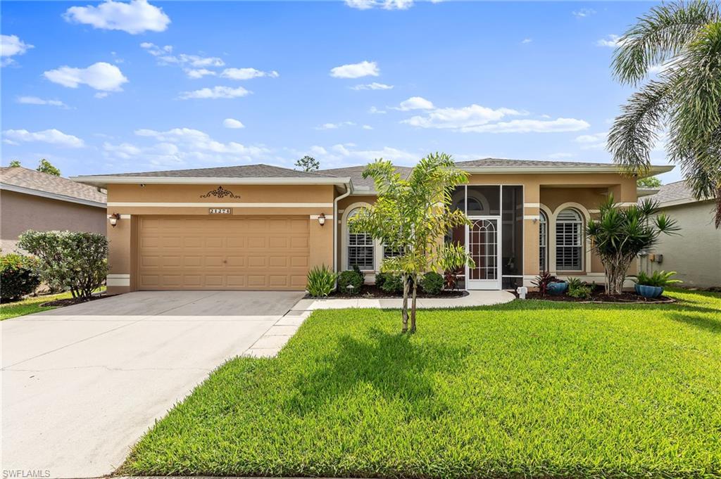 Completely updated and move-in ready, this 4 bedroom, 2 bath home features a spacious great room floor plan that blends comfort and style. The interior boasts luxury vinyl flooring in the main living areas, plush new carpet in the living room and bedrooms, custom crown moulding, tall baseboards, and plantation shutters throughout. A gourmet kitchen showcases custom cabinetry, solid surface quartz counters, and stainless steel appliances, all overlooking the family room and pool—perfect for entertaining family and guests. The outdoor living space is a highlight, with a solar-heated saltwater pool and a covered lanai ideal for dining or relaxing. The spacious primary suite offers a large walk-in closet with built-in cabinets and a stunning remodeled bathroom (2025) featuring a custom tile shower with seamless glass doors and a freestanding soaking tub. The guest bathroom has also been beautifully updated with a custom tiled shower, cabinetry, and sink. Additional updates include a new A/C (2024) and roof (2020), giving peace of mind for years to come. The front exterior has been refreshed with all-new landscaping, showcasing lush greenery, colorful plantings, and a thoughtfully designed layout that highlights the home’s inviting charm. This property combines modern upgrades with timeless features, creating a perfect place to call home. Stoneybrook amenities offer something for everyone! Enjoy access to an exercise room, 3 community pools, tennis courts, pickleball, volleyball, basketball, bocce ball, a playground, and even a baseball field. The public golf course means you can pay as you play—no membership required. Conveniently located near shopping, dining, I-75, FGCU, beaches, and RSW airport. You're just a short walk=drive to the golf clubhouse, CVS, Publix, Miromar Outlets, and Hertz Arena. With low association fees and a full range of amenities, it’s easy to see why Stoneybrook remains one of Estero’s most popular communities.