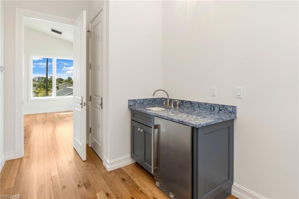 Located in Naples, Florida, just moments from the beach, this residence offers a rare fusion of Coastal Contemporary with Craftsman Influences, strength, and sophistication. Perfectly positioned near lush parks, boutique shopping, fine dining, and upscale entertainment, it promises a lifestyle at the very heart of it all. Built by a respected local builder recognized for meticulous craftsmanship, this one-of-a-kind residence is engineered to last. Constructed of solid concrete block and fully waterproofed from foundation to roof, this residence provides unmatched strength, security, and peace of mind, while its exterior—finished with durable concrete Hardie Board siding, impact-rated windows and doors, and a sleek standing seam aluminum roof—delivers enduring beauty, resilience, and unique coastal style. Sip morning coffee or evening cocktails from the welcoming front porch, or retreat to the private balcony where views of the Ritz-Carlton and the shimmering beachside skyline create a breathtaking backdrop. This is not simply a home — it is a statement of quality, artistry, and coastal luxury.