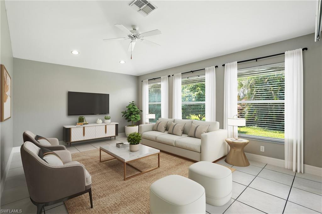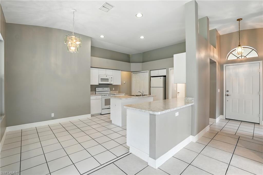 Welcome to Fountain Lakes! This beautifully updated single-family home in the heart of Estero offers 3 bedrooms, 2 full bathrooms, and an open floor plan with vaulted ceilings, creating a bright and spacious living area. The home features new luxury vinyl and tile flooring, fresh interior paint, and brand-new countertops, making it move-in ready. The newer roof (2021) provides peace of mind, while the modern updates throughout add both style and comfort. The open design flows seamlessly from the kitchen to the living and dining areas—perfect for entertaining or relaxing with family. Located in the highly desirable community of Fountain Lakes, residents enjoy low HOA fees and a lifestyle centered around a public golf course. The community is just minutes away from Coconut Point Mall, Miromar Outlets, I-75, and RSW Airport, offering unmatched convenience to shopping, dining, and travel.
