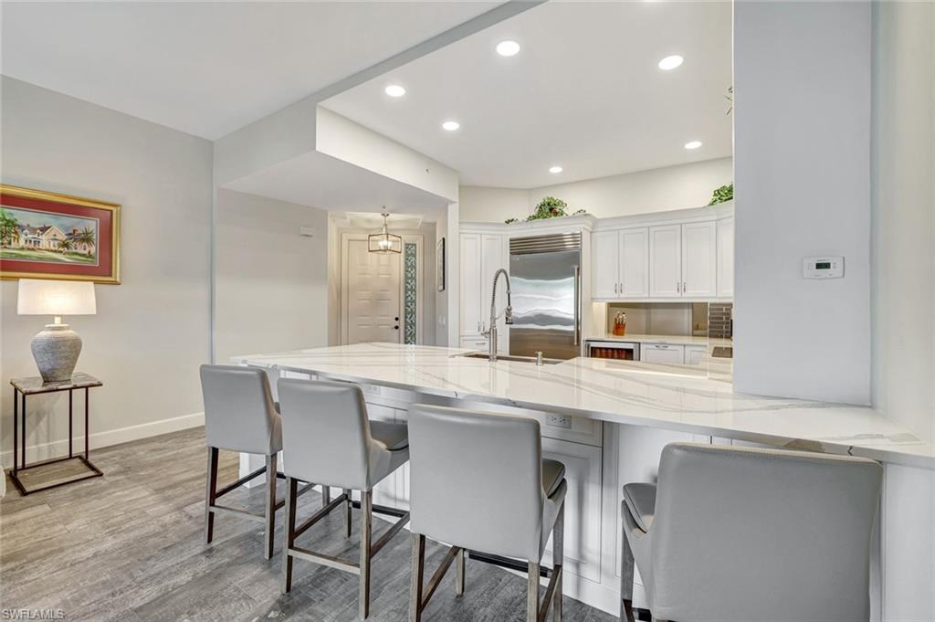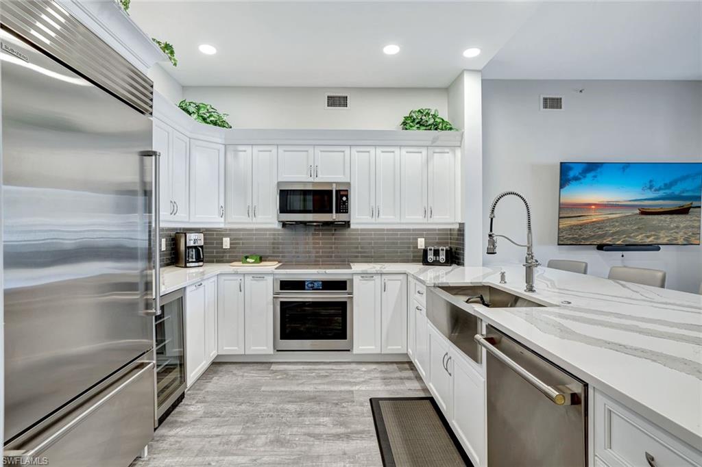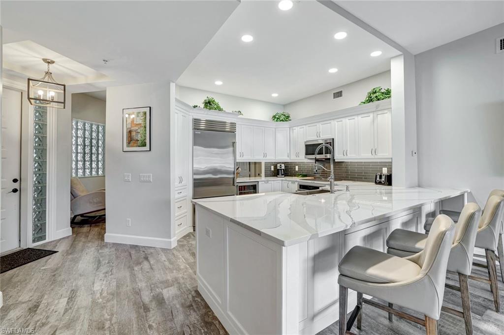 This COMPLETELY RENOVATED residence in the prestigious Pelican Bay community of Breakwater offers the ultimate in luxury coastal living. Thoughtfully redesigned with HIGH-END finishes throughout, including custom cabinetry, luxury flooring, designer tile, and stunning countertops, no expense was spared. The kitchen and living spaces are outfitted with state-of-the-art appliances, blending style and function seamlessly. Bright, open, and coastal, this home is move-in ready for its new owner. The sought-after floor plan features 3 bedrooms + den, 2 baths, high ceilings, an oversized 2-car garage, and convenient elevator access. Enjoy sparkling long lake views from the oversized lanai, perfect for relaxing or entertaining. Breakwater has also been beautifully updated with new roofs, exterior painting, lighting, and signage, along with a fully renovated clubhouse featuring a heated resort-style pool, spa, fitness room, and professional on-site management. This PET-FRIENDLY community with no weight restrictions is one of the most welcoming in Pelican Bay. Living in Pelican Bay means world-class amenities at your doorstep: private beach access with beachfront dining, beach attendants, sailboats and kayaks, a top-tier fitness center, a lakeside wellness studio/spa, two tennis facilities, and pickleball courts coming soon. All just minutes from Waterside Shops, Mercato, and Artis–Naples. Come home to one of Naples’ most coveted communities and experience coastal living at its finest.