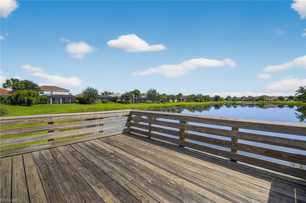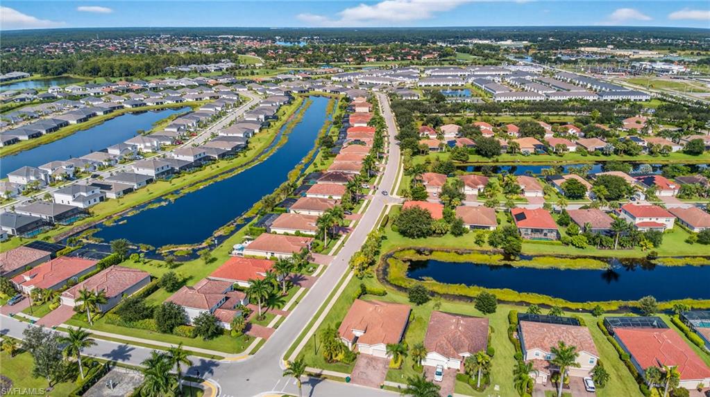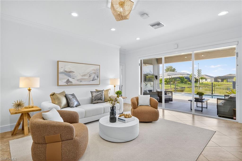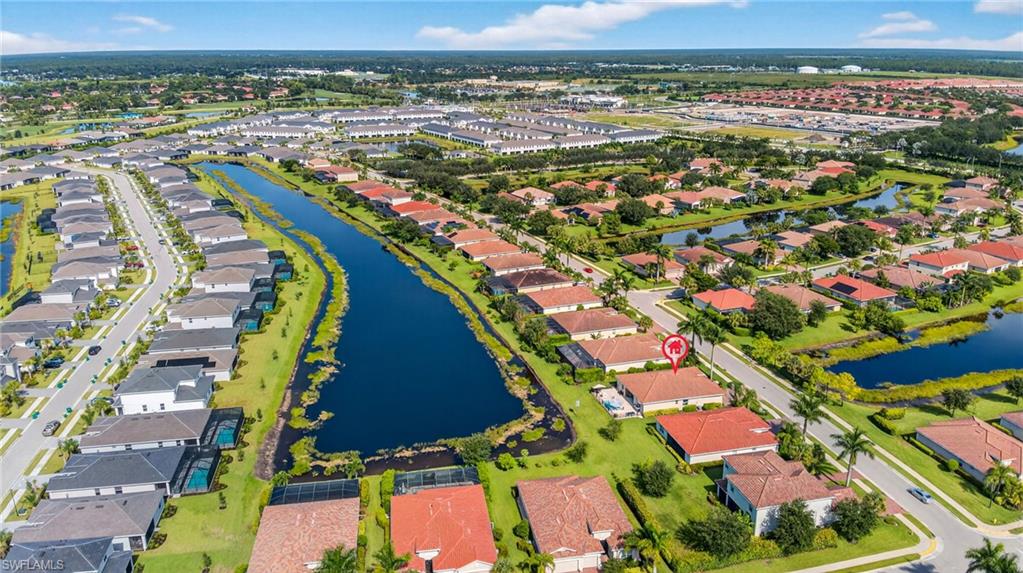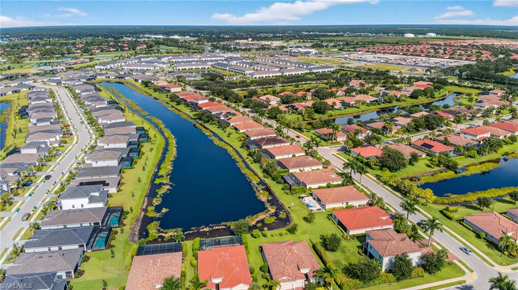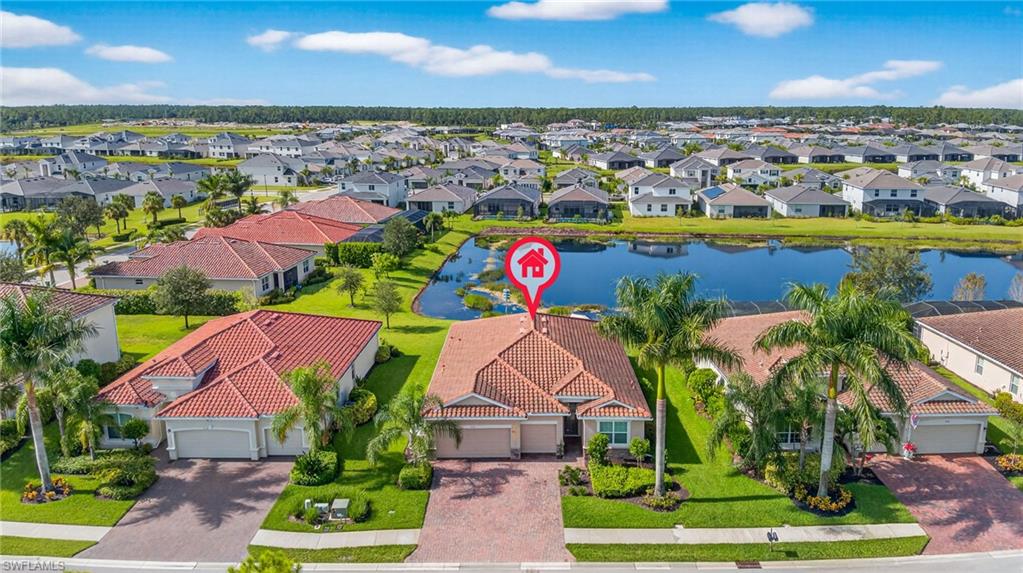 Step inside and enjoy a thoughtful layout where natural light and southern exposure lead to sweeping water views. This four-bedroom, three-bath Tivoli model with a three-car garage—built in 2019—blends open living with private retreat in the heart of The Groves At Orange Blossom Ranch. Step inside and enjoy a thoughtful layout where natural light leads to sweeping water views. The great room flows into a gourmet kitchen with quartzite countertops, stainless steel finishes, a wine fridge built into the island, and a breakfast nook. A formal dining room with crown molding and a stunning lanai set the stage for elegant evenings and peaceful mornings. Crown molding continues into the living room and owner’s suite, adding timeless detail. The primary suite itself features a spa-like bath with dual vanities, soaking tub, and separate shower, plus a custom California Closet for organization. Three additional bedrooms—each with water views—offer comfort for family and guests. Details elevate this home: tile flooring in the kitchen, dining, entry, and living areas, laminate wood in the bedrooms, and a custom built-in media wall for your TV. A water filtration system with conditioner and UV light, a whole-house generator with underground propane tank, and a newer AC and water heater (2019) ensure peace of mind. Tech-savvy touches include smart-home features with touch-sensitive light switches, a smart LED mirror, a cell phone/WiFi booster, a Ring doorbell, plus five separate exterior cameras with DVR for added security. Overhead garage storage racks provide practical convenience. Outdoors, enjoy your very own private “Spool”—a unique combination of pool and spa with a sun shelf perfect for lounging. Even the backyard is special, featuring an HOA-approved Purple Martin nest for seasonal charm. Life in The Groves At Orange Blossom Ranch is equally rewarding, with resort-style amenities: two pools, spas, tennis, basketball, sand volleyball, a fishing pier, playgrounds, splash pad, and a clubhouse for gathering. With low HOA fees, no CDD, and top-rated schools nearby, the setting is as practical as it is inspiring. This is more than a residence—it’s a rare opportunity to live with ease, elegance, and innovation, waking each day to water views and a lifestyle where luxury feels effortless.