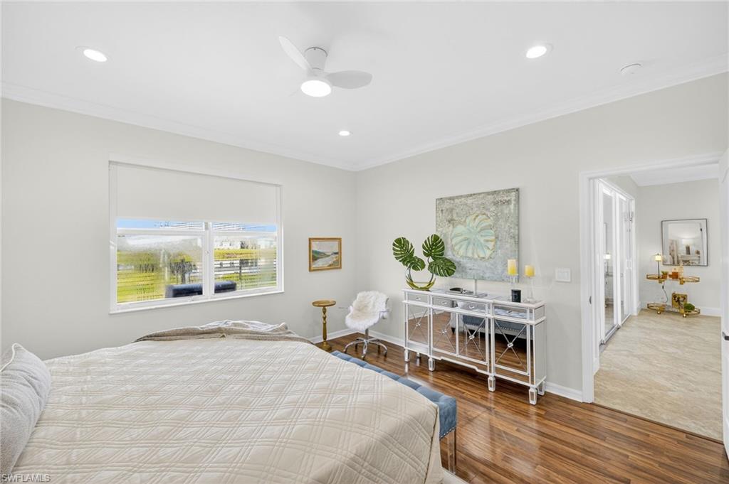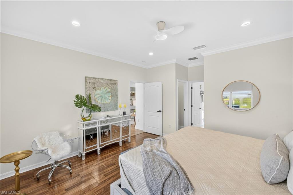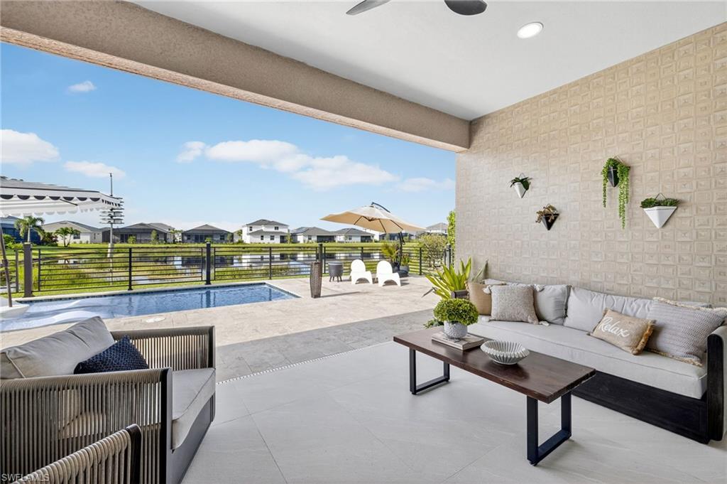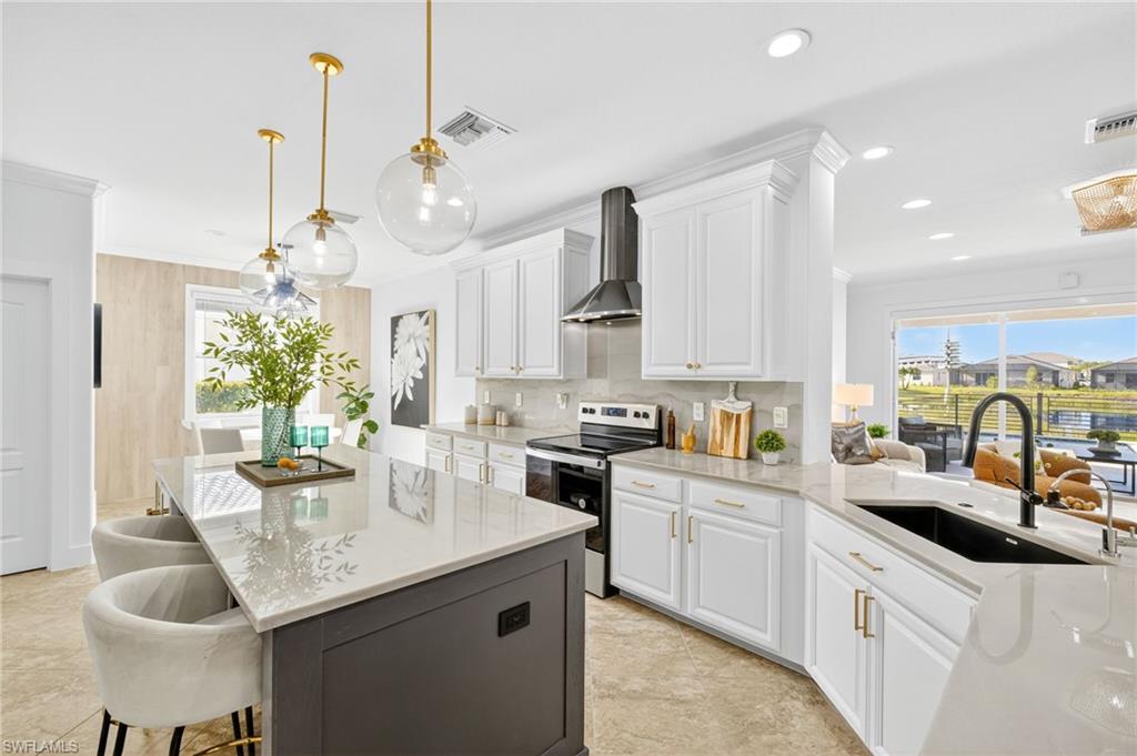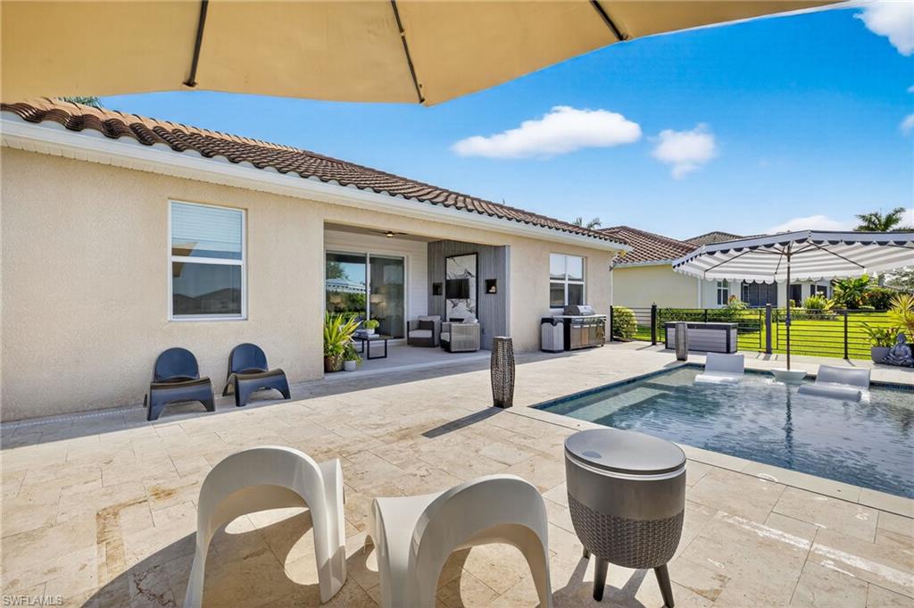 Step inside and enjoy a thoughtful layout where natural light and southern exposure lead to sweeping water views. This four-bedroom, three-bath Tivoli model with a three-car garage—built in 2019—blends open living with private retreat in the heart of The Groves At Orange Blossom Ranch. Step inside and enjoy a thoughtful layout where natural light leads to sweeping water views. The great room flows into a gourmet kitchen with quartzite countertops, stainless steel finishes, a wine fridge built into the island, and a breakfast nook. A formal dining room with crown molding and a stunning lanai set the stage for elegant evenings and peaceful mornings. Crown molding continues into the living room and owner’s suite, adding timeless detail. The primary suite itself features a spa-like bath with dual vanities, soaking tub, and separate shower, plus a custom California Closet for organization. Three additional bedrooms—each with water views—offer comfort for family and guests. Details elevate this home: tile flooring in the kitchen, dining, entry, and living areas, laminate wood in the bedrooms, and a custom built-in media wall for your TV. A water filtration system with conditioner and UV light, a whole-house generator with underground propane tank, and a newer AC and water heater (2019) ensure peace of mind. Tech-savvy touches include smart-home features with touch-sensitive light switches, a smart LED mirror, a cell phone/WiFi booster, a Ring doorbell, plus five separate exterior cameras with DVR for added security. Overhead garage storage racks provide practical convenience. Outdoors, enjoy your very own private “Spool”—a unique combination of pool and spa with a sun shelf perfect for lounging. Even the backyard is special, featuring an HOA-approved Purple Martin nest for seasonal charm. Life in The Groves At Orange Blossom Ranch is equally rewarding, with resort-style amenities: two pools, spas, tennis, basketball, sand volleyball, a fishing pier, playgrounds, splash pad, and a clubhouse for gathering. With low HOA fees, no CDD, and top-rated schools nearby, the setting is as practical as it is inspiring. This is more than a residence—it’s a rare opportunity to live with ease, elegance, and innovation, waking each day to water views and a lifestyle where luxury feels effortless.