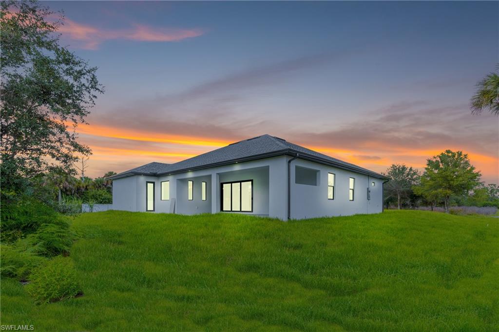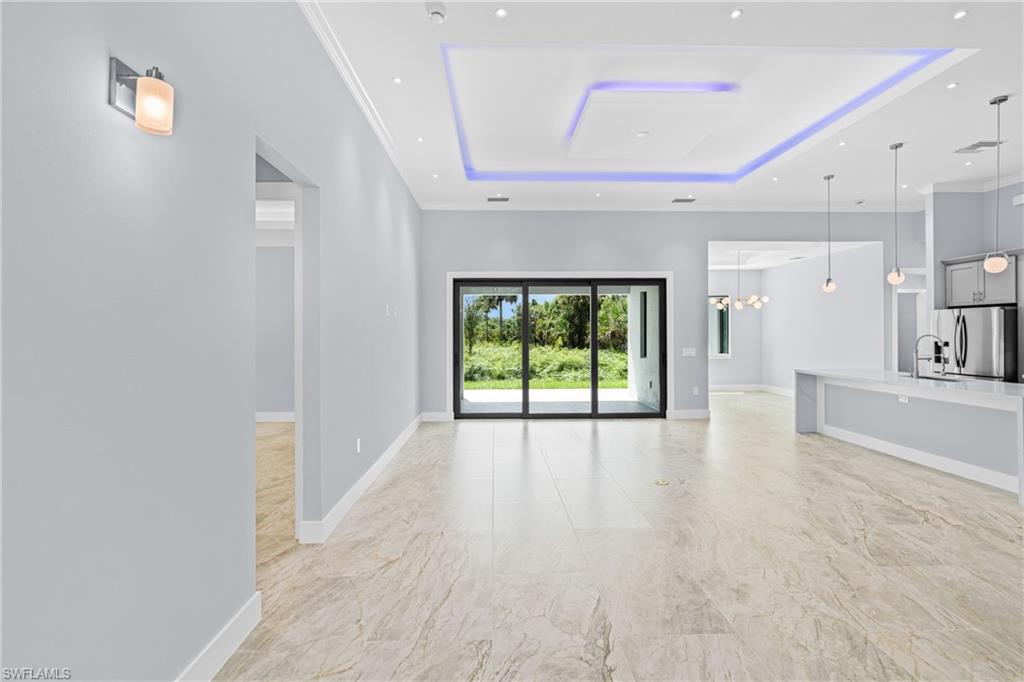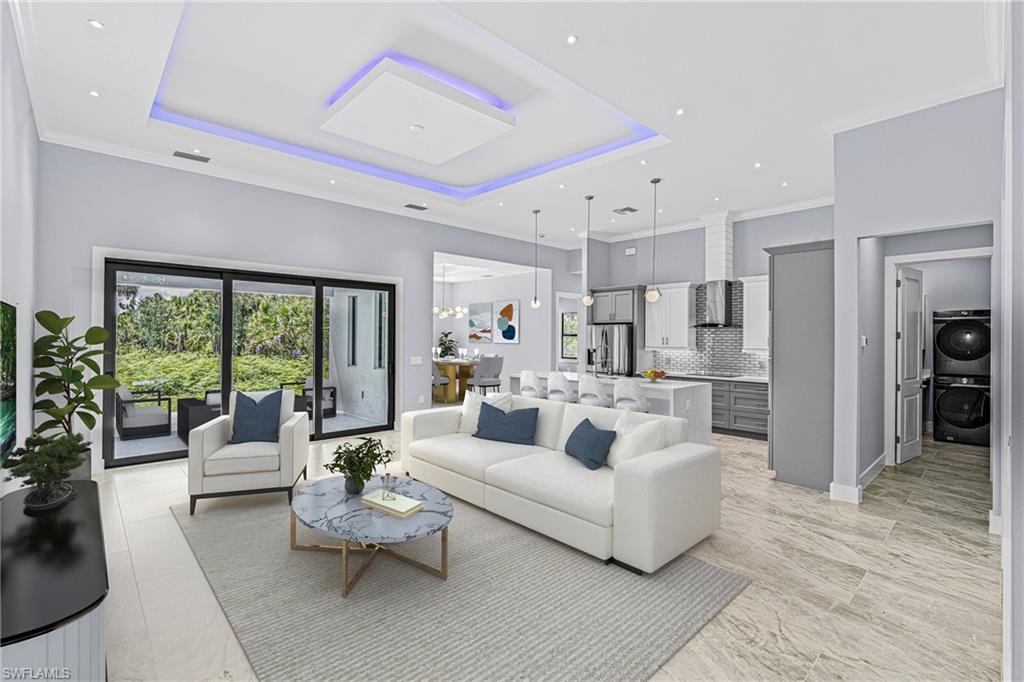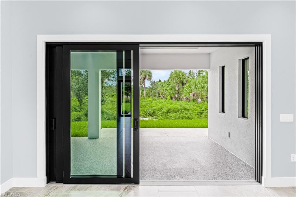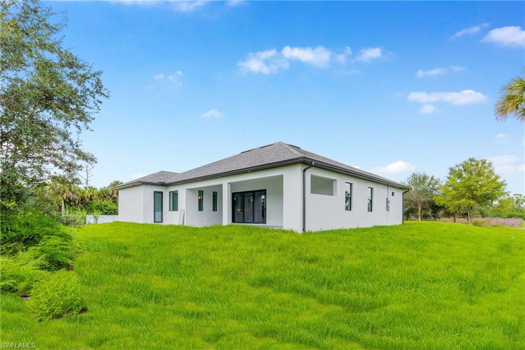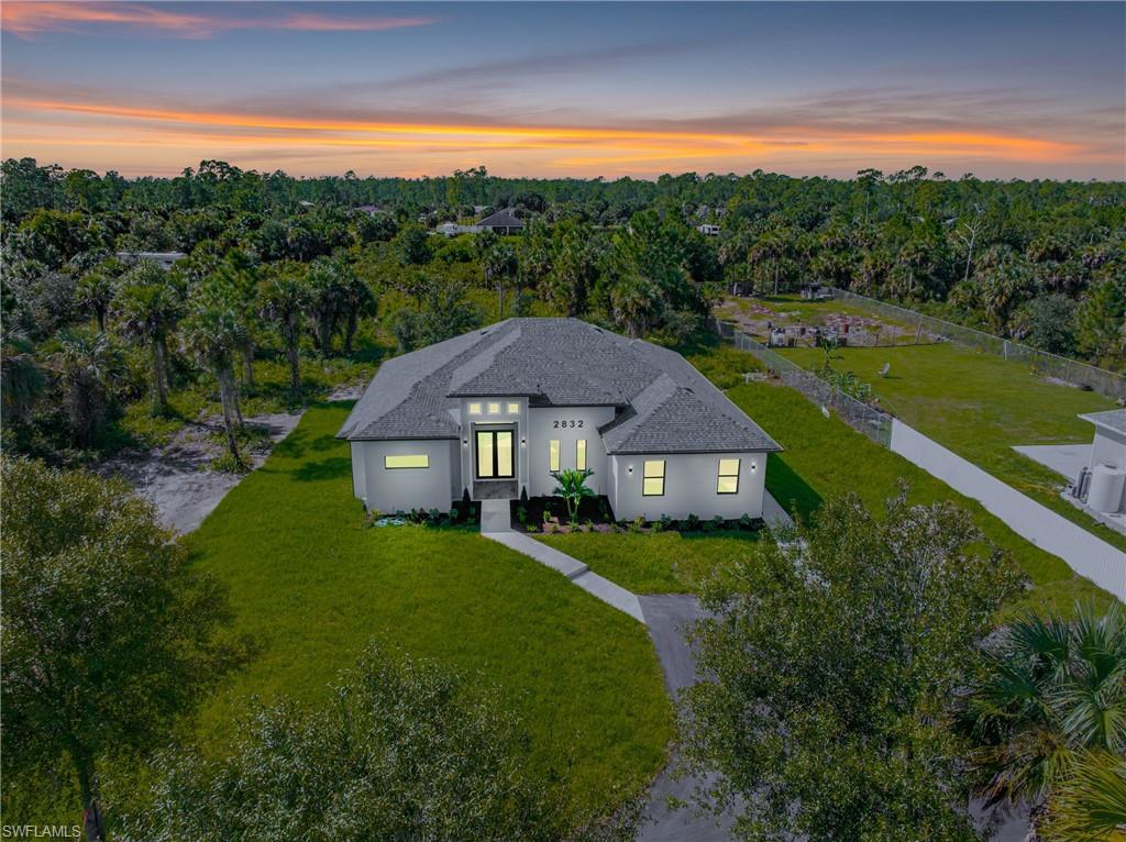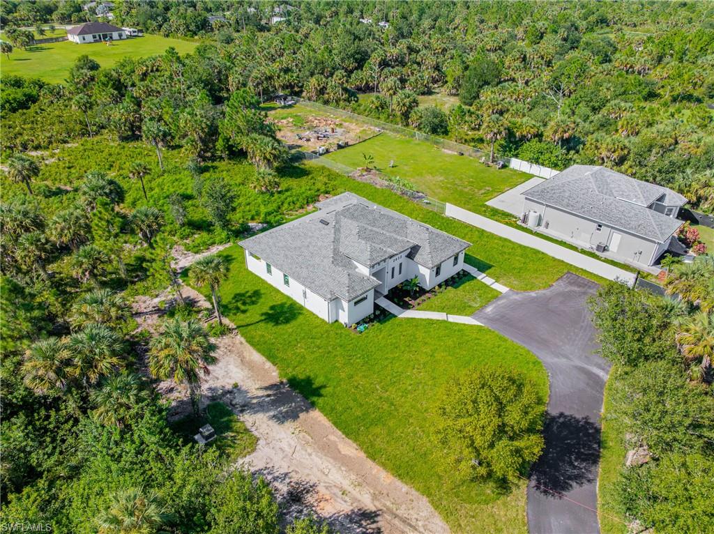 Nestled on 2.27 acres in the highly desirable Golden Gate Estates neighborhood, this exquisite property offers unparalleled privacy thanks to a wide 12-foot by 370-foot-long driveway. The exterior features decorative lighting, full gutters with underground drainage, and lush natural landscaping. Step inside to discover a thoughtfully designed interior boasting high-end finishes throughout, including elegant porcelain floors, impact-resistant windows and doors, and high ceilings with tray and coffered ceiling details. The home is equipped with a whole-house surge protector, two A/C units with smart thermostats, smart LED lighting, and a reverse osmosis water system. The main residence features 3 spacious bedrooms with modern lighting and generous walk-in closets, and 3 luxurious bathrooms — one with access; perfect for a future pool. The primary suite offers a bathroom with dual vanities and a beautifully designed shower. All bathrooms include LED mirrors and high-quality glass doors. The expansive living and dining areas flow seamlessly, with a den offering a serene front-facing view — perfect for a home office. The laundry room is ideally located inside the home and comes fully equipped with a "Washer and Dryer". A chef’s dream, the kitchen features custom wood cabinetry, quartz countertops with a stunning waterfall island, a mix of white and gray cabinetry, under cabinet lighting, and high-end built-in appliances including a wall-mounted oven/microwave and range hood. Enjoy the outdoors year-round in the oversized lanai, complete with a summer kitchen and wide sliding glass doors that open to expansive views of your private backyard. Additionally, this home includes a separate in-law suite, ideal for rental income or multi-generational living. It offers 1 bedroom with raised TV wiring, 1 full bath with LED mirror and elegant shower, a comfortable living space, and a fully equipped kitchen. Don't miss this opportunity to own a versatile, luxurious property in one of the most sought-after areas. Schedule your private showing today and experience all this home has to offer!