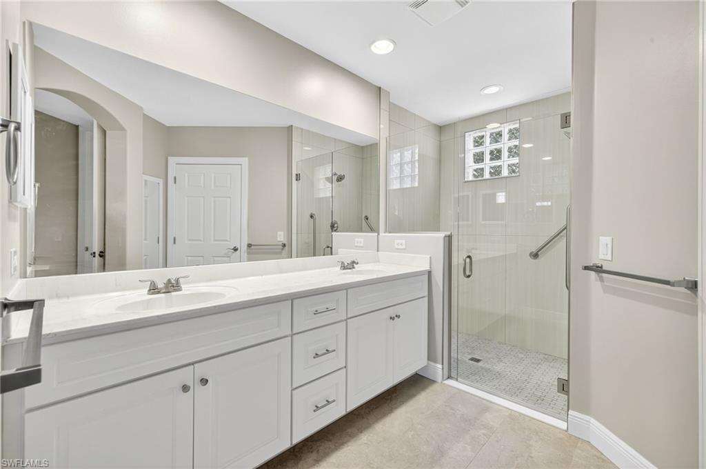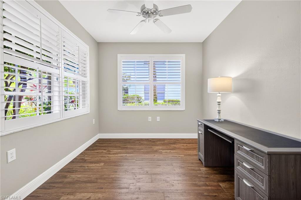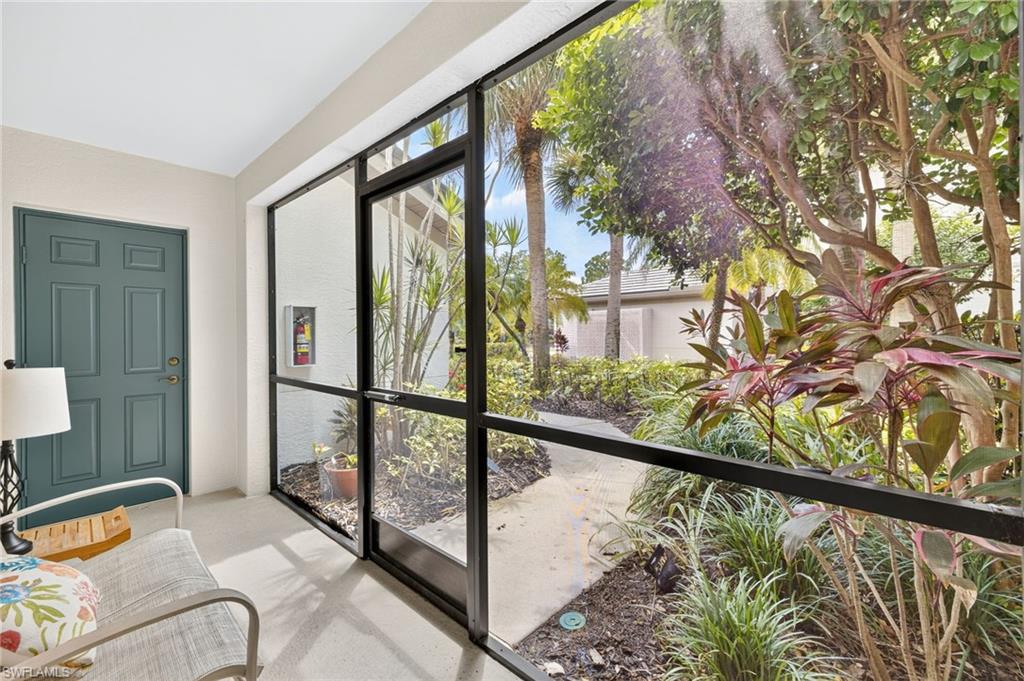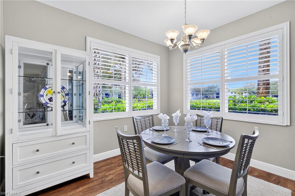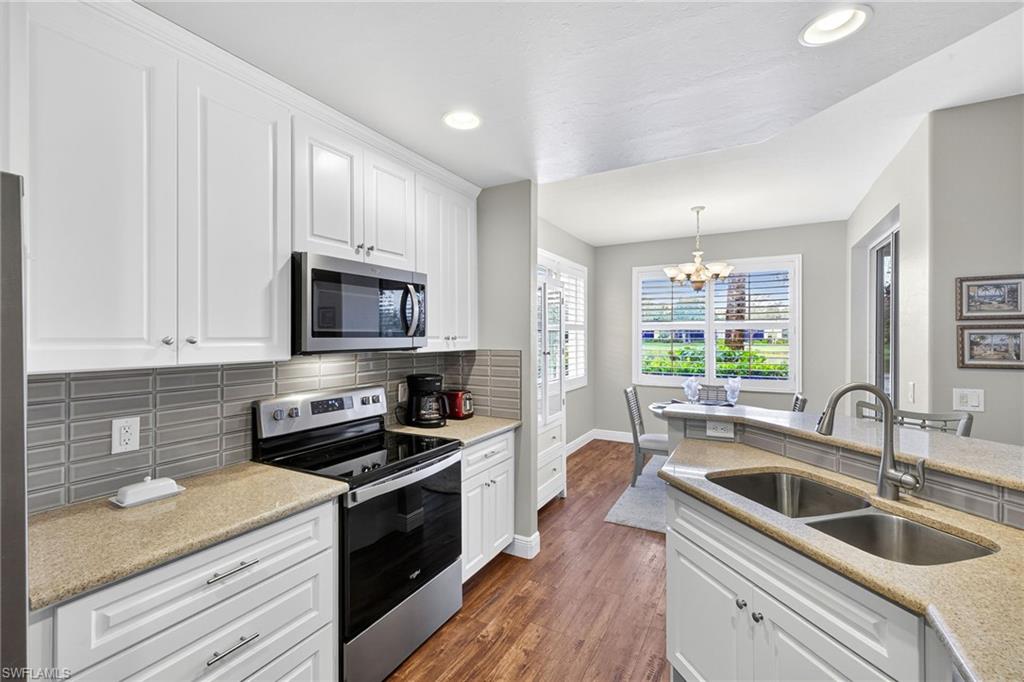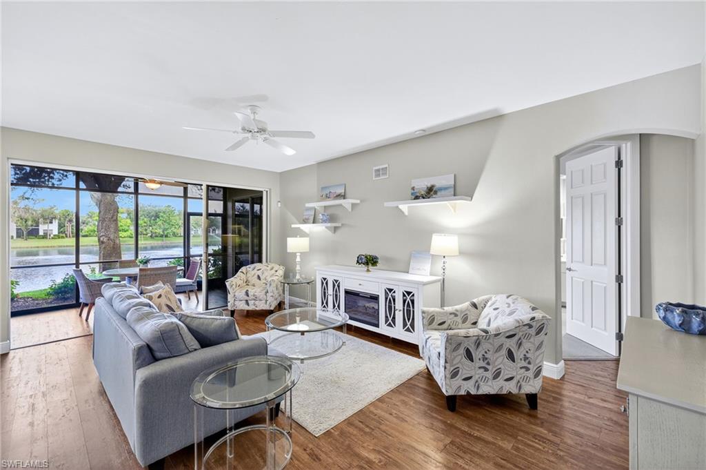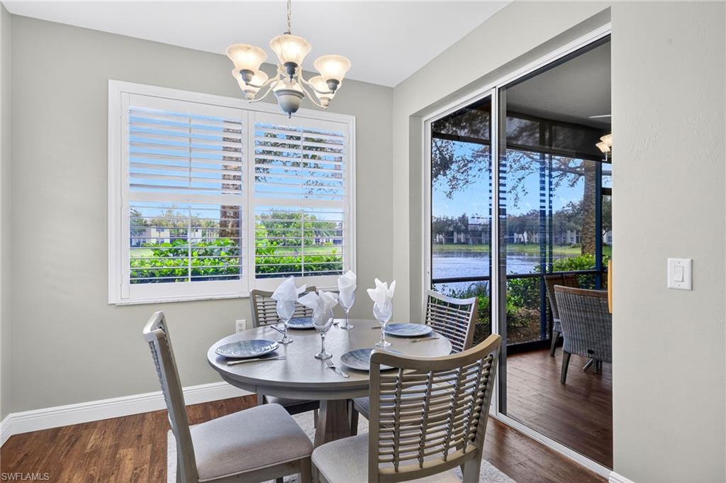 This lovely, first floor end unit coach home shows like new construction and is now available in southwest Florida's sought after bundled golf community, Pelican Sound. Featuring 2 bedrooms plus a den, and a one car garage, you will have room for friends, family, and your golf cart! Chic coastal furnishings and decor make this home so very inviting. It features plantation shutters throughout, LVP flooring that flows out onto the enclosed lanai, newer a/c, and tankless hot water heater. The updated kitchen offers 36" white cabinets, decorative backsplash, granite counters and Whirlpool Gold appliances. The primary suite features lanai access, a walk in closet, and updated bath with dual sinks and seamless shower door. Sip morning coffee or an evening beverage on the lanai, with sparkling lake views! Just move in and enjoy! If you are looking for an active lifestyle look no further: 27 holes of Championship golf, 14 pickleball, 8 tennis and 6 bocce courts. State of the art fitness center that is professionally staffed. Pelican Sound is nestled up to the Estero River with access to the Gulf. The community offers dry boat storage, kayaks, canoes and paddle boarding, along with a shuttle boat to Lovers Key State Beach Park. Minutes from RSW International airport and surrounded by fabulous shopping and restaurants. Start Living The Dream!
