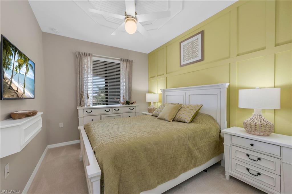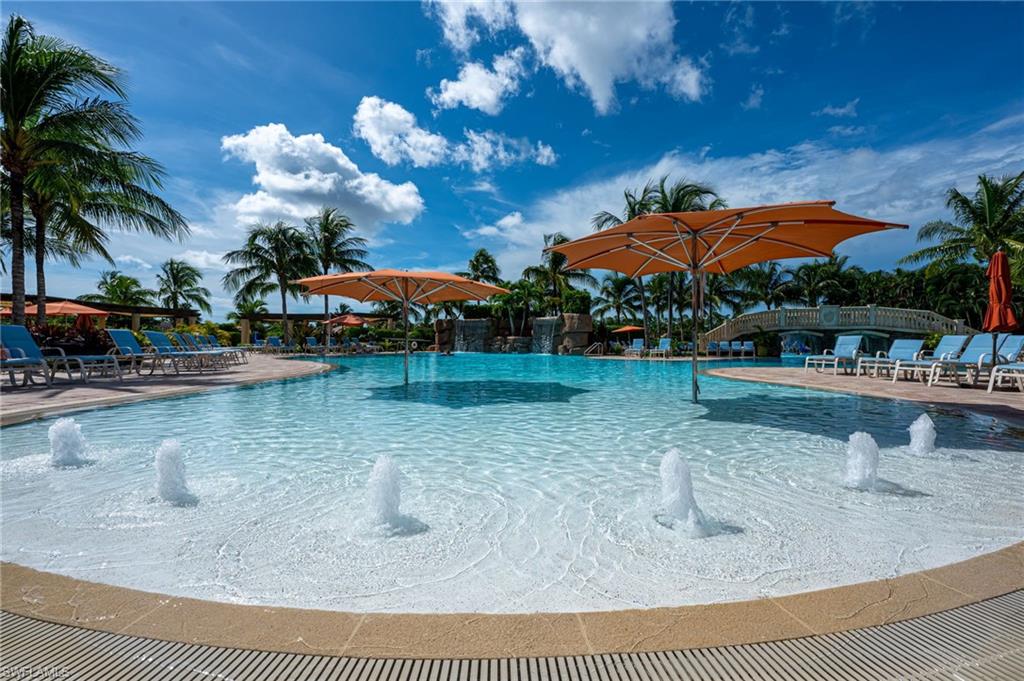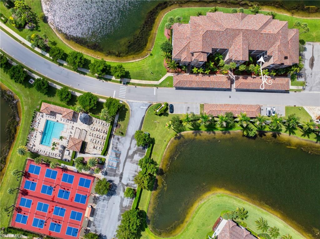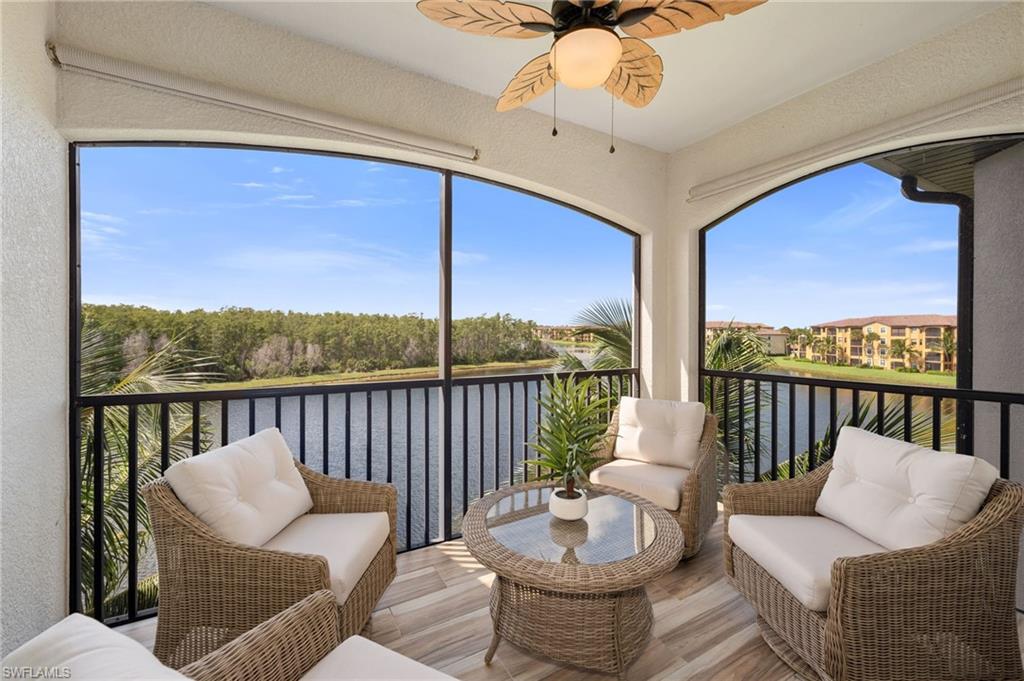 Stunning long lake views in Treviso Bay! This immaculate TOP-FLOOR BELLINI FLOOR PLAN offers a beautifully upgraded design with turnkey furnishings. The 2-bedroom, 2-bath plus FLEX ROOM layout showcases crown molding, custom built-in wall cabinetry with hidden big-screen TV, upgraded ceilings and lighting, plantation shutters, and a designer-tiled lanai for enjoying the best southwestern water views. The kitchen features stainless steel appliances, granite countertops, and breakfast bar seating. Additional perks include covered parking, extra storage, and no golf fees. Treviso Bay lives like a resort with first-class amenities: TPC golf course, clubhouse with fine dining, business center, library, social club, resort-style pools with waterfalls and bar & grill, lap pool, tennis, pickleball, bocce, fitness center, yoga studio, spa, sauna, and more. Just steps to a satellite pool, grilling area, and pickleball courts. Only 10 minutes to downtown Naples and beaches—Make this home your Florida home for the upcoming winter season!