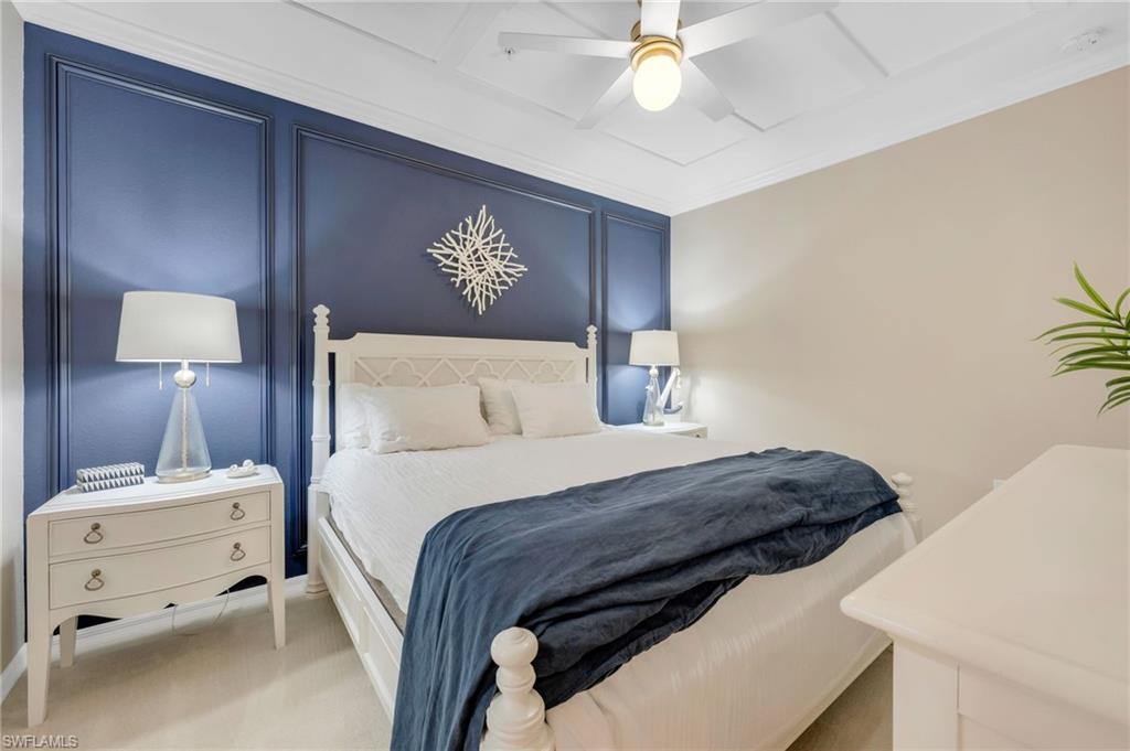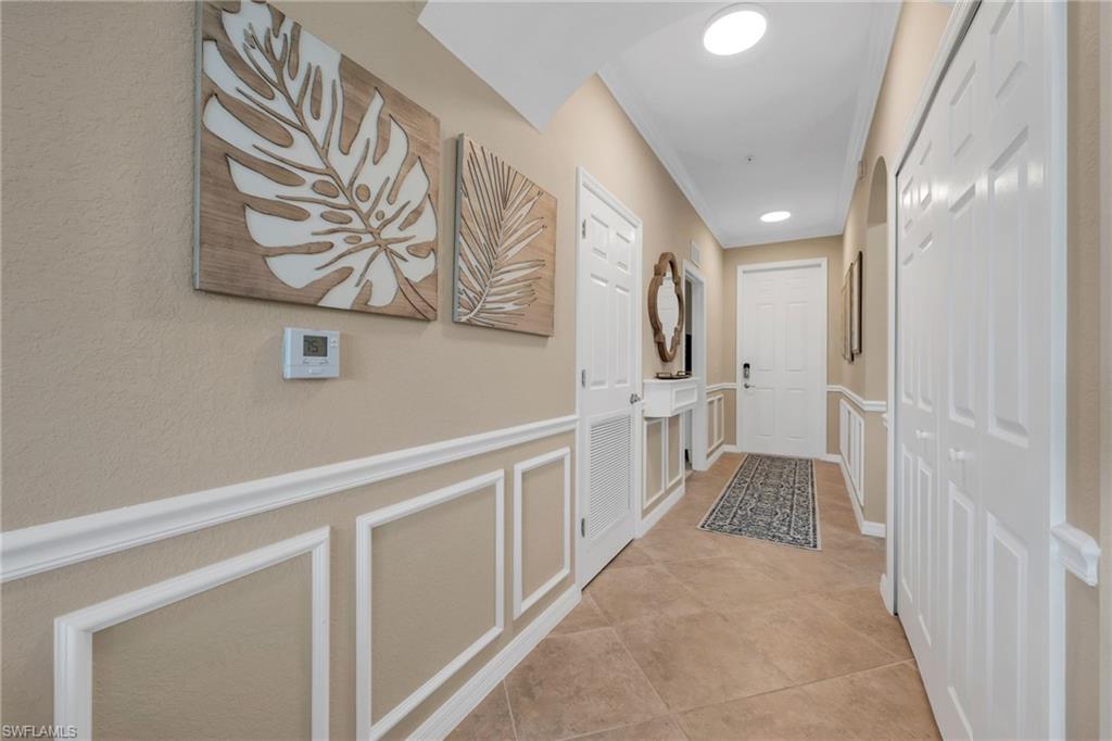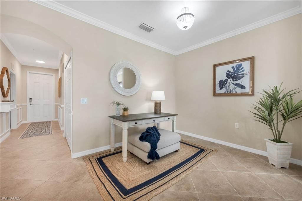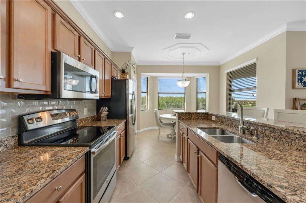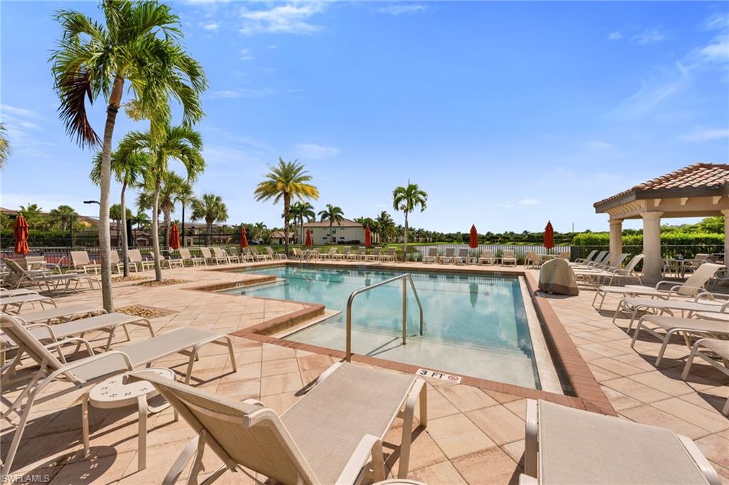 Stunning long lake views in Treviso Bay! This immaculate TOP-FLOOR BELLINI FLOOR PLAN offers a beautifully upgraded design with turnkey furnishings. The 2-bedroom, 2-bath plus FLEX ROOM layout showcases crown molding, custom built-in wall cabinetry with hidden big-screen TV, upgraded ceilings and lighting, plantation shutters, and a designer-tiled lanai for enjoying the best southwestern water views. The kitchen features stainless steel appliances, granite countertops, and breakfast bar seating. Additional perks include covered parking, extra storage, and no golf fees. Treviso Bay lives like a resort with first-class amenities: TPC golf course, clubhouse with fine dining, business center, library, social club, resort-style pools with waterfalls and bar & grill, lap pool, tennis, pickleball, bocce, fitness center, yoga studio, spa, sauna, and more. Just steps to a satellite pool, grilling area, and pickleball courts. Only 10 minutes to downtown Naples and beaches—Make this home your Florida home for the upcoming winter season!