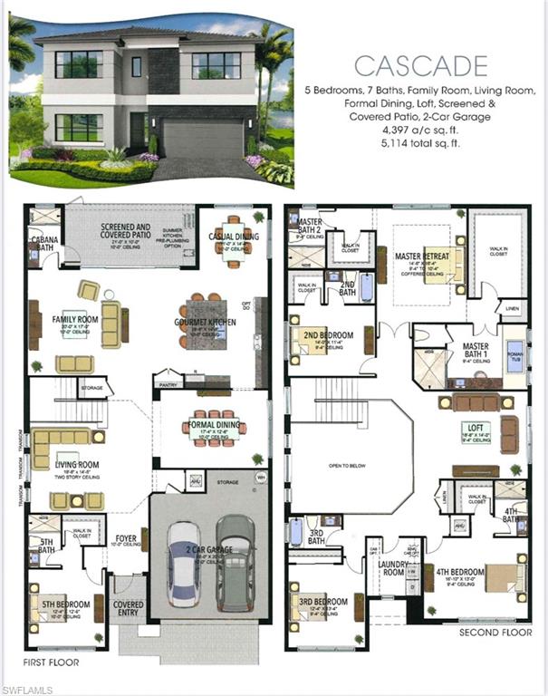 Take advantage of limited-time summer sales incentives on this stunning new construction home, scheduled for October/November delivery. The Cascade floor plan offers 5 bedrooms, 7 bathrooms, and a loft/flex space, with nearly 4,400 square feet of thoughtfully designed living space that balances luxury and functionality. The exterior makes a statement with its modern design, enhanced by cultured stone accents, glass entry doors, and an extended driveway. A lake view creates a serene backdrop, while the upgraded landscape package and space for a future pool complete the outdoor setting. Inside, the home features rectified 24x24 tile flooring throughout the main living areas, with soft carpet in the secondary bedrooms for added comfort. High ceilings and expansive windows fill the great room with natural light, drawing attention to the open-concept design that seamlessly connects the living, dining and entertaining. The primary suite is a private retreat, highlighted by a tray ceiling, generous walk-in closets, and a spa-like bath with dual vanities, a soaking tub, and a separate shower. Additional upgrades include fresh shoji white interior paint throughout, upgraded window coverings, and a pre-plumbed connection for a future laundry sink. Stet outside to the covered and screened lanai, where you can relax or entertain while enjoying peaceful lake views and the best of the Florida lifestyle. Every detail, from engineered hardwood touches to the upgraded finishes, has been thoughtfully considered in this home. Rivercreek provides the comfort of a gated community with resort-style amenities, including a clubhouse, pool, fitness center, and more. Ideally located near shopping. dining, and entertainment, with convenient access to I-75, SWFL International Airport, and the beautiful Gulf Coast beaches, this home offers the ultimate combination of style, comfort, and convenience. **Photos shown are of the model home and not the actual property**
