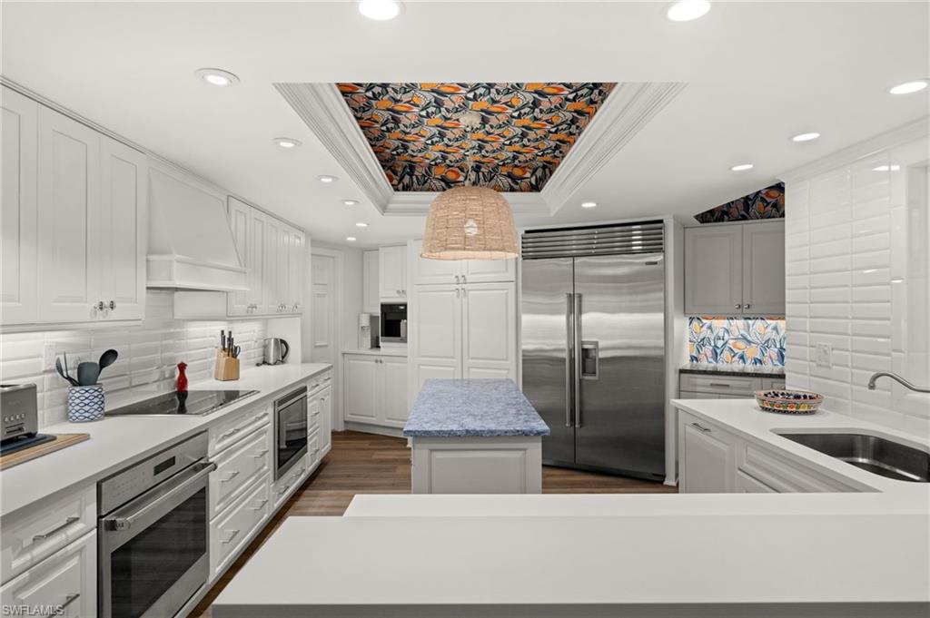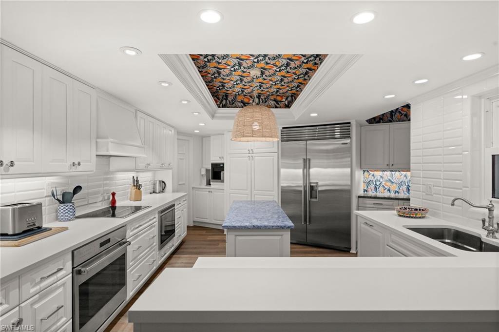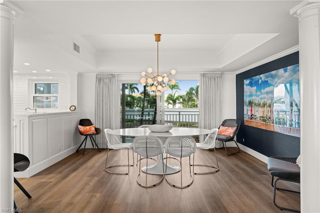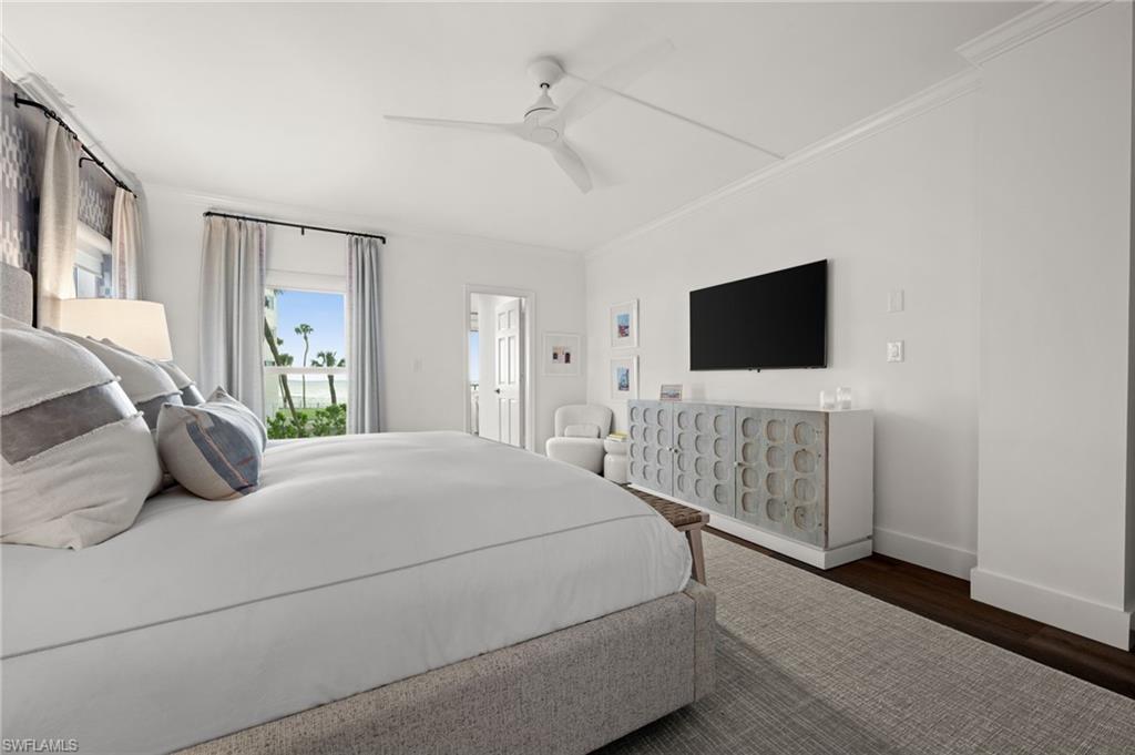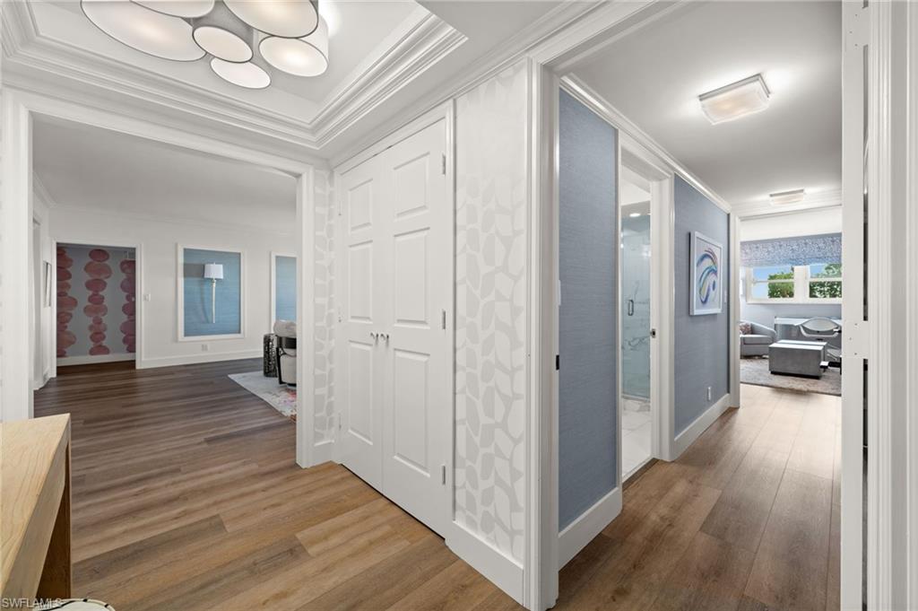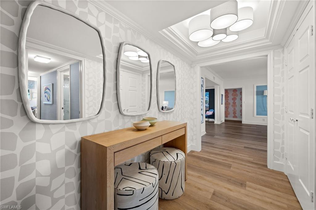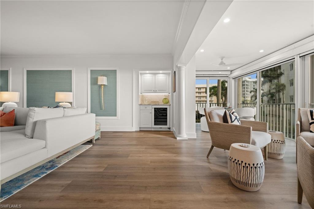 Luxury Beachfront Living at Westgate in The Moorings Experience coastal elegance in this fully renovated 3-bedroom, 4-bath residence located on the 2nd floor of the prestigious Westgate high-rise. This expansive home blends timeless finishes with modern conveniences, offering both Gulf-front tranquility and city-side vibrance. A magnificent 15 x 24 sunroom showcases sweeping western views of the Gulf of America, where shimmering waters and glowing sunsets create the perfect backdrop for evening cocktails or quiet mornings with a book. A private balcony on the eastern side provides a peaceful retreat to enjoy sunrise skies and soft breezes. Inside, every detail reflects luxury living—wood floors, crown molding, designer wallpaper, and granite countertops set the tone. The chef’s kitchen features Wolf appliances and custom cabinetry designed for both function and style. The primary suite is a private sanctuary with dual full baths, each featuring its own vanity space and one with an elegant uplit countertop. Additional highlights include impact-rated doors and windows, abundant storage, and thoughtful design throughout. Westgate residents enjoy a resort-style lifestyle with direct beach access, pool and spa, fitness center, community room, bike storage, EV charging station, on-site car wash, and designated storage for each residence. Whether joining neighbors at sunset happy hour on the beachside benches or savoring the quiet luxury of your private sunroom, this property offers the best of Naples’ coastal living. Easy to show so make your appointment today!