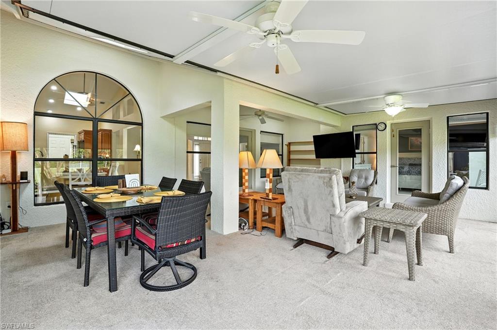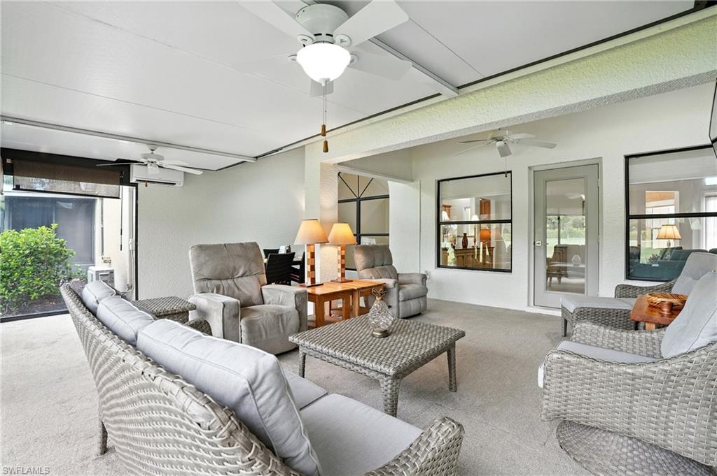 HOME WARRANTY BEING OFFERED TO BUYERS AT CLOSING! CHARTER GOLF MEMBERSHIP INCLUDED ($50,000 IN VALUE). BEAUTIFUL GOLF COURSE VIEWS (9TH GREEN) AND LAKE VIEWS! PROPERTY HAS ONE OF THE LARGEST Florida rooms IN HUNTERS RIDGE!! Welcome to your dream home in the highly sought-after gated community of Hunters Ridge Golf & Country Club! This beautifully maintained 2-bedroom plus den, 2-bathroom villa offers the perfect blend of comfort, style, and resort-style living. BRAND NEW AC UNIT (2025). Step inside to find a bright and open floor plan with high ceilings, neutral finishes, and abundant natural light throughout. The versatile den can easily serve as a home office, media room, or third sleeping space. The well-appointed kitchen features ample cabinetry, breakfast bar seating, and a cozy dining nook. The primary suite boasts dual closets and an en-suite bath with a walk-in shower and dual vanity. A split-bedroom layout offers added privacy for guests. Hunters Ridge Golf & Country Club is a private, non-bundled community with just 420 golf memberships—offering unmatched access to tee times and no Chelsea system. Located only 6 miles from Barefoot Beach, with quick access to shopping, dining, and RSW Airport. Enjoy an 18-hole championship golf course, golf simulators, resort-style pool with food & beverage service, tennis, pickleball, and both casual and fine dining at the clubhouse. A major renovation is underway, transforming the fitness center into a modern Community Center with expanded wellness amenities—bringing resort-style living to your doorstep.