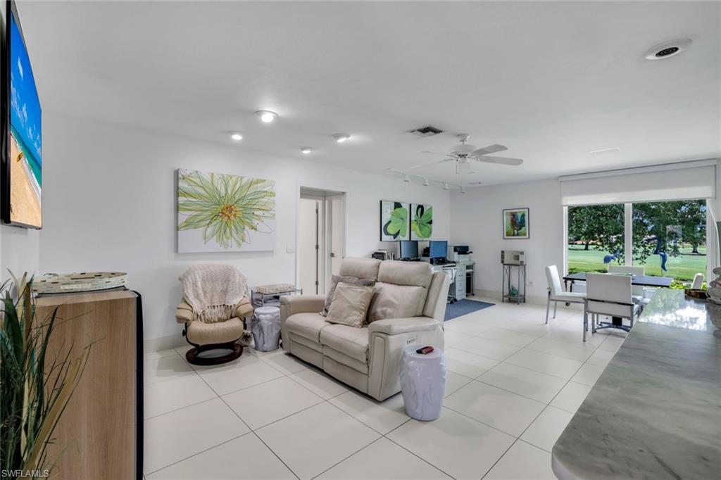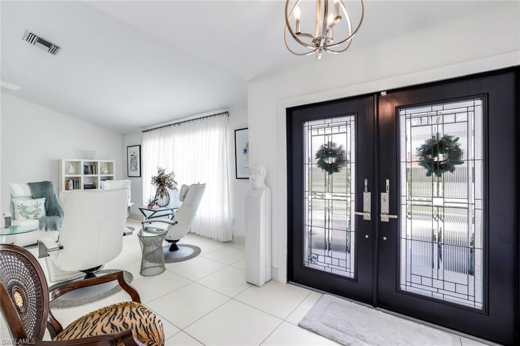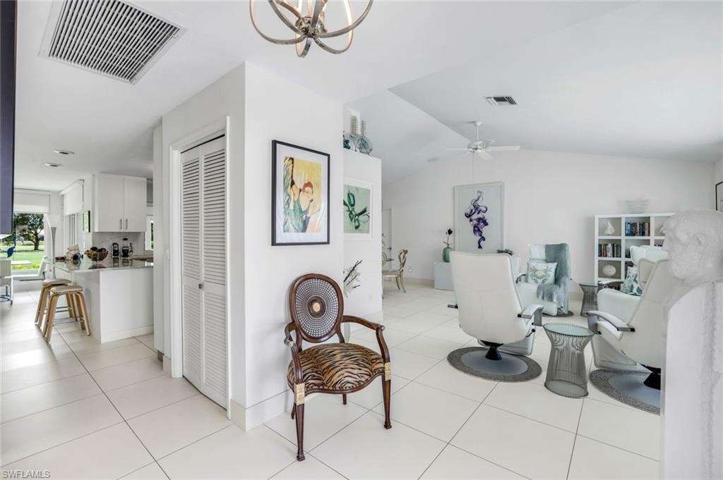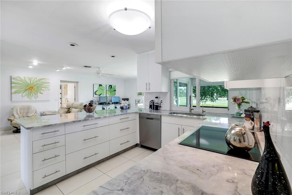 Beautifully updated 3-bed, 2-bath home on a spacious 0.35-acre lot with stunning golf course views. Features include a remodeled kitchen with marble island and stainless steel appliances, large white tile flooring throughout, updated light fixtures, and all-new molding. Enjoy peace of mind with impact windows, sliders, and new front doors, plus an updated electric panel. The expansive primary suite offers his-and-her closets and serene fairway views. Large screened lanai provides ample space for relaxation or entertaining, all while enjoying panoramic golf course views. New landscaping enhances curb appeal and creates a lush, tropical setting. Property has plenty of yard space for a future pool and deck, and generous separation between neighboring homes offering enhanced privacy. Oversized garage adds extra storage flexibility. You will also have peace of mind in this home as it has remained flood-free and includes an AC system enhanced with an air purification system. A move-in ready island retreat—ideal for full-time living or seasonal enjoyment!