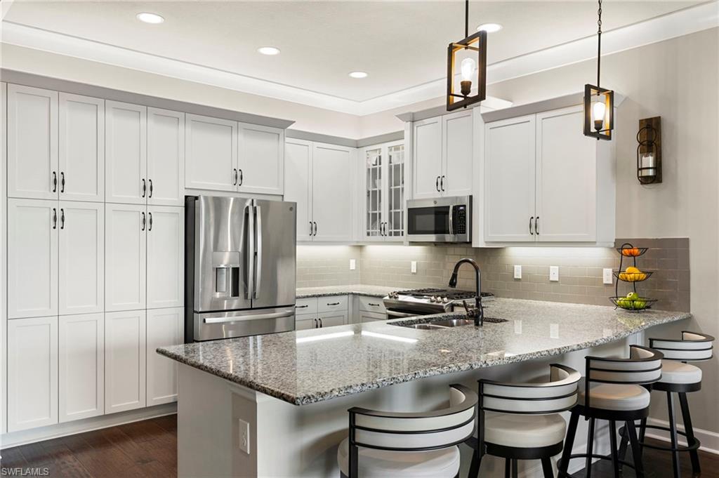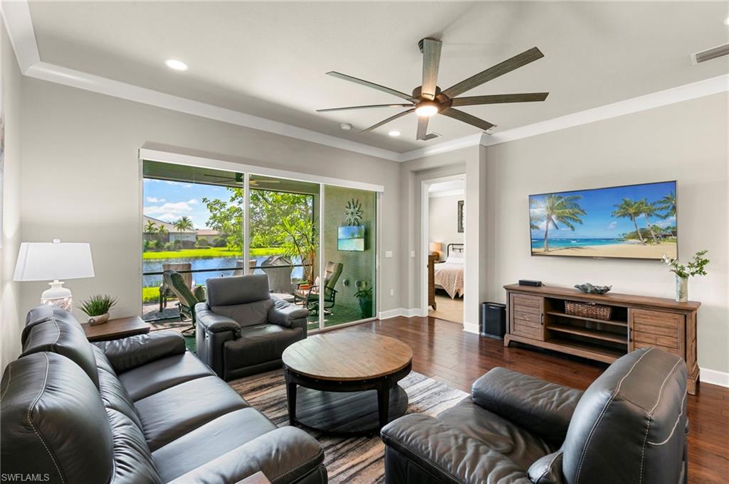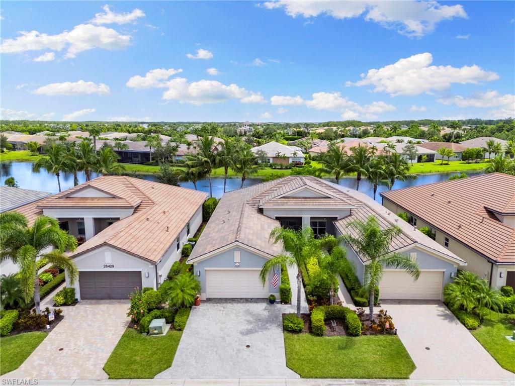 Luxury lakeside living awaits you at 28433 Abruzzo Drive, a stunning Nantucket model attached villa in the sought-after Valencia Bonita community. This exquisite home, built by renowned GL Homes, offers a sophisticated and tranquil lifestyle with over $50,000 in post-closing upgrades. Step inside to a home designed for effortless luxury. You'll immediately notice the upgraded hardwood floors that flow seamlessly throughout, creating a warm and elegant ambiance. The open-concept living area is framed by crown molding, adding a touch of classic refinement. The living room and kitchen overlook a breathtaking lake, offering a picturesque backdrop for everyday life and entertaining. The gourmet kitchen boasts top-of-the-line stainless steel appliances, pristine white cabinetry, and beautiful granite countertops, perfect for the home chef. The true highlight of this property is the expansive outdoor space. The lanai has been professionally upgraded with a 7-foot patio extension and Storm Smart screens, providing a perfect blend of indoor-outdoor living and hurricane protection. Imagine sipping your morning coffee or hosting a sunset barbecue with serene lake views. The front patio also features a screen enclosure, offering another private space to relax. For added peace of mind and convenience, this home includes a whole-home generator, ensuring you're never without power. The two-car garage is a tinkerer's dream, featuring epoxy flooring and professional storage racks, providing a clean, organized, and functional space. Location is everything, and this home is a gem. Situated on Abruzzo Drive, you're just a short, peaceful walk across the street to the spectacular 45,000 square foot clubhouse. Here, you'll find an unparalleled resort lifestyle with amenities that include multiple pools, a state-of-the-art fitness center, a spa, a restaurant, tennis and pickleball courts, and a full calendar of social activities, and a social club for all of your interests. You get all the convenience without the noise of being on the main thoroughfare. The community of Valencia Bonita caters to the 55+ active adult, offering a vibrant and engaging social scene. Beyond the community, the location is unbeatable. Enjoy easy access to the Logan Blvd Extension for walking, jogging, or biking and connection to Naples, and explore the future Midtown at Bonita, a new development promising a lively mix of dining, shopping, and entertainment.
