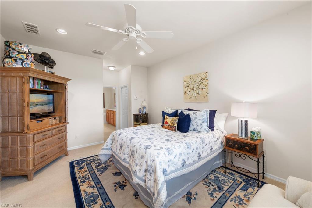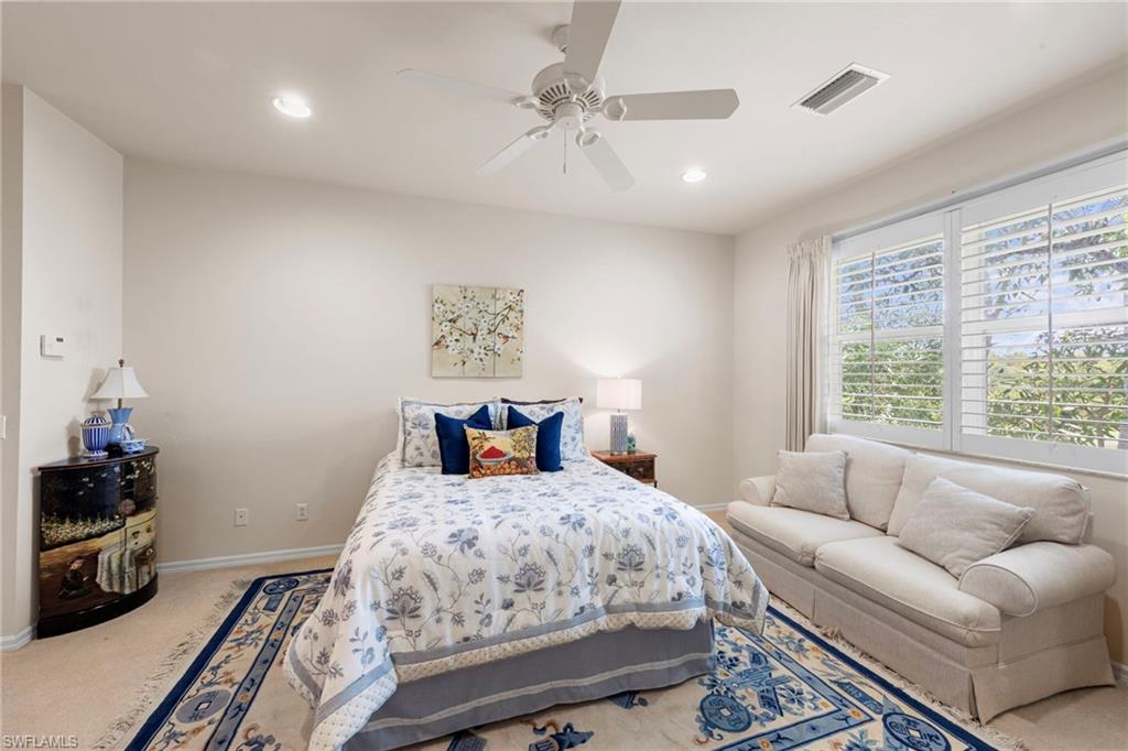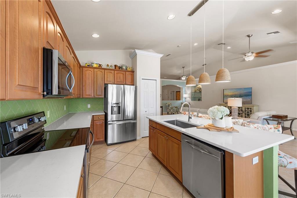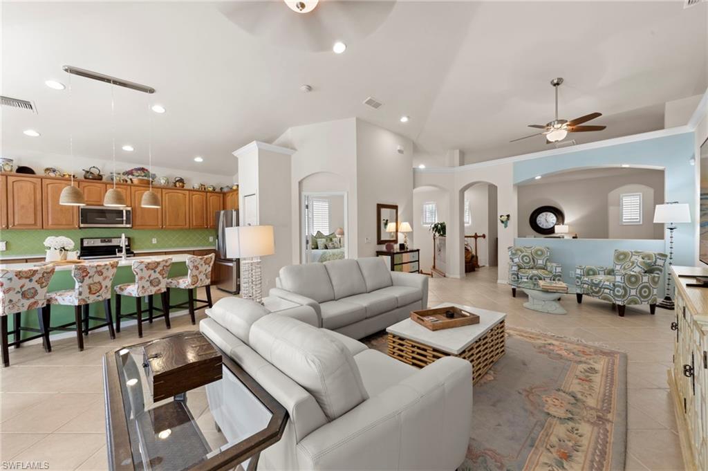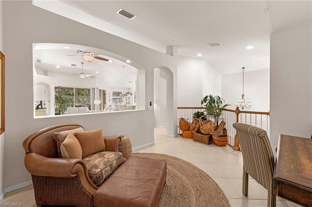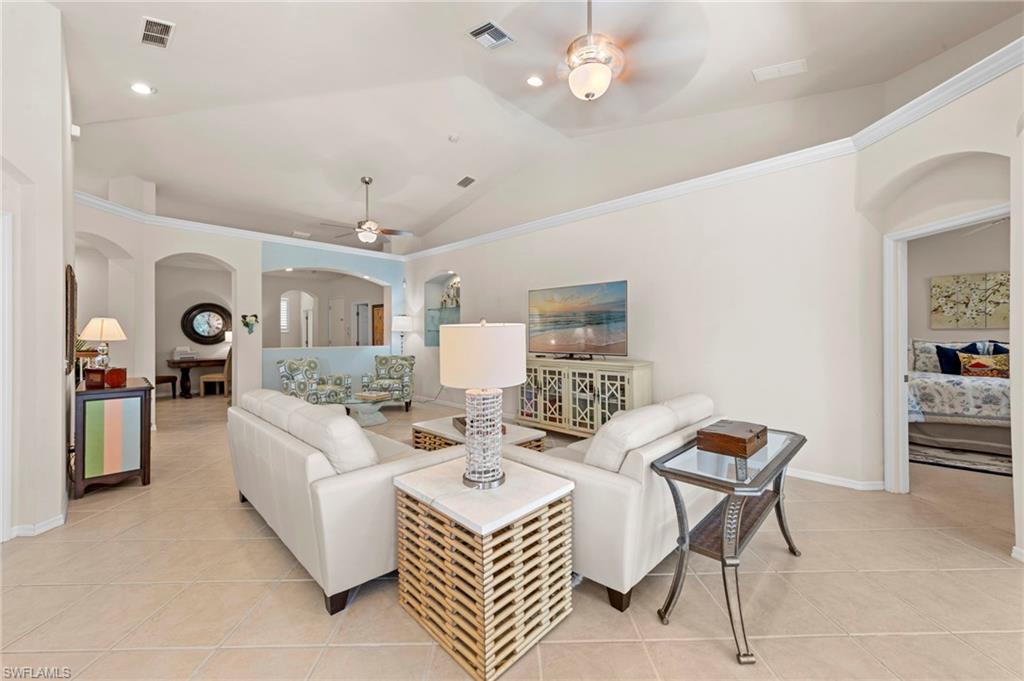 One of the best golf course views in Marbella at Spanish Wells! This 2nd-floor end unit, tucked away on a private cul-de-sac, offers nearly 1,900 sq. ft. of bright, open living space with high ceilings and an attached 2-car garage. The open floor plan includes oversized tile throughout the main living areas, kitchen, and baths. The updated kitchen is designed for the inspired chef with lots of quartz countertop space, stainless steel appliances, a pantry, and a charming breakfast nook overlooking 7th hole perfect for enjoying morning coffee while watching otters and native birds. The spacious primary suite features peaceful views, room for a seating area or vanity, a king-sized bedroom set, and a generous walk-in closet. The bath includes dual sinks, a soaking tub, and a walk-in shower. Two additional bedrooms easily accommodate queen or larger beds Flexible living spaces, split bedrooms for guest privacy, and an eat-in kitchen provide versatility for everyday living and entertaining. Marbella residents enjoy two community pools with kitchen and grilling areas. Optional membership levels at Spanish Wells Golf & Country Club provide access to the newly renovated clubhouse, dining, social events, resort-style pool, fitness center, tennis, and pickleball. Initiation fees are refreshingly modest compared to many area clubs. Low-maintenance living, and a prime location just minutes to beaches, shopping, and dining, this condo is a must-see in one of Bonita Springs’ most desirable communities