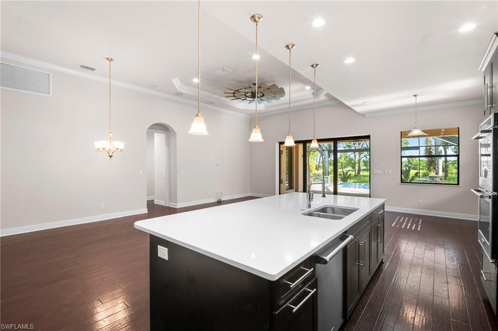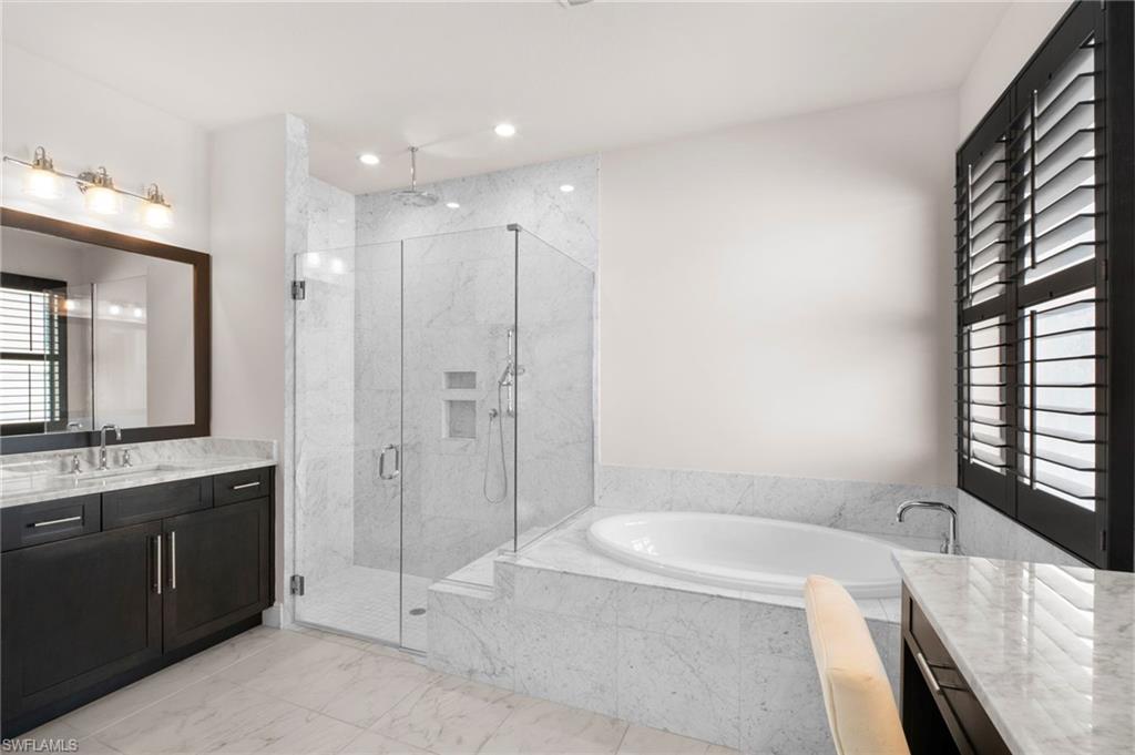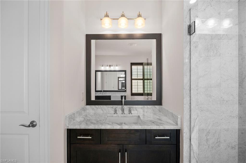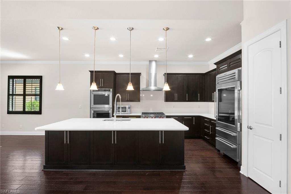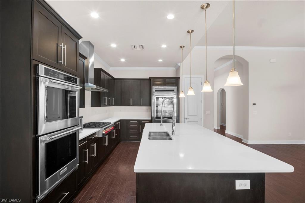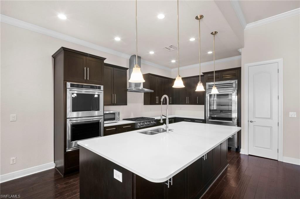 A Move-In-Ready Masterpiece with Stunning Water & Golf Views in Cordova at Spanish Wells! Experience the pinnacle of Bonita Springs living at 28404 San Amaro Dr., a Toll Brothers home that truly stands apart. This highly upgraded 3-bedroom + den, 2.5-bath pool home offers breathtaking natural water and par-3 fairway views, combining elegance, privacy, and unparalleled Florida lifestyle. Step inside to 12-foot tray ceilings, engineered hardwood flooring, and a versatile den for an office or hobby space. The gourmet kitchen is a chef’s dream, featuring a Sub-Zero glass-front refrigerator/freezer under warranty, Wolf 6-burner stovetop with hood, KitchenAid double oven (one never used), Viking dishwasher, ultra-craft cabinetry, and a massive 5x10-foot Snow White quartz island with matching countertops and backsplash. Natural gas hook-ups enhance the culinary experience. The primary suite is a secluded sanctuary with dual walk-in closets and a spa-like en-suite bath with Carrara Bianco Gioia countertops, soaking tub, and walk-in shower. Guest bedrooms enjoy privacy in the front of the home, and the powder room showcases floor-to-ceiling Carrara marble. Outside splash into to a 17,000-gallon saltwater infinity-edge pool with four sheer water descents, framed by a hurricane-rated 1,500 sq. ft. enclosed pool cage offering picture-perfect views. The oversized lanai features two marble Adagio lighted water walls, natural gas and water hook-ups, TV and hardwired internet readiness, plus 10 electrical outlets—perfect for entertaining. Additional highlights include a built-in five-speaker surround sound system with two speakers extending sound to the lanai. HOA fees include a social membership to Spanish Wells Country Club with dining, golf, fitness, bocce, tennis, pickleball, and a heated pool. Just 3 miles from Barefoot Beach, this home offers the ultimate balance of luxury, convenience, and breathtaking Florida living.