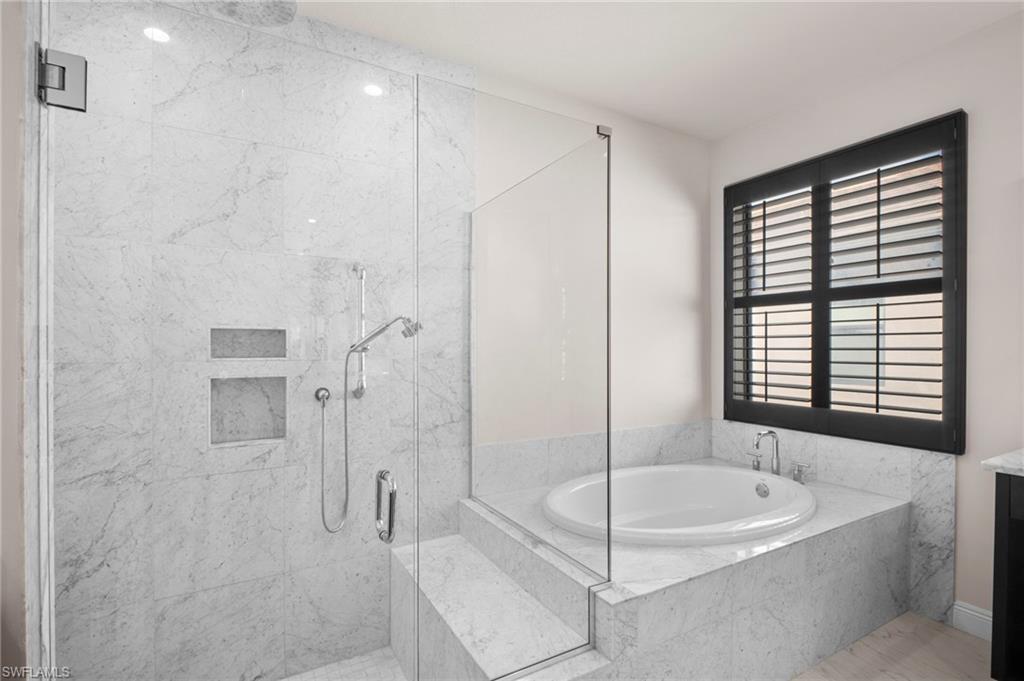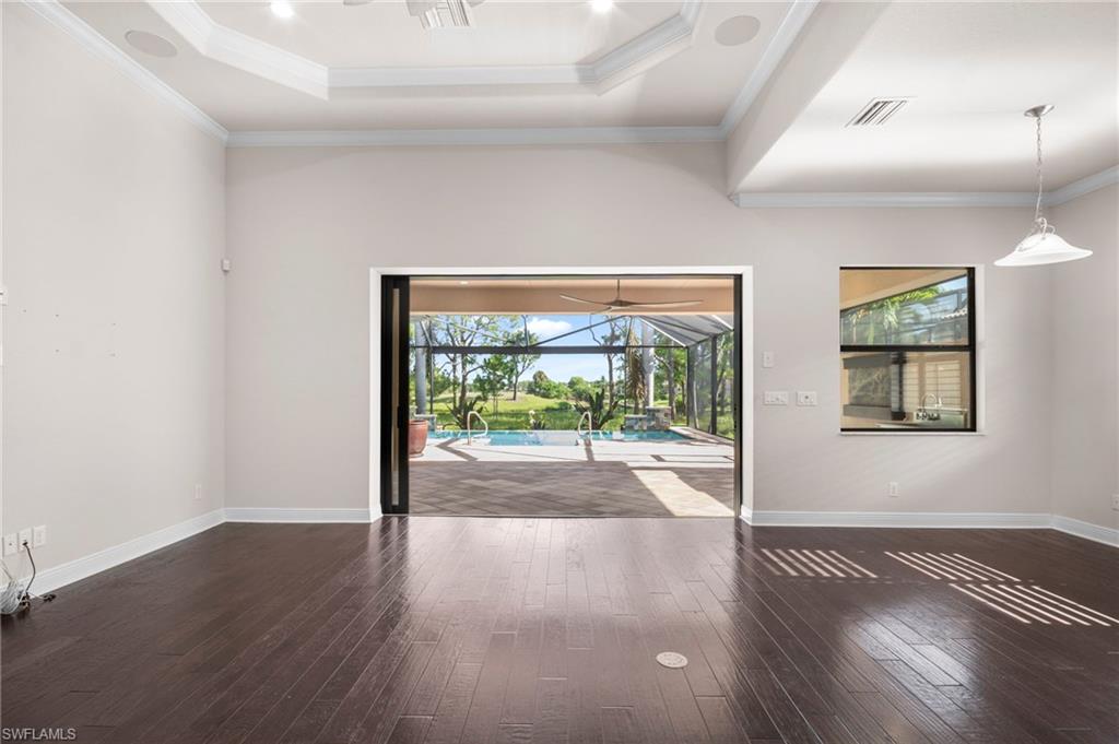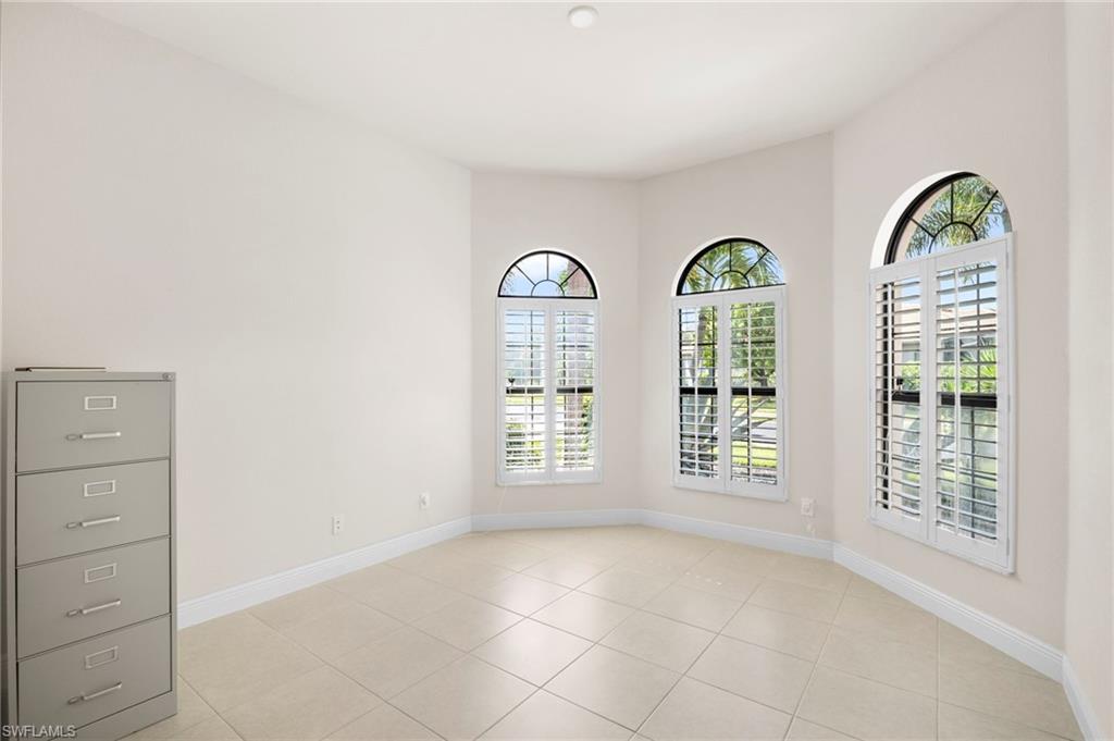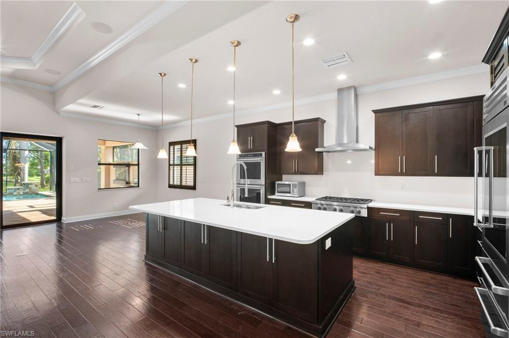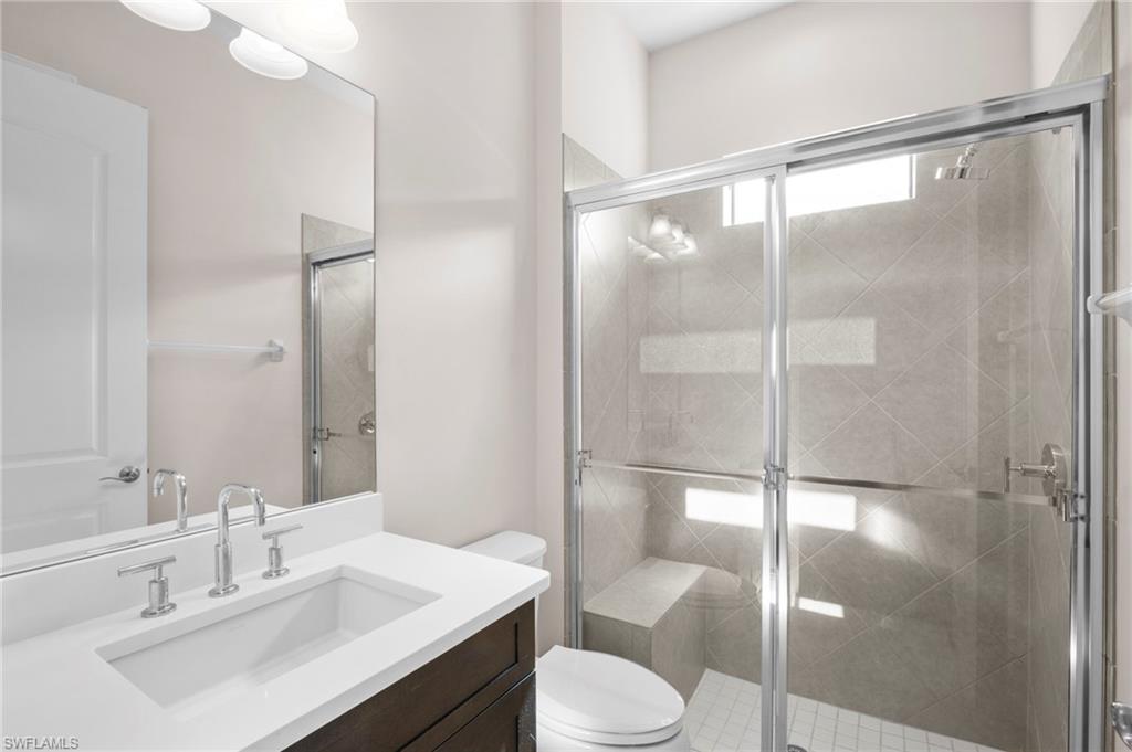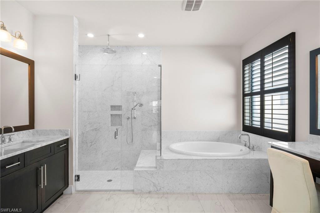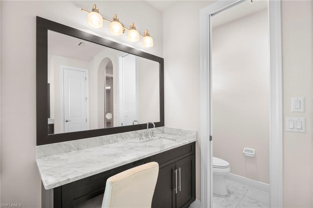 A Move-In-Ready Masterpiece with Stunning Water & Golf Views in Cordova at Spanish Wells! Experience the pinnacle of Bonita Springs living at 28404 San Amaro Dr., a Toll Brothers home that truly stands apart. This highly upgraded 3-bedroom + den, 2.5-bath pool home offers breathtaking natural water and par-3 fairway views, combining elegance, privacy, and unparalleled Florida lifestyle. Step inside to 12-foot tray ceilings, engineered hardwood flooring, and a versatile den for an office or hobby space. The gourmet kitchen is a chef’s dream, featuring a Sub-Zero glass-front refrigerator/freezer under warranty, Wolf 6-burner stovetop with hood, KitchenAid double oven (one never used), Viking dishwasher, ultra-craft cabinetry, and a massive 5x10-foot Snow White quartz island with matching countertops and backsplash. Natural gas hook-ups enhance the culinary experience. The primary suite is a secluded sanctuary with dual walk-in closets and a spa-like en-suite bath with Carrara Bianco Gioia countertops, soaking tub, and walk-in shower. Guest bedrooms enjoy privacy in the front of the home, and the powder room showcases floor-to-ceiling Carrara marble. Outside splash into to a 17,000-gallon saltwater infinity-edge pool with four sheer water descents, framed by a hurricane-rated 1,500 sq. ft. enclosed pool cage offering picture-perfect views. The oversized lanai features two marble Adagio lighted water walls, natural gas and water hook-ups, TV and hardwired internet readiness, plus 10 electrical outlets—perfect for entertaining. Additional highlights include a built-in five-speaker surround sound system with two speakers extending sound to the lanai. HOA fees include a social membership to Spanish Wells Country Club with dining, golf, fitness, bocce, tennis, pickleball, and a heated pool. Just 3 miles from Barefoot Beach, this home offers the ultimate balance of luxury, convenience, and breathtaking Florida living.