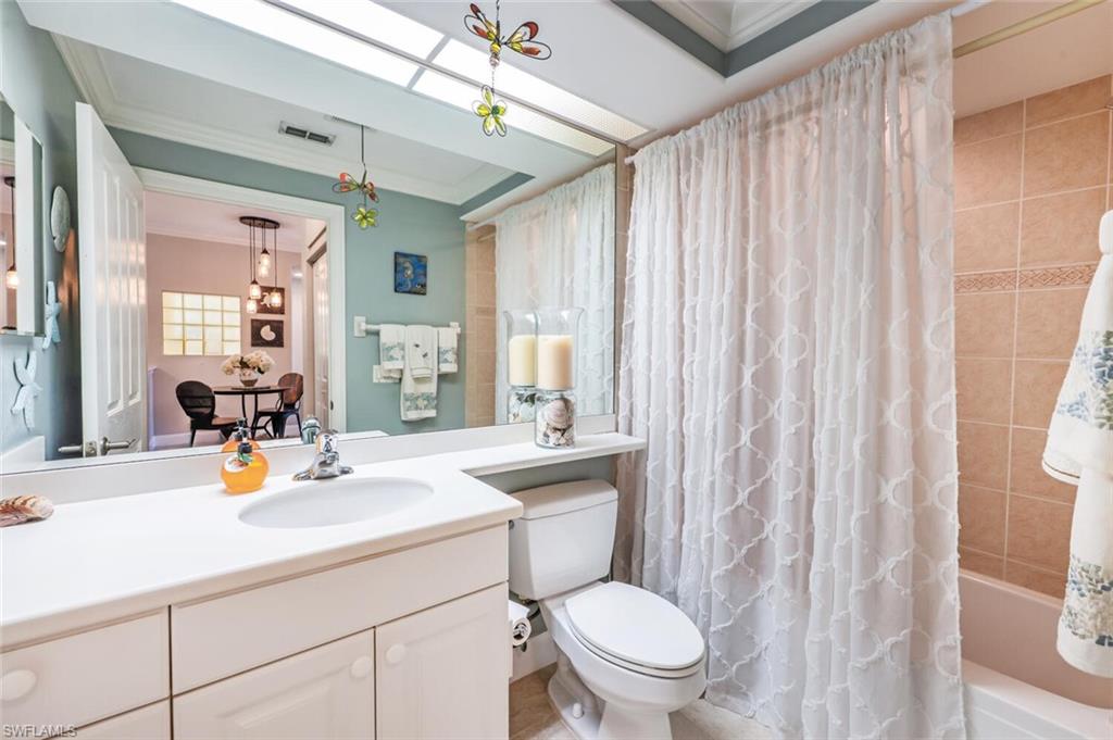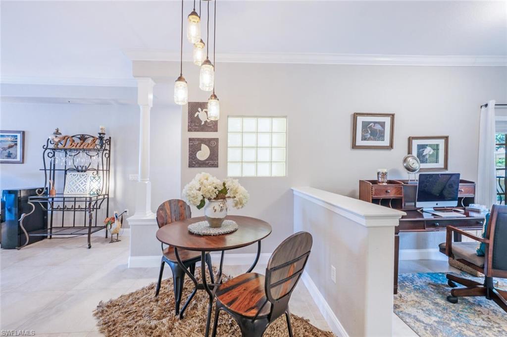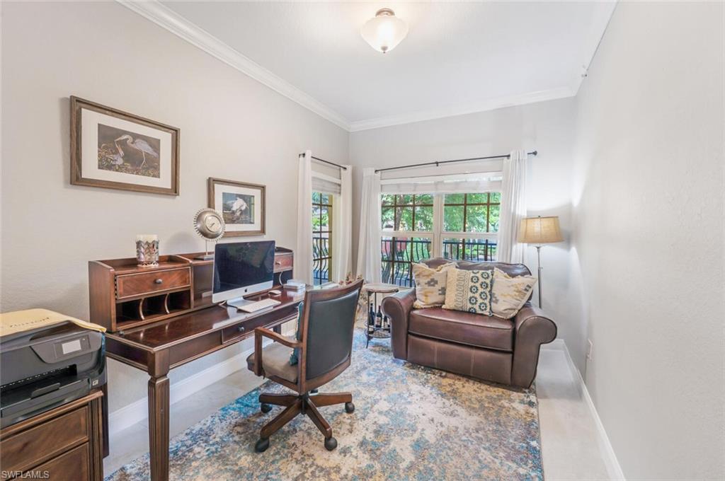 LOWEST PRICE AND BEST VIEW IN RAPALLO. One of the best views in all of Rapallo! This condo is located within the interior of the community, away from outside roads, offering both privacy and convenience just a short walk to Coconut Point Mall. Turnkey furnished and move-in ready, this second-floor Condo offers spectacular views of the water, the community’s pools and amenities, and the western skyline—perfect for enjoying breathtaking Southwest Florida sunsets from your screened lanai or even while you are making dinner. The interior has been thoughtfully updated with newer appliances, AC, quartz kitchen counters, backsplash, crown molding, fresh neutral paint, and all newer tile flooring throughout. Both the master suite and great room open directly to the lanai, while the open den, currently used as an office, easily accommodates overflow guests. For peace of mind, this condo features a new roof, and a location outside the flood zone. This particular building is unique in that there is a large lake in the back and in the front of the building so that you have a view of a lake from every window. A short walk brings you to the heart of Rapallo’s resort-style amenities, including two lagoon-style pools, a screened junior Olympic lap pool, clubhouse with catering kitchen and library, a state-of-the-art fitness center with sauna and full-time fitness director, and five Har-Tru tennis courts with an on-site Tennis Pro. PRIVATE freshwater Beach. Residents enjoy a full calendar of social events along with bocce, botanical gardens, stocked lakes, and scenic biking and jogging paths. Also included is a Fishing Pier on the stocked lakes for those that enjoy fishing in their backyards. The community has exceptional activities including 3x a week Pool Volleyball which is a favorite for the year round and seasonal residents. Just a short stroll or golf cart ride takes you to Coconut Point Mall, now featuring new restaurants including Cheesecake Factory and Diviettos, as well as the newest retail shops such as Nordstrom, the Apple Store, and other high-end retailers. Rapallo has one of the best locations with private back roads where you can take a short ride in your Golf Cart to Coconut Point mall with fine dining, luxury shops, and specialty retail for everyone - no need to travel on a major road to get to your destination. With its prime interior location, stunning views, and unmatched amenities, this home offers the perfect combination of luxury, lifestyle, and convenience. Experience resort-style living at its very best.