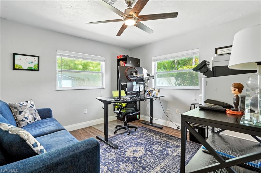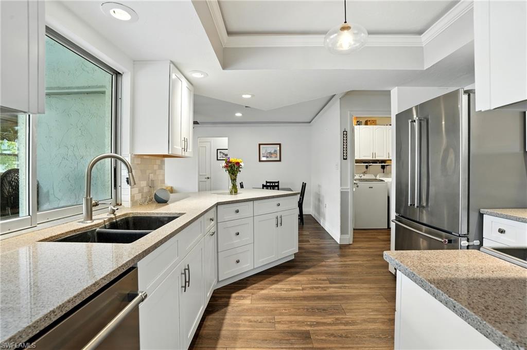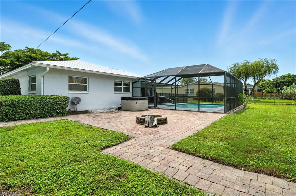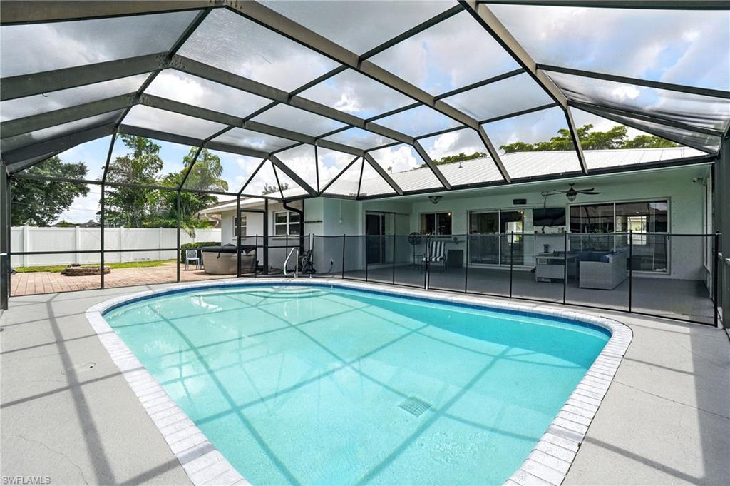 Beautifully maintained single-family pool home in Willoughby Acres, one of North Naples’ most desirable neighborhoods with no HOA fees. This 3-bedroom, 2-bathroom residence features a split-bedroom floor plan, an attached 2-car garage, and the convenience of an indoor laundry room. The recently updated kitchen boasts classic white shaker cabinets, stainless steel appliances, and a peninsula with extra counter space and seating—perfect for entertaining! From the kitchen sink, enjoy views of the sparkling pool and lush backyard. The spacious primary suite is privately situated away from the guest bedrooms and offers a custom walk-in closet along with private access to the screened-in patio. Step outside to your own backyard oasis, complete with a pool, above-ground spa, outdoor fireplace, and storage shed. The fully fenced yard provides privacy and security—ideal for kids and pets. Notable updates include a metal roof (2018), new AC and plumbing (2022), and a newer water heater (2019). Willoughby Acres is known for its quiet streets, friendly community, and unbeatable location—just minutes from shopping, dining, Collier County parks, and the beautiful beaches of Naples.