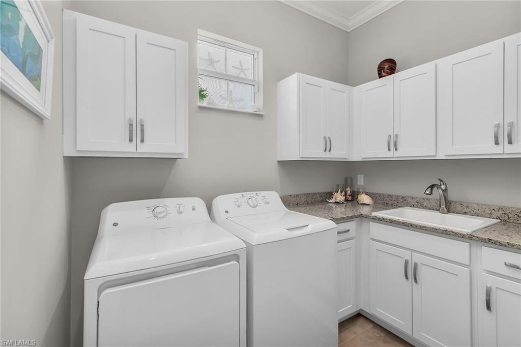 Welcome to this spacious and stunning Stock custom home, in the vibrant gated community of Naples Reserve. Go inside this Venice floorplan design and be greeted by the refined elegance of crown molding throughout, accentuating the home's sophisticated features. The expansive great room with 14-foot tray ceiling, neutral toned-tile floors, is bathed in natural sunlight, creating a warm and inviting atmosphere. The gourmet kitchen is a chef's delight, complete with white cabinetry, under-mount lighting, soft-close drawers and doors, and an expansive island adorned with elegant granite counters and a matching backsplash. Sleek KitchenAid stainless steel appliances complete this culinary haven. Enjoy your morning coffee in the cozy breakfast nook and host formal dinners in the adjacent dining room. Retreat to your spacious primary suite, featuring his and her walk-in closets and a luxurious en-suite bath. The split floor plan includes two spacious guest bedrooms that share a second bath and a roomy fourth bedroom presently used as a den. Relax on your expansive lanai with new screening, southerly long lake view, heated salt-water pool, spa and gorgeous summer kitchen. Enjoy peace of mind with impact glass windows and doors, Storm Smart shades, split air conditioner in the three-car garage, whole-house water filtration system, whole-house surge protection, pool equipment surge protection and Vitex alarm system. Active clubhouse offers an impressive array of amenities and a lively event calendar. Stay fit in the fitness center, play bocce ball or beach volleyball, and unwind at the tiki bar and café. Dive into the resort-style pool with lap lanes or gather around the fire pit. Adventure awaits on the private Kon Tiki island with paddleboards, kayaks and bicycles. Sports enthusiasts will love the tennis and pickleball courts, basketball court, and miles of recreational and biking paths. Pet owners can take advantage of the dog parks, and families will adore the kid’s cove with a tot lot. Conveniently between downtown Naples and Marco Island, this home offers easy access to shopping, entertainment, dining and numerous Gulf beaches. Not in flood zone (Zone X). Don't miss your chance to experience this exceptional lifestyle!