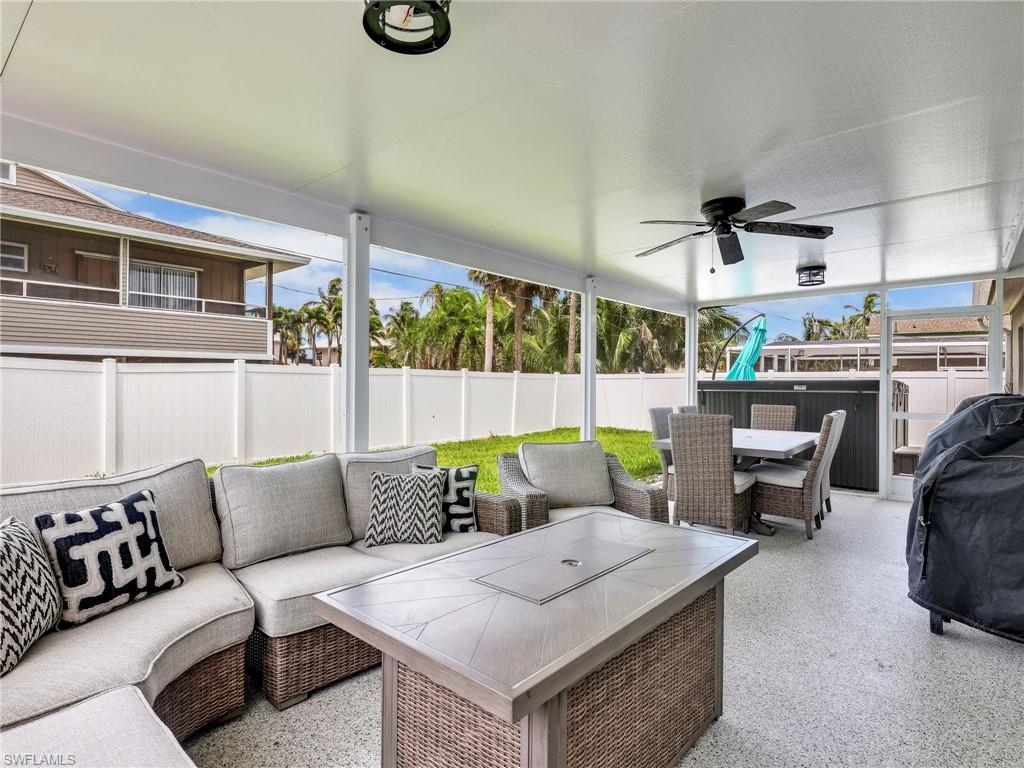 This beautifully remodeled single-family home is located Mid-Island on Fort Myers Beach, just steps from the bay and a private community fishing pier. Offering 3 bedrooms, 2 bathrooms, this coastal retreat is filled with natural light and modern upgrades throughout. The new kitchen features stainless steel appliances, quartz countertops, white shaker cabinets, a center island, and a spacious dining area. The master suite includes a walk-in closet, double vanity, and walk-in shower, while additional highlights include vinyl flooring throughout, impact windows and doors, a tankless Insta-hot water heater, newer roof, recessed lighting, and an inside laundry room. Outdoor living is a dream with an oversized screened lanai with no-see-um screening, an open-air paver patio, an oversized spa, a fully fenced yard, and plenty of room for a pool. With ample parking and a prime location within walking or biking distance to beach access across Estero Blvd and Publix grocery store, this home is move-in ready and offered turnkey.