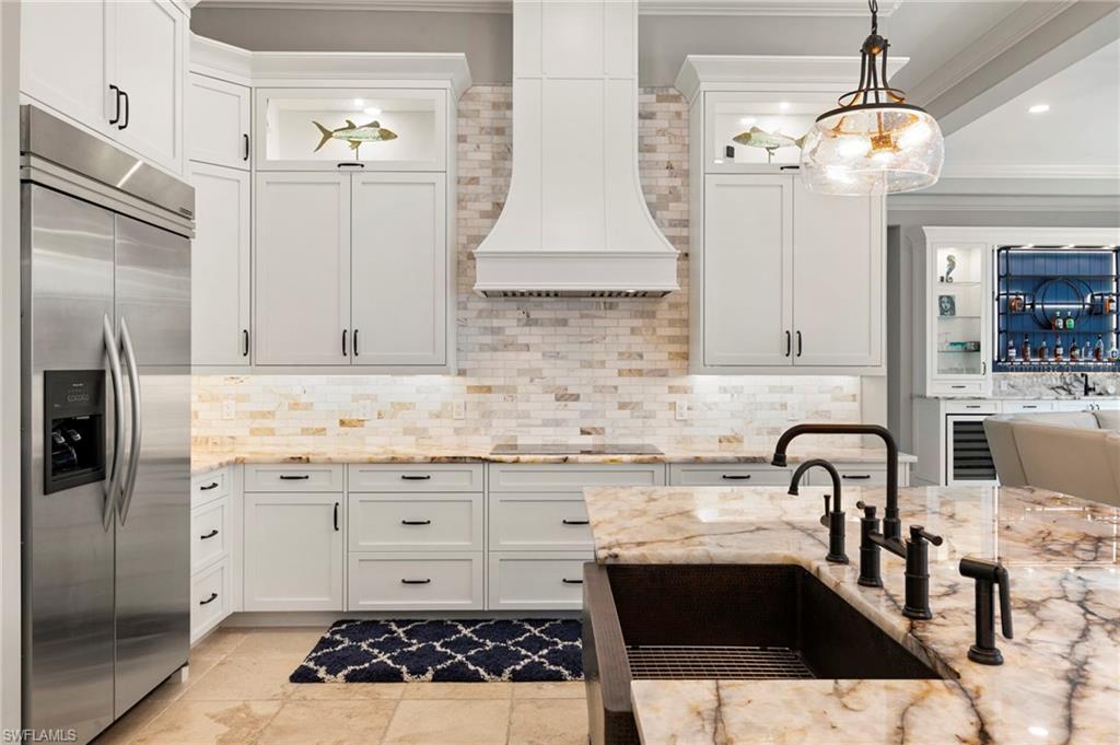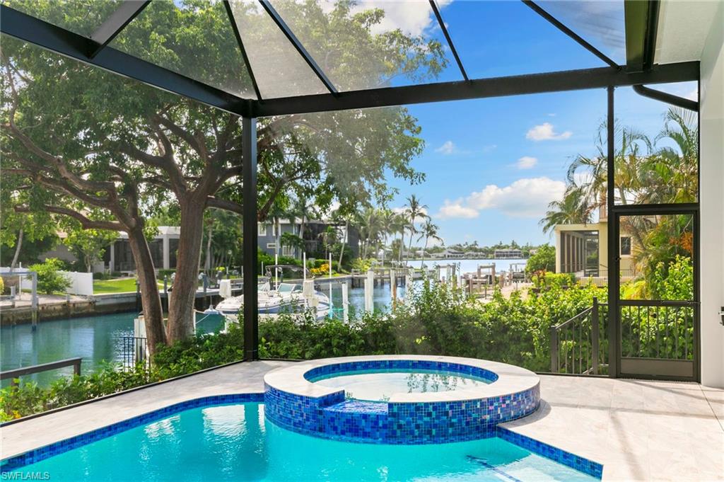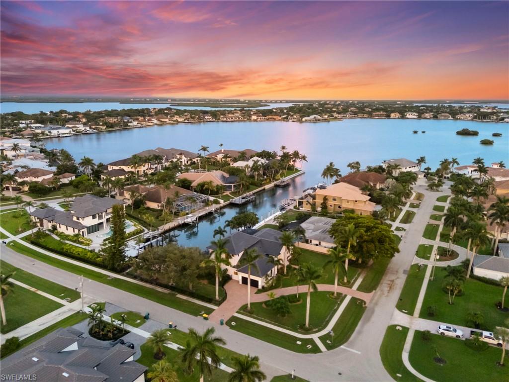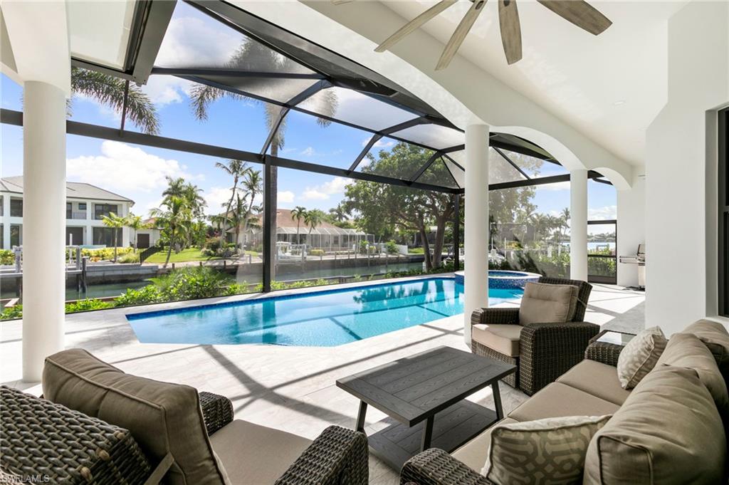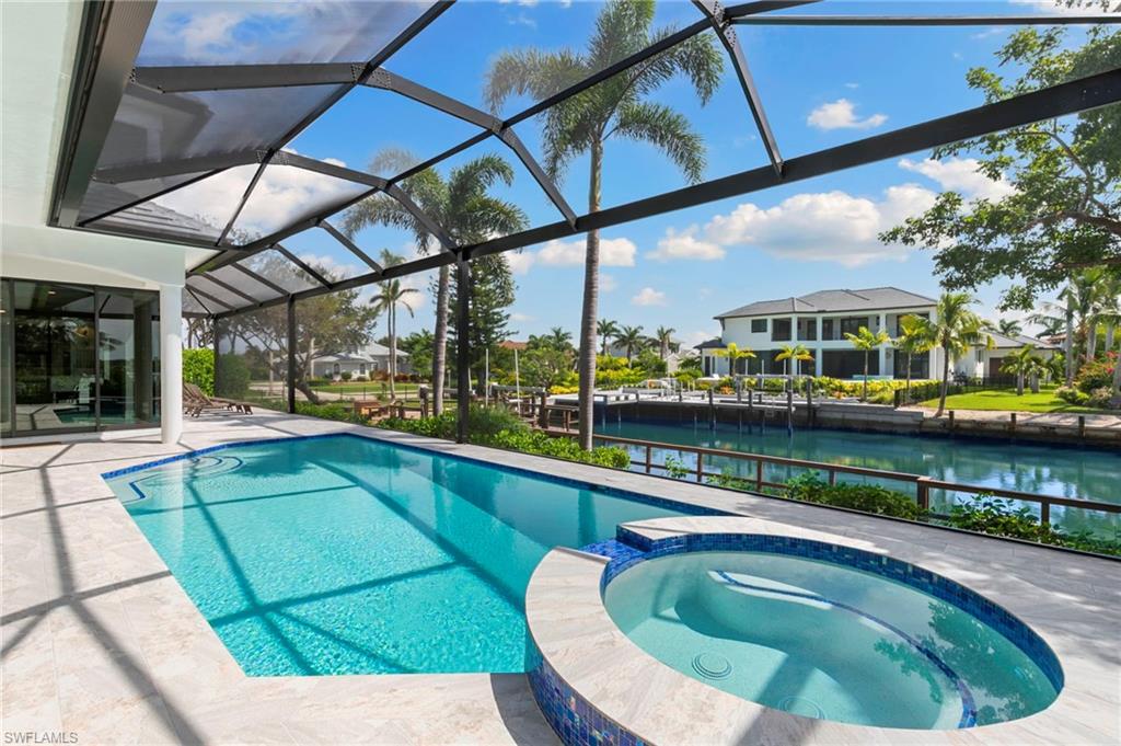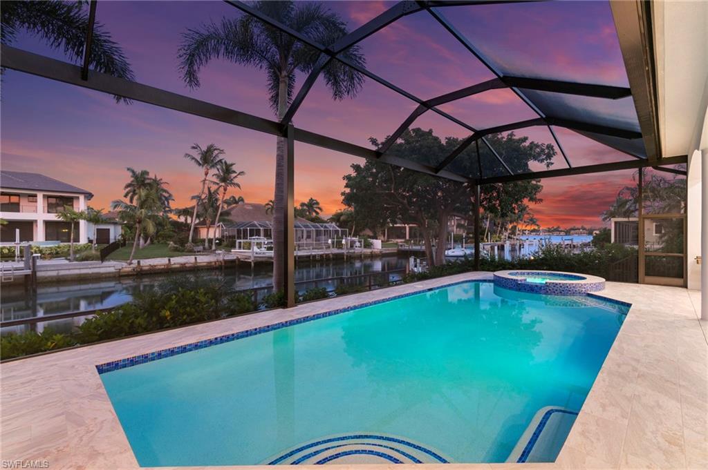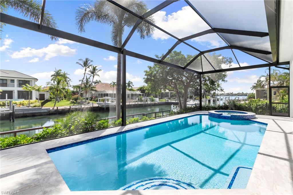 Welcome to paradise in this beautiful newly remodeled (2025) 4 bedroom 4 bathroom home plus two additional office/den spaces located in the prestigious estates area of Marco Island. This move in ready home offers breathtaking long water views of Roberts Bay and is situated on an Estate size lot (.51 acres) with 160 feet of water frontage. Enjoy quick deep water direct access to Caxambas Pass and the Gulf from your private boat dock w/ 16,000 lb. lift that is perfect for boating and fishing. This property has been meticulously updated in 2025 featuring new concrete tile roof, new hurricane impact windows/sliders including zero corner sliders, hurricane rated garage door w/ opener and camera, fresh paint, new stucco, new gutters, modernized porch columns, and a new impact front door with new entryway tile pavers. Inside you will find the interior boasts a new gourmet kitchen remodel with Cristallo quartzite countertops, custom cabinetry, premium induction cooktop, 1200 CFM range hood, new appliances, custom lighting, designer backsplash, and copper farmhouse sink with a specialized faucet. Additionally, there is a stunning new custom-built wet bar with copper sink, Cristallo quartzite countertops, wine cooler, drawer refrigerators, and iron wine/beverage rack with LED lighting for entertaining family and guests. The primary bedroom suite includes two walk-in closets, spacious sitting area, private office, and a luxurious primary bathroom with quartzite countertops, custom built vanities, standalone tub, walk-in shower, and two separate enclosed toilets, one with a smart toilet. The open split floor plan showcases high volume ceilings throughout, additional main floor office/den as well as a main floor guest bedroom and bathroom that serves as a convenient pool bath for the lanai. Upstairs features two more spacious guest bedrooms and two full baths including a 2nd primary bedroom en-suite with its own large walk-in closet and screened-in balcony. Step outside in the expansive new panoramic screened-in lanai and completely renovated pool and spa (2025). The new pool and spa renovation features PebbleTec finish, glass pool tile, new pool equipment, and an Aqualink Pool System. This property displays high end finishes, elegant crown molding, solid core doors, high elevation, lush landscaping, fenced side yard, a long circular brick paver driveway, and an oversized 2 car garage with room for a golf cart as well as high ceiling height to install a two car lift. Additional 2025 features include smart blinds, LED lighting, fan fixtures, breaker panels, smart water heater, plus more! Take advantage of this opportunity to live and invest in one of the best locations on the island. Great fishing, boating, and watching dolphins and manatees swim by from your lanai. Make this your new home on Marco Island.
