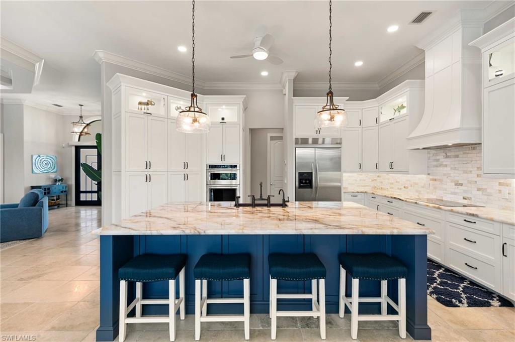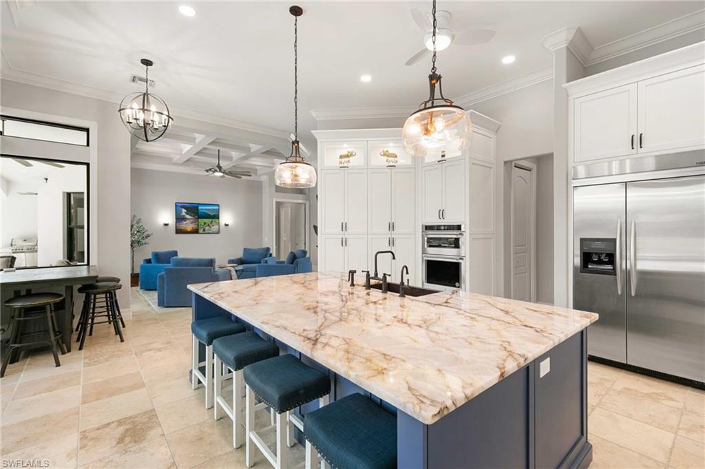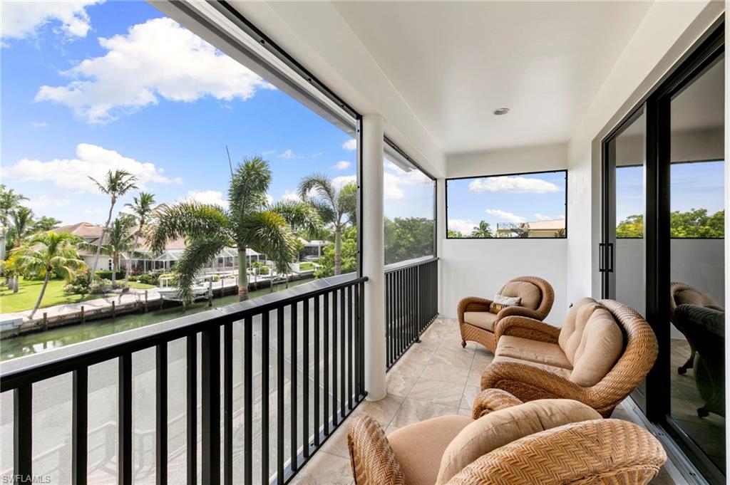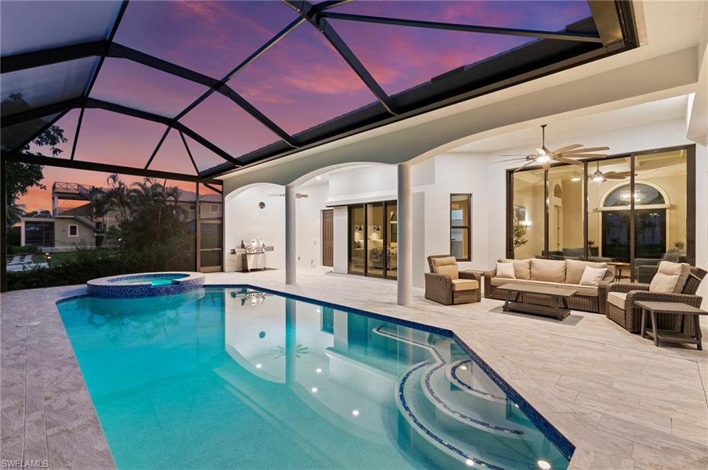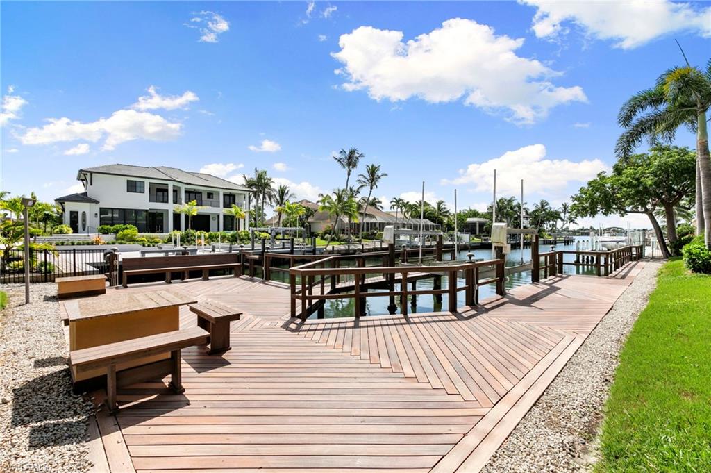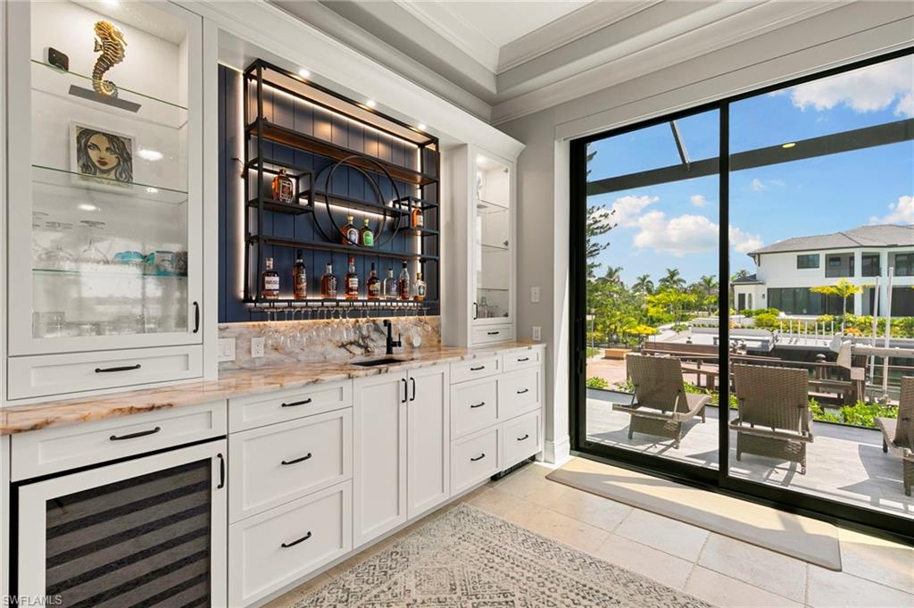 Welcome to paradise in this beautiful newly remodeled (2025) 4 bedroom 4 bathroom home plus two additional office/den spaces located in the prestigious estates area of Marco Island. This move in ready home offers breathtaking long water views of Roberts Bay and is situated on an Estate size lot (.51 acres) with 160 feet of water frontage. Enjoy quick deep water direct access to Caxambas Pass and the Gulf from your private boat dock w/ 16,000 lb. lift that is perfect for boating and fishing. This property has been meticulously updated in 2025 featuring new concrete tile roof, new hurricane impact windows/sliders including zero corner sliders, hurricane rated garage door w/ opener and camera, fresh paint, new stucco, new gutters, modernized porch columns, and a new impact front door with new entryway tile pavers. Inside you will find the interior boasts a new gourmet kitchen remodel with Cristallo quartzite countertops, custom cabinetry, premium induction cooktop, 1200 CFM range hood, new appliances, custom lighting, designer backsplash, and copper farmhouse sink with a specialized faucet. Additionally, there is a stunning new custom-built wet bar with copper sink, Cristallo quartzite countertops, wine cooler, drawer refrigerators, and iron wine/beverage rack with LED lighting for entertaining family and guests. The primary bedroom suite includes two walk-in closets, spacious sitting area, private office, and a luxurious primary bathroom with quartzite countertops, custom built vanities, standalone tub, walk-in shower, and two separate enclosed toilets, one with a smart toilet. The open split floor plan showcases high volume ceilings throughout, additional main floor office/den as well as a main floor guest bedroom and bathroom that serves as a convenient pool bath for the lanai. Upstairs features two more spacious guest bedrooms and two full baths including a 2nd primary bedroom en-suite with its own large walk-in closet and screened-in balcony. Step outside in the expansive new panoramic screened-in lanai and completely renovated pool and spa (2025). The new pool and spa renovation features PebbleTec finish, glass pool tile, new pool equipment, and an Aqualink Pool System. This property displays high end finishes, elegant crown molding, solid core doors, high elevation, lush landscaping, fenced side yard, a long circular brick paver driveway, and an oversized 2 car garage with room for a golf cart as well as high ceiling height to install a two car lift. Additional 2025 features include smart blinds, LED lighting, fan fixtures, breaker panels, smart water heater, plus more! Take advantage of this opportunity to live and invest in one of the best locations on the island. Great fishing, boating, and watching dolphins and manatees swim by from your lanai. Make this your new home on Marco Island.