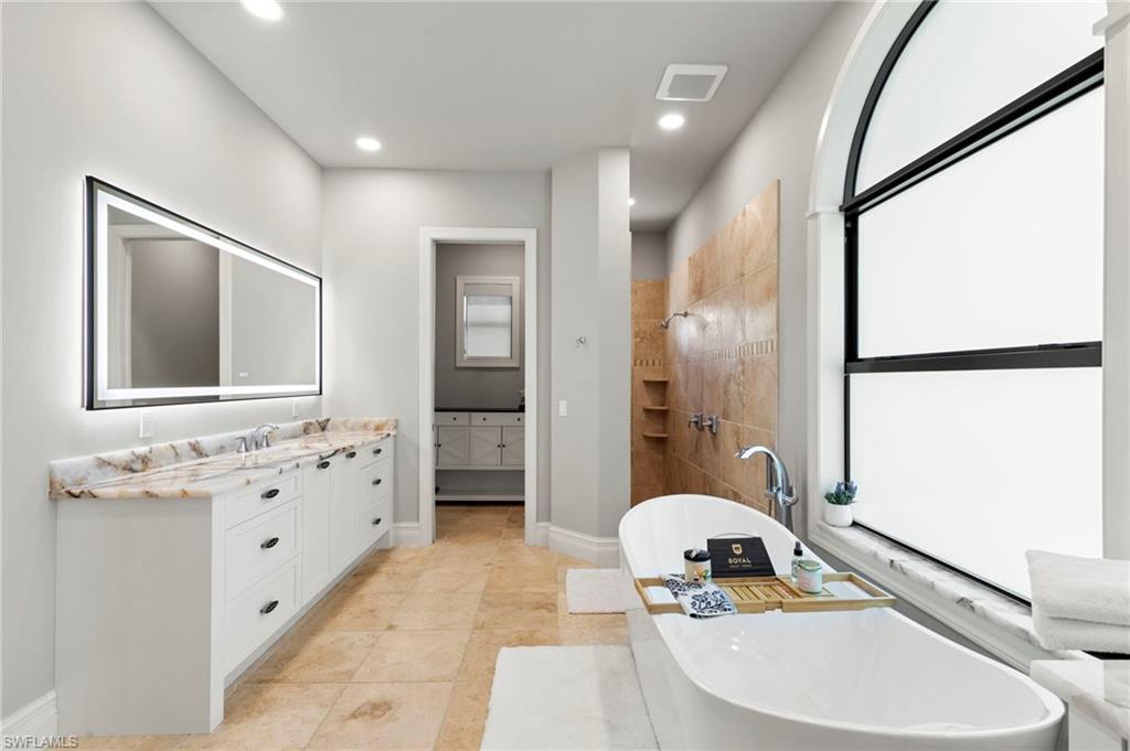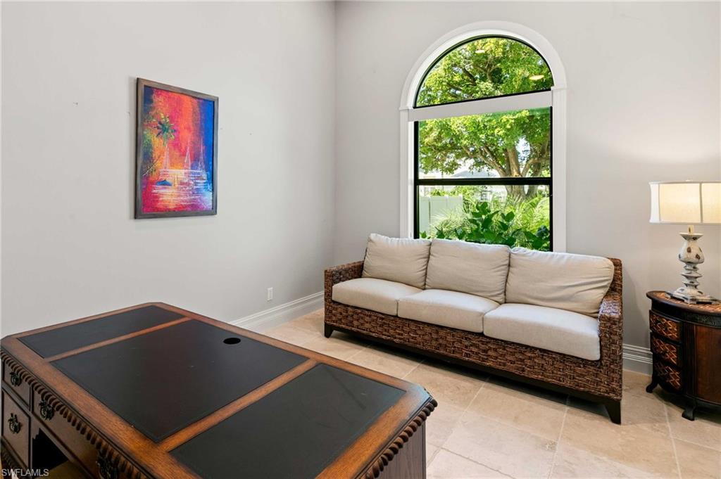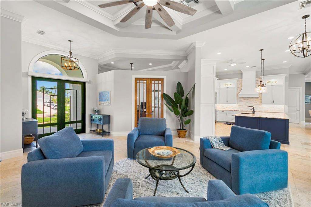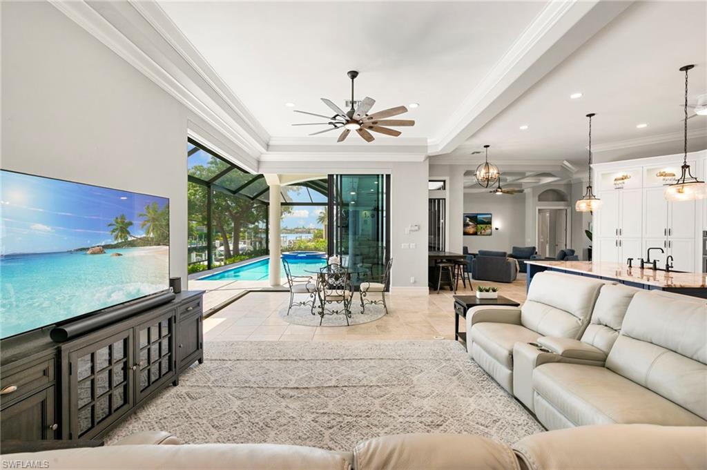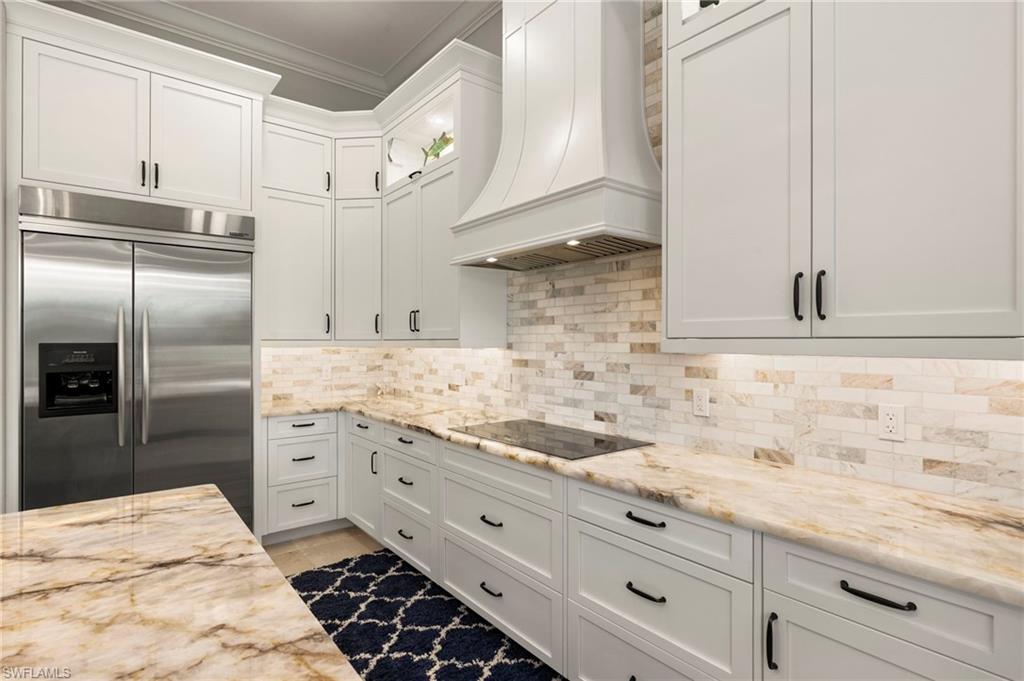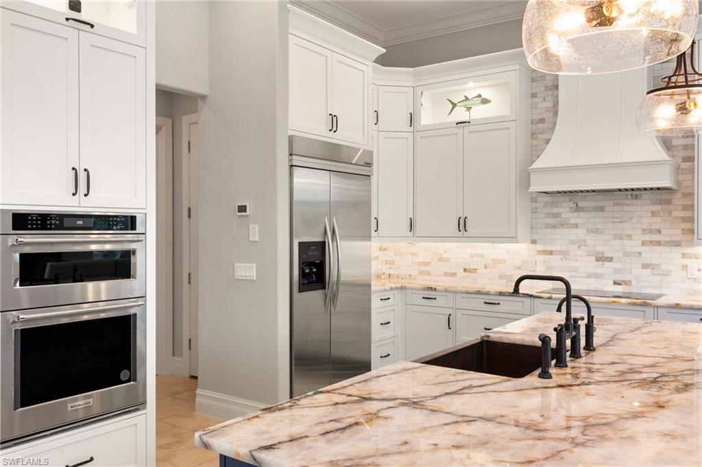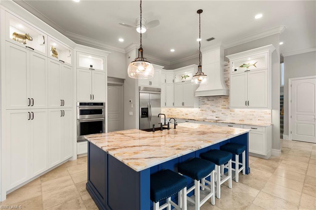 Welcome to paradise in this beautiful newly remodeled (2025) 4 bedroom 4 bathroom home plus two additional office/den spaces located in the prestigious estates area of Marco Island. This move in ready home offers breathtaking long water views of Roberts Bay and is situated on an Estate size lot (.51 acres) with 160 feet of water frontage. Enjoy quick deep water direct access to Caxambas Pass and the Gulf from your private boat dock w/ 16,000 lb. lift that is perfect for boating and fishing. This property has been meticulously updated in 2025 featuring new concrete tile roof, new hurricane impact windows/sliders including zero corner sliders, hurricane rated garage door w/ opener and camera, fresh paint, new stucco, new gutters, modernized porch columns, and a new impact front door with new entryway tile pavers. Inside you will find the interior boasts a new gourmet kitchen remodel with Cristallo quartzite countertops, custom cabinetry, premium induction cooktop, 1200 CFM range hood, new appliances, custom lighting, designer backsplash, and copper farmhouse sink with a specialized faucet. Additionally, there is a stunning new custom-built wet bar with copper sink, Cristallo quartzite countertops, wine cooler, drawer refrigerators, and iron wine/beverage rack with LED lighting for entertaining family and guests. The primary bedroom suite includes two walk-in closets, spacious sitting area, private office, and a luxurious primary bathroom with quartzite countertops, custom built vanities, standalone tub, walk-in shower, and two separate enclosed toilets, one with a smart toilet. The open split floor plan showcases high volume ceilings throughout, additional main floor office/den as well as a main floor guest bedroom and bathroom that serves as a convenient pool bath for the lanai. Upstairs features two more spacious guest bedrooms and two full baths including a 2nd primary bedroom en-suite with its own large walk-in closet and screened-in balcony. Step outside in the expansive new panoramic screened-in lanai and completely renovated pool and spa (2025). The new pool and spa renovation features PebbleTec finish, glass pool tile, new pool equipment, and an Aqualink Pool System. This property displays high end finishes, elegant crown molding, solid core doors, high elevation, lush landscaping, fenced side yard, a long circular brick paver driveway, and an oversized 2 car garage with room for a golf cart as well as high ceiling height to install a two car lift. Additional 2025 features include smart blinds, LED lighting, fan fixtures, breaker panels, smart water heater, plus more! Take advantage of this opportunity to live and invest in one of the best locations on the island. Great fishing, boating, and watching dolphins and manatees swim by from your lanai. Make this your new home on Marco Island.