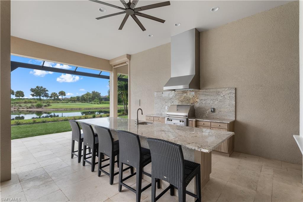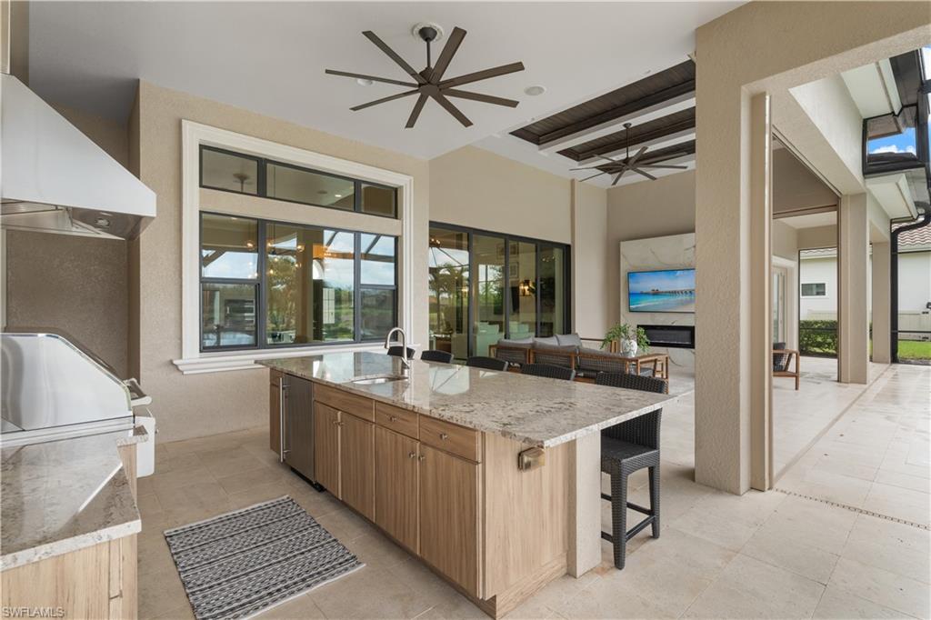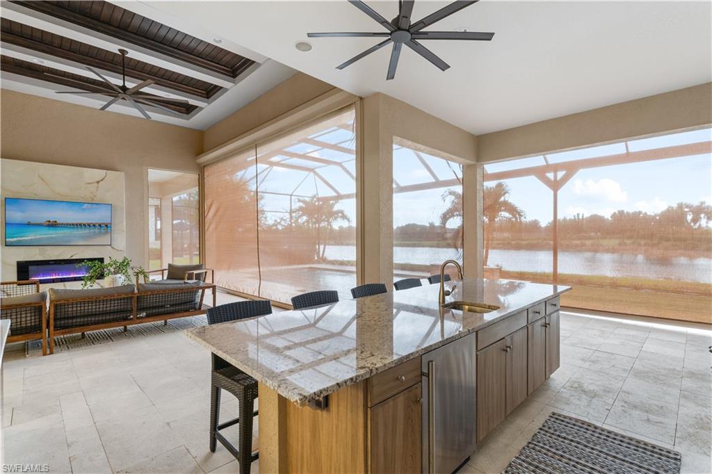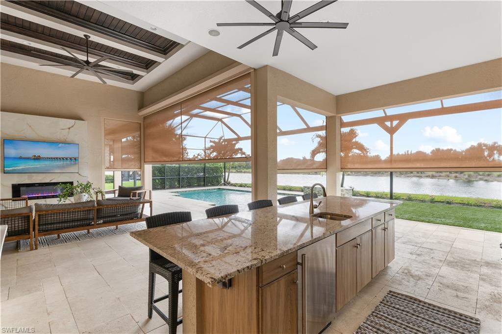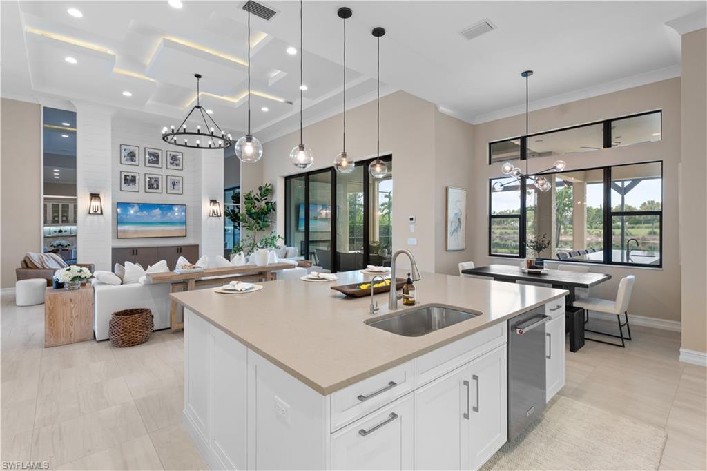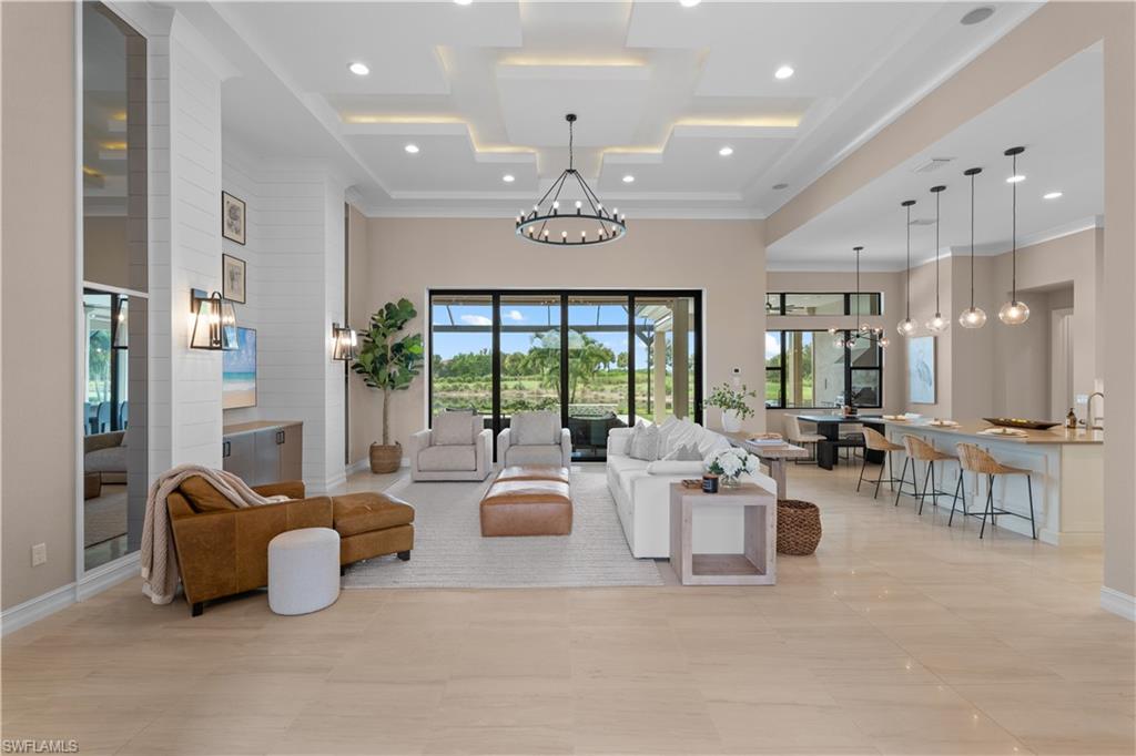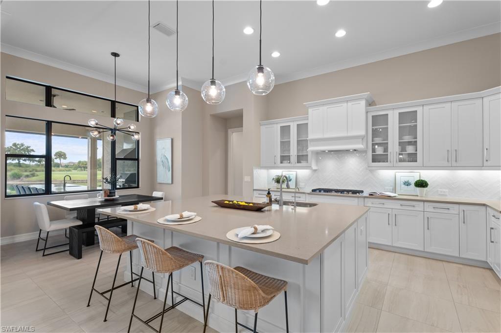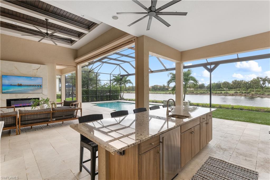 FULL GOLF MEMBERSHIP INCLUDED – EXPERIENCE THE ULTIMATE ESPLANADE LIFESTYLE! A rare offering, this impressive STOCK former model home is one of only 42 Stock-built residences in all of Esplanade. Perfectly positioned on a spacious one-third acre (112’ wide) homesite, this residence boasts 4 bedrooms plus den, 4.5 baths, a 3-car garage, and 3,578 sq. ft. under air. Nearly every room is graced with sweeping water and golf course views, while the sought-after western rear exposure fills the home with natural light and daily sunset vistas. Enter through striking wrought iron double doors into a stunning Great Room floorplan with 15' ceilings, expansive 10’ pocketing sliding glass doors, and a chef-inspired kitchen featuring an oversized center island, KitchenAid appliances, gas cooktop, and wall ovens. The resort-style outdoor living area invites relaxation with a custom saltwater gas-heated pool and spa, framed by a luxurious marble deck and panoramic views of the fairways and lake. Sophisticated upgrades include: Hurricane-impact windows and doors; Whole-house generator; Air-conditioned 3-car garage; Tile flooring in living areas, wood flooring in bedrooms; Custom built-in cabinetry and closet systems; Plantation shutters & designer window treatments; Special-order chandeliers and extensive recessed lighting; in-ceiling sonos speakers; ultra-violet light air purification system; whole house water softener and purification system; new pool GAS pool heater (2024); and more! This extraordinary home offers the perfect balance of elegance, comfort, and resort-style living—enhanced by the included full golf membership in one of Naples’ most coveted communities. Esplanade Golf & Country Club of North Naples offers a true “Lifestyle Community” with world-class amenities, including a resort pool with cabanas and the popular “Bahama Bar,” tennis, pickleball, bocce, a 14-mile network of bike/walking trails, and an 18-hole private golf course. The impressive 15,000 Sq Ft clubhouse features a restaurant, bar, wine-tasting room, wine lockers, and a Starbucks-style café. Best of all, the property’s landscaping, irrigation, golf membership, and all community amenities are covered under a quarterly fee of just $3,664—no additional fees or memberships required! Don't miss your opportunity to own this exceptional home in one of Naples’ most sought-after communities. Schedule your tour of this stunning home and Esplanade Golf & Country Club today! COMING SOON TO ESPLANADE! (2026): Fully renovated and expanded poolside Bahama Bar; expanded outdoor bar at the Barrel House; expanded golf practice range; and an AIR CONDITIONED INDOOR PICKLEBALL COMPLEX with four indoor courts.