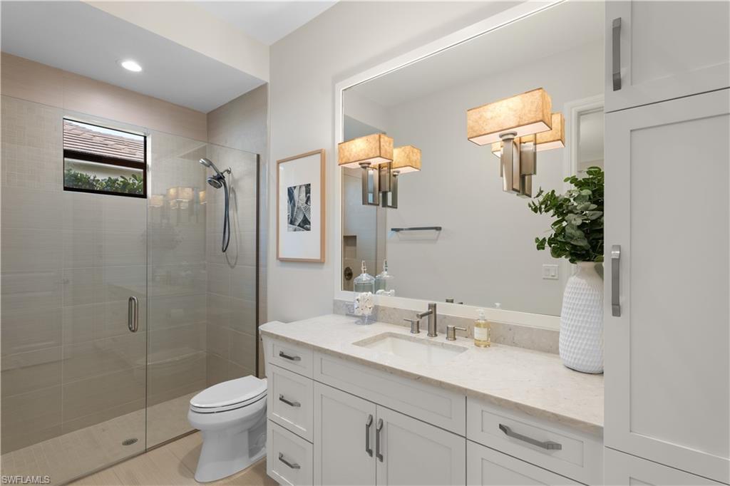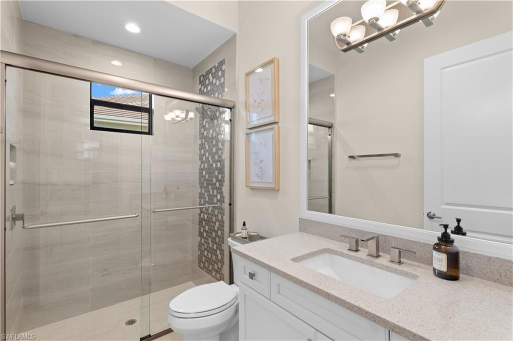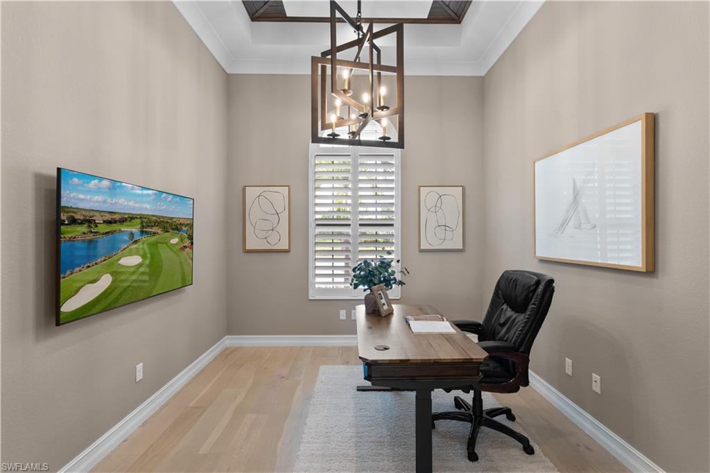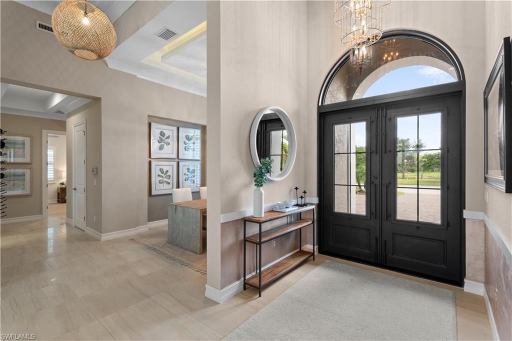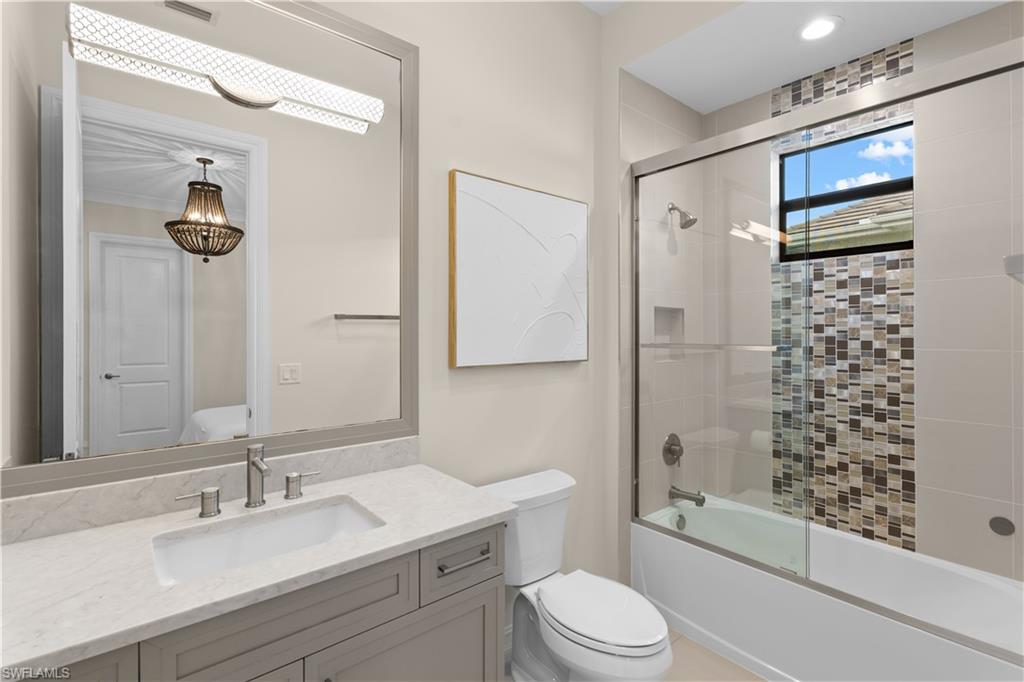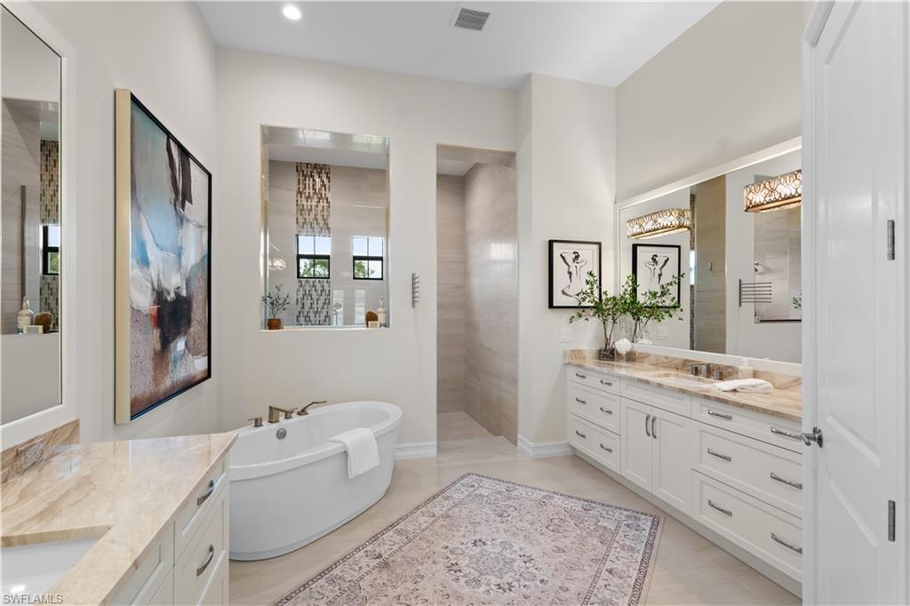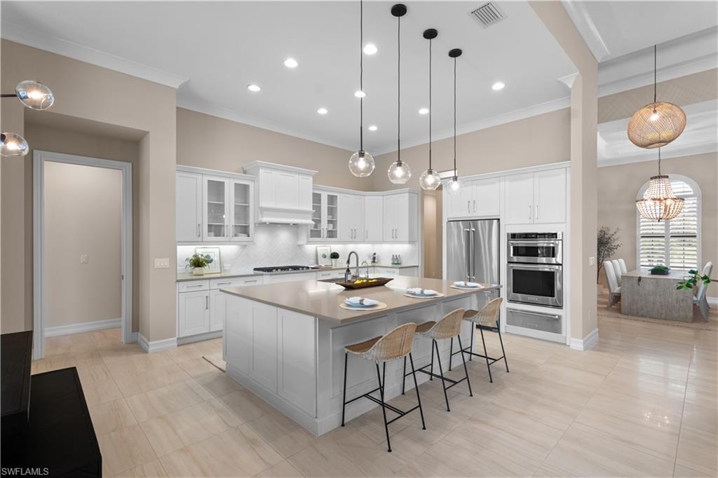 FULL GOLF MEMBERSHIP INCLUDED – EXPERIENCE THE ULTIMATE ESPLANADE LIFESTYLE! A rare offering, this impressive STOCK former model home is one of only 42 Stock-built residences in all of Esplanade. Perfectly positioned on a spacious one-third acre (112’ wide) homesite, this residence boasts 4 bedrooms plus den, 4.5 baths, a 3-car garage, and 3,578 sq. ft. under air. Nearly every room is graced with sweeping water and golf course views, while the sought-after western rear exposure fills the home with natural light and daily sunset vistas. Enter through striking wrought iron double doors into a stunning Great Room floorplan with 15' ceilings, expansive 10’ pocketing sliding glass doors, and a chef-inspired kitchen featuring an oversized center island, KitchenAid appliances, gas cooktop, and wall ovens. The resort-style outdoor living area invites relaxation with a custom saltwater gas-heated pool and spa, framed by a luxurious marble deck and panoramic views of the fairways and lake. Sophisticated upgrades include: Hurricane-impact windows and doors; Whole-house generator; Air-conditioned 3-car garage; Tile flooring in living areas, wood flooring in bedrooms; Custom built-in cabinetry and closet systems; Plantation shutters & designer window treatments; Special-order chandeliers and extensive recessed lighting; in-ceiling sonos speakers; ultra-violet light air purification system; whole house water softener and purification system; new pool GAS pool heater (2024); and more! This extraordinary home offers the perfect balance of elegance, comfort, and resort-style living—enhanced by the included full golf membership in one of Naples’ most coveted communities. Esplanade Golf & Country Club of North Naples offers a true “Lifestyle Community” with world-class amenities, including a resort pool with cabanas and the popular “Bahama Bar,” tennis, pickleball, bocce, a 14-mile network of bike/walking trails, and an 18-hole private golf course. The impressive 15,000 Sq Ft clubhouse features a restaurant, bar, wine-tasting room, wine lockers, and a Starbucks-style café. Best of all, the property’s landscaping, irrigation, golf membership, and all community amenities are covered under a quarterly fee of just $3,664—no additional fees or memberships required! Don't miss your opportunity to own this exceptional home in one of Naples’ most sought-after communities. Schedule your tour of this stunning home and Esplanade Golf & Country Club today! COMING SOON TO ESPLANADE! (2026): Fully renovated and expanded poolside Bahama Bar; expanded outdoor bar at the Barrel House; expanded golf practice range; and an AIR CONDITIONED INDOOR PICKLEBALL COMPLEX with four indoor courts.