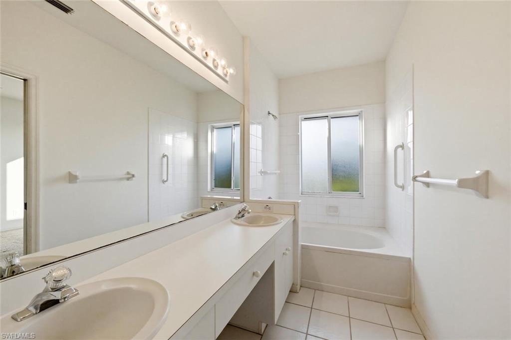 New quartz counter tops, fresh paint throughout and move-in ready! A great condo alternative located in the heart of Bonita. This charming 2-bed + den, 2-bath villa-style home offers 1,309 sq ft of comfortable living space. The open floor plan features 10-ft ceilings and a well-planned split bedroom layout. The owner's suite is complete with an en-suite bath with a soaking tub, dual sinks, walk-in closet, and water views from outside access sliding doors. The guest suite offers a spacious walk-in closet and direct access to the guest bath which has a walk-in shower. In the kitchen, you'll find tile flooring, a Bosch dishwasher, newer appliances, ample cabinet and counter space, and a convenient storage pantry. Enjoy meals in the open dining area or at the kitchen breakfast bar, both offering scenic water views. Relax in the attached cozy den or more formal living room. Outside, you'll appreciate the two-car garage, a screened lanai with water views, and extra storage space in an exterior closet, perfect for golf clubs or your beach chairs. The community amenities are steps away and include a clubhouse, pool, spa, fitness room, tennis court, bocce, and more. All this is just minutes from the exciting revitalization of downtown Bonita Springs, Gulf beaches, golf courses, RSW airport, shopping, dining, and entertainment. This is a perfect investment, starter, or downsizing home!