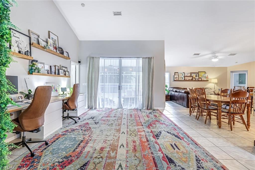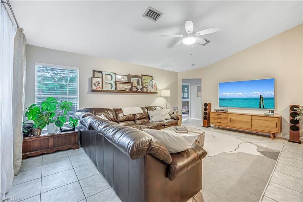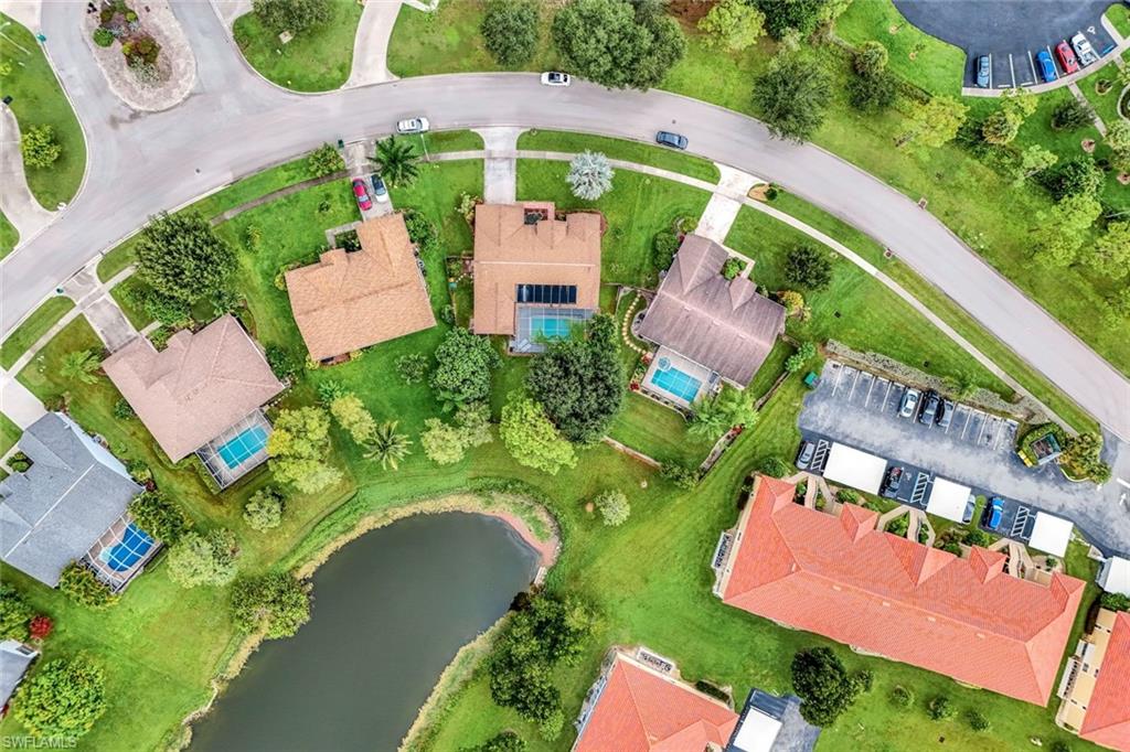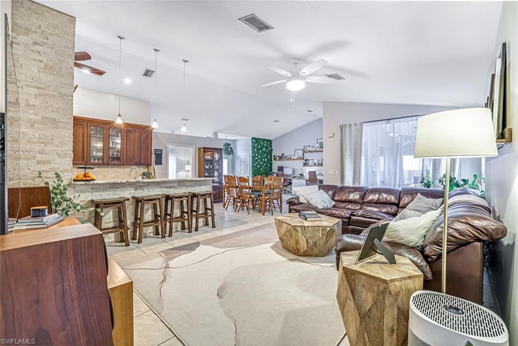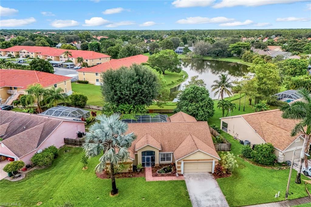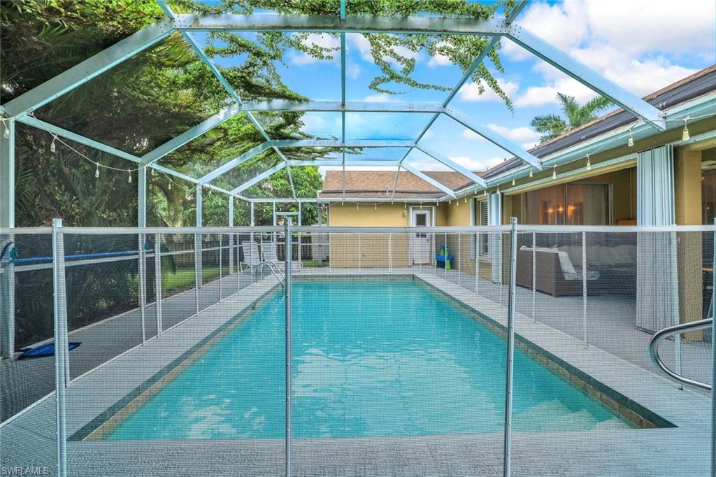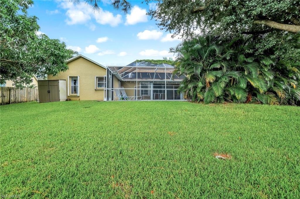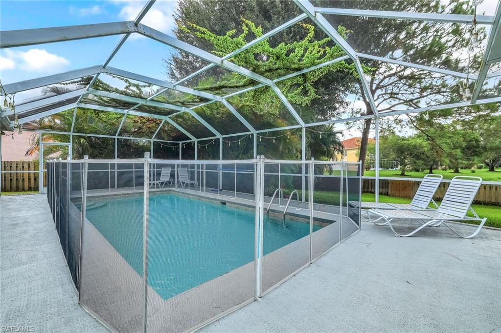 Welcome to this charming 3+den, 2 bath home! Nestled on a 1/4 acre lot in a quiet, well-kept neighborhood, this residence features a screened in pool, perfect for year round Florida living. The open concept floor plan and volume ceilings give a large living feel. The kitchen flows seamlessly into the dining and living areas, and the den, plus additional desk work stations give versatility to those who work from home, or just desire separate living areas. Split bedrooms allow privacy and personal space. The master bathroom features a new, custom built double vanity, glass shower enclosure and custom cabinetry in the walk in closet. The second bathroom has granite countertops with dual sinks and also serves as a pool bath. Outside enjoy your private, screened pool overlooking a lake on your fully fenced yard with fruit trees and tropical landscaping-perfect for pets, play and relaxation. Located just minutes from shopping centers, restaurants, downtown Naples and beautiful beaches. All of this, plus low HOA fees, this home has so much to offer!