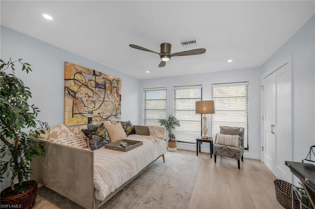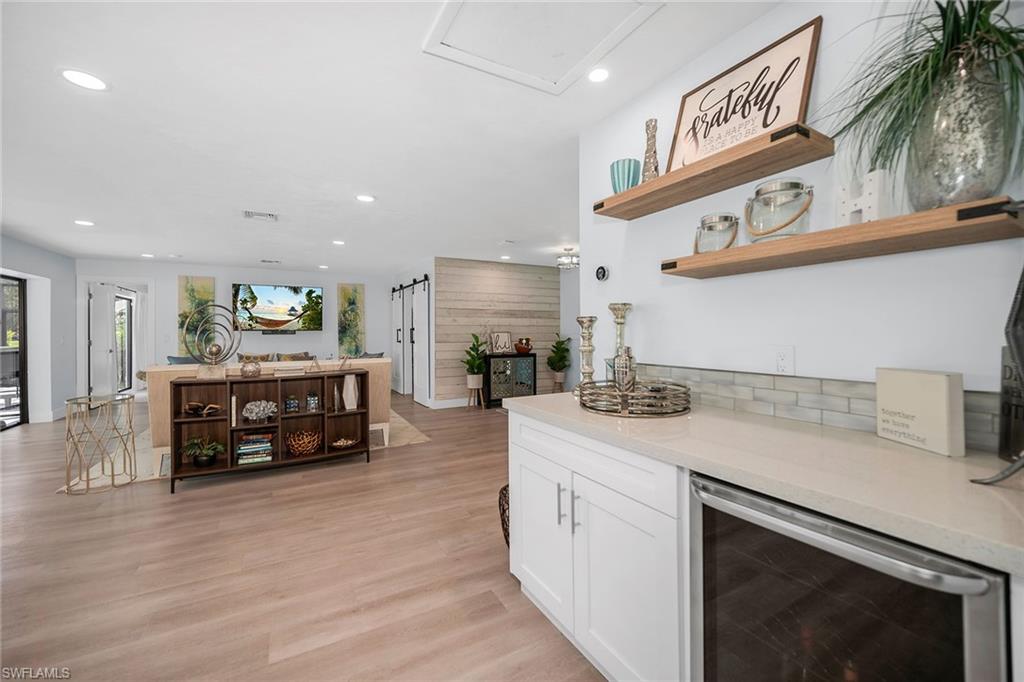 Completely renovated and offered turnkey, this four-bedroom, two-bath home enjoys peaceful views of Hibiscus Golf Course and a lifestyle of comfort and convenience. Recent updates include a brand-new roof and freshly painted lanai deck, making this residence move-in ready or ideal as a rental investment. An open and airy floor plan showcases stylish finishes throughout. The living room flows seamlessly to the screened lanai through pocket doors, where tranquil golf course vistas create a perfect backdrop for relaxation or entertaining. The family room features a modern accent wall, while the updated kitchen is a showpiece with quartz countertops, an island, glass tile backsplash, under-cabinet lighting, stainless steel appliances, including a double oven stove with vent hood, and a window overlooking the pool and fairways. The primary suite is a private retreat with an accent wall, recessed LED lighting, fan, window coverings, and a spa-like bath featuring dual sinks, LED backlit mirrors, cabinet closet, frameless glass walk-in shower with tiled walls, and modern finishes. Guest bedrooms are equally inviting, with recessed lighting, ceiling fans, and custom touches such as barn doors. Both baths feature walk-in showers with sleek tile work. Additional highlights include a Nest thermostat, custom lighting, and turnkey furnishings for immediate enjoyment. Outdoors, the newly painted lanai deck offers ample space for lounging and dining while overlooking the golf course. This home combines stylish modern updates with the tranquility of its golf course setting, just minutes from Naples’ beaches, shopping, dining, and attractions.