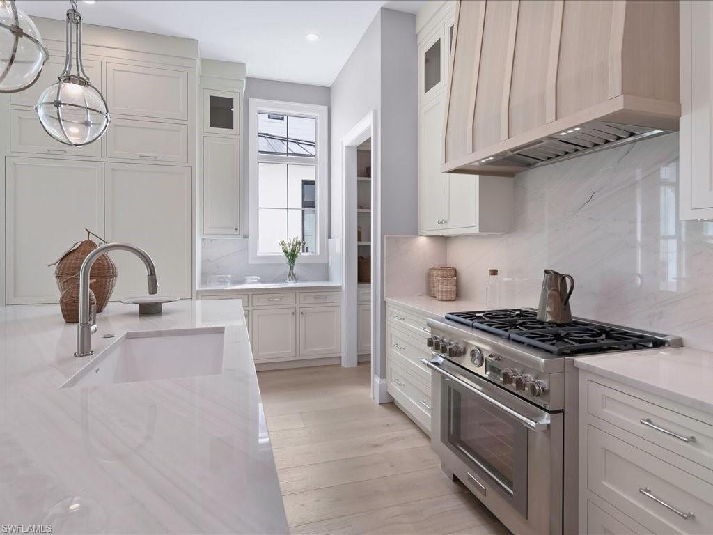 Experience refined coastal living at 1179 Broad Ave N, a brand-new custom home in Naples’ prestigious 34102 zip code. This 5-bedroom, 5-bath residence spans over 4,600 square feet and blends timeless elegance with modern sophistication. Built with solid concrete block construction, the home offers enduring strength, security, and peace of mind. Each bedroom enjoys a private en-suite, ensuring comfort and privacy for family and guests, while a first-floor office provides a dedicated retreat for work or study. At the heart of the home, the chef’s kitchen shines with striking quartzite countertops, premium Thermador appliances, and a spacious walk-in pantry. Wide-plank wood flooring flows throughout the open-concept layout, seamlessly connecting kitchen, dining, and living spaces—ideal for both everyday living and grand entertaining. Smart lighting and integrated surround sound elevate the atmosphere, setting the stage for gatherings of every scale. The serene primary suite features a spa-inspired bath with dual vanities, a soaking tub, and bespoke finishes. Upstairs, a versatile second living room offers an additional gathering space. Outdoors, a covered patio with roll-down screens overlooks the sparkling pool, creating a private oasis for year-round enjoyment. Additional highlights include soaring 11-foot ceilings, a custom staircase, a 3-car garage with alley access, abundant storage, a whole-house generator, and a buried propane tank, with an elevator option for future convenience. Perfectly situated on a quiet, low-traffic street, this architectural gem fuses style, comfort, and craftsmanship—one of Naples’ newest treasures.