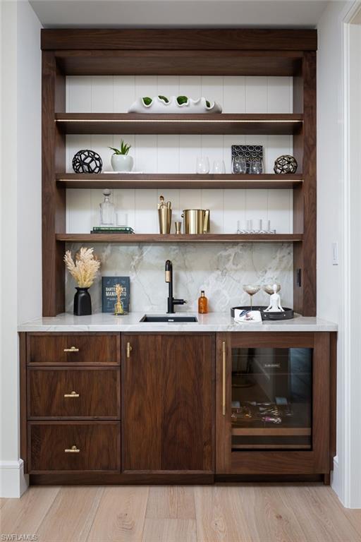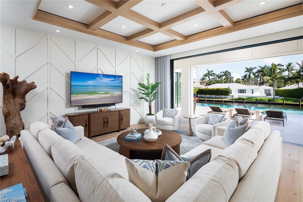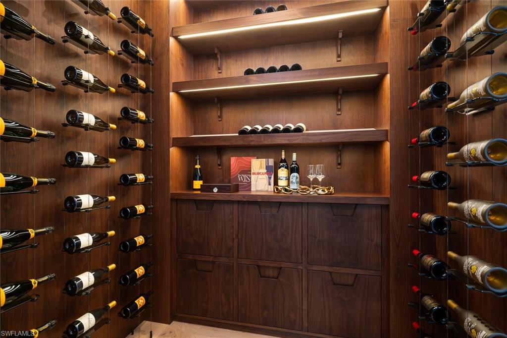 Showcasing light and breezy seaside-inspired aesthetics complemented by warm natural wood tones, this newly constructed masterpiece by Wilbrett Construction Company is a testament to exceptional craftsmanship. Designed with sophistication by Kukk Architecture and finished with the exquisite touches of Freestyle Interiors, this home spans approximately 6585 square feet of meticulously planned living space, adorned with luxury features at every turn. Step into a grand great room where intricate ceiling details add a touch of artistry and seamlessly flow into the chef's kitchen complete with custom cabinetry and a well-appointed butler's pantry. Adjacent to this central space, a wet bar and temperature controlled wine cellar perfectly complement a spacious study, offering a refined retreat with custom cabinetry that harmonizes functionality and elegance. The main-floor primary suite offers tranquil water views and a spa-inspired bath featuring a freestanding soaking tub and a walk-in shower. Upstairs, four generously sized ensuite bedrooms encircle a central living area, which includes a wet bar and access to an extended balcony that captures spectacular wide water vistas. Outdoor living is a dream come true with a resort-style infinity-edge pool, soothing spa, and sun shelf, surrounded by a covered loggia outfitted with remote controlled screens and shutters. A stone-clad fireplace creates a cozy ambiance, while the outdoor kitchen makes hosting gatherings effortless and enjoyable. Ideally situated on the waters of Egret Channel, with its prime location at the intersection of Heron Cove and Gull Cove, the property takes full advantage of sweeping water views. Boating enthusiasts will appreciate the deep-and wide water frontage, ideal for navigable access. This serene setting is also just moments from Naples' pristine white sandy beaches and the shops and restaurants of Third Street south. This thoughtfully designed residence embodies the quintessential Florida lifestyle, offering a rare blend of elegance, comfort, and functionality.