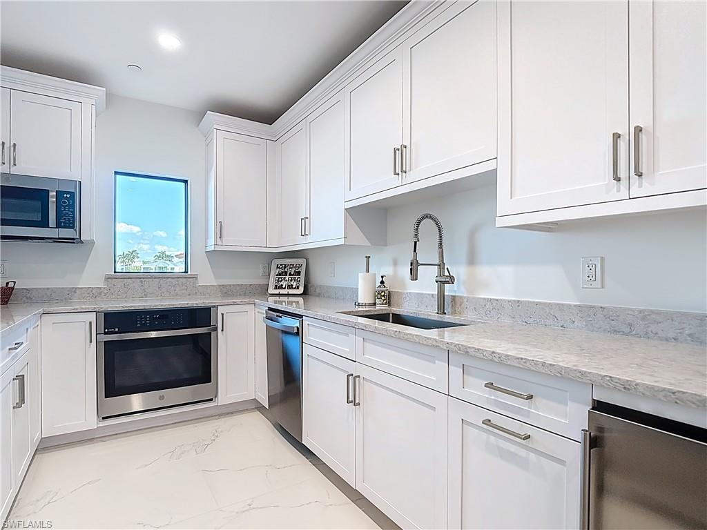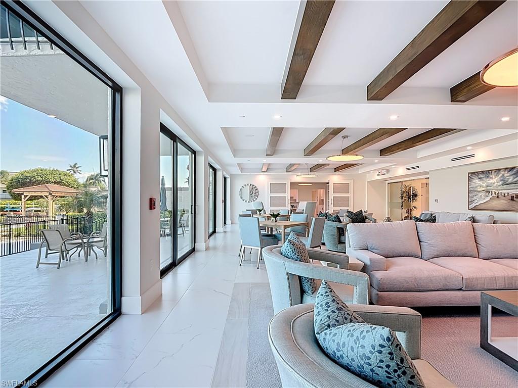 Now offering this designer updated condo in the heart of Naples! Enjoy your breakfast, dinner and cocktails overlooking the large bay with unobstructed views. Across the street from the beach for your walks on the white sandy beachline. The kitchen is tastefully done with quartz counters, stainless appliance package, upgraded cabinets, under island storage cabinets and more! The bathrooms offer completely tiled showers, seamless glass doors, quartz counters, and other high-quality finishes. Also, each bathroom has a very unique built in medicine storage area! Tile in the entire unit is top end 24-inch marble, and the lanai is enclosed to add to the total under air living space. You are assigned parking space #14 under cover and there are tons of open parking outdoors for your use and your visiting guests. Offered Furnished with all Furniture in the unit included! Make your appointment now to see how nice this condo is!!! The Madrid Club is an extremely well-maintained building offering Kayak Storage, Large outdoor area with a lovely pool over looking the bay, and a pavillion offering seating and grilling!