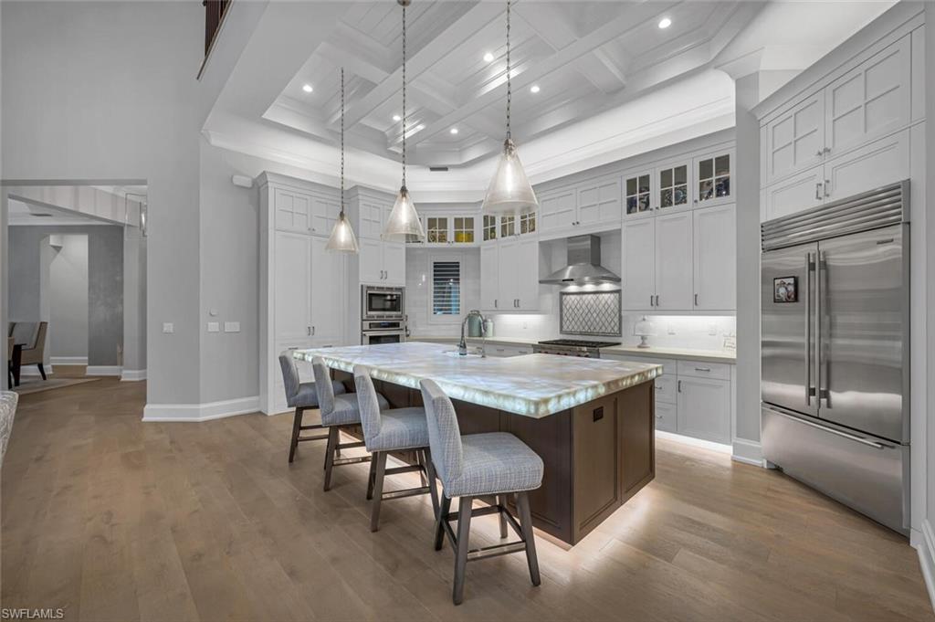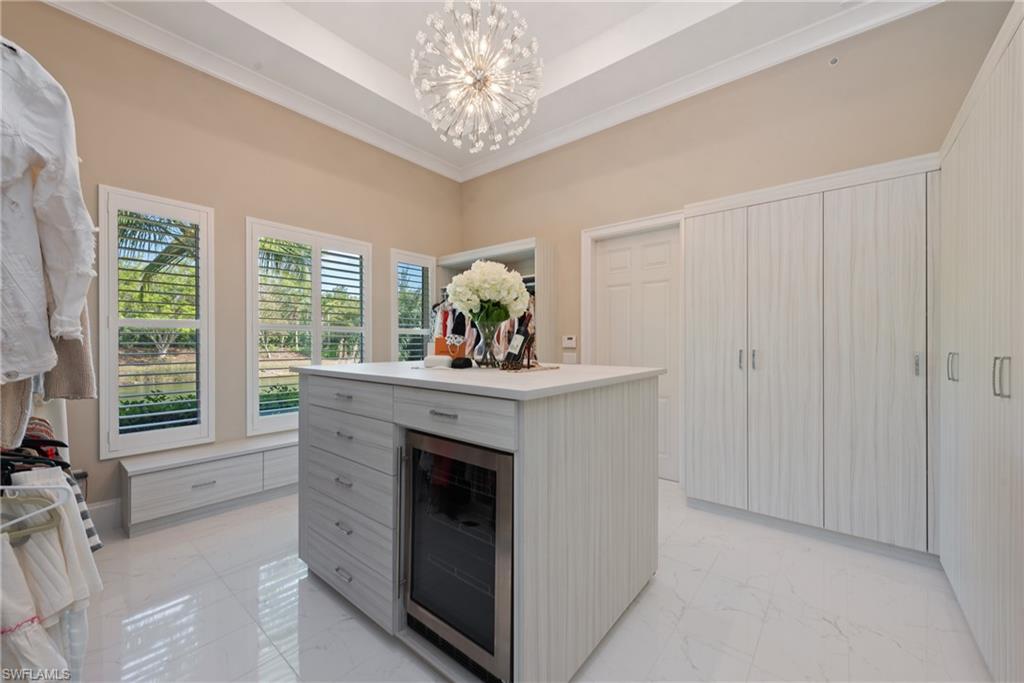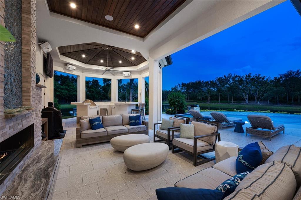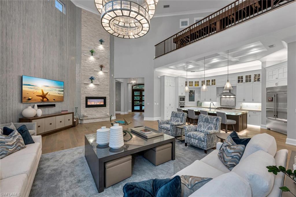 The ultimate waterfront lifestyle awaits in this exclusive Estate property with private dock in Miromar Lakes Beach & Golf Club. Perfectly designed on a private peninsula waterfront homesite, this magnificent 5-bedroom residence showcases exquisite architectural details. The centerpiece is a soaring, open-concept great room with grand chandelier & lighted 24-foot dual-sided linear gas fireplace. Design features include white oak wood flooring, tongue-and-groove and wood beam ceiling details, designer tile, open concept gourmet kitchen, butler’s pantry, and back-up generator. The primary suite offers a gracious bath with dressing area, steam shower, 3 walk in closets including a hers dressing room and separate entry. The second-floor with elevator access includes a game room, en suite bedroom, and open-air balcony. The outdoor oasis offers living room, fireplace, cooling system, electric screens, fully turfed yard with sprinkler system, wrap-around bar with grill and resort-style saltwater infinity edge pool, spa, outdoor shower, private dock. Tesla charger, AC garages, and home gym which can be converted back to additional garage. This is the perfect property for a discerning buyer looking to immediately begin enjoying the Miromar Lakes lifestyle and its unparalleled waterfront living. As the only southwest Florida community with miles of beach, boating, golf, and resort-style amenities in one picturesque destination, it offers a truly remarkable lifestyle. Water-ski, paddle board, kayak, sail, or fish on the 700-acre freshwater lake, unwind at the wellness spa, play the Arthur Hills “Signature” championship golf course, hone your tennis, or pickleball skills, or simply relax in the dreamy beachfront cabanas. Located minutes from Southwest Florida International Airport, world-class beaches, shopping, and dining.