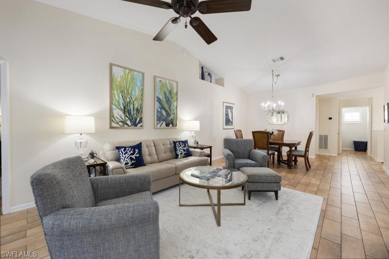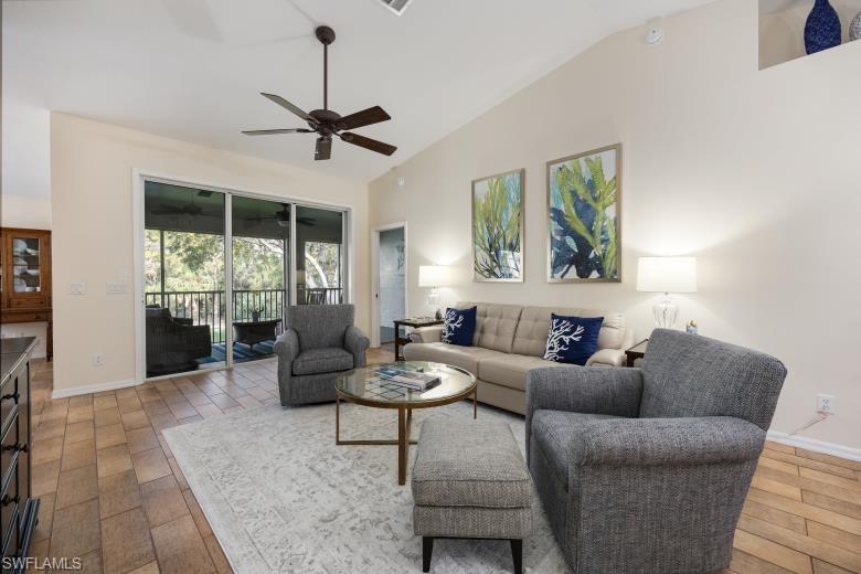 BACK ON THE MARKET with PRICE IMPROVEMENT in North Naples Prestigious Golf Course Community of The Strand. Second Floor Split Two Bedroom, Two Bath and Den with Attached Two Car Garage Coach Home offering 1793 Square Feet under air that is Move in Ready. Neat and clean throughout. Tile and hardwood flooring with No Carpet in Living Areas. Northwesterly views from Lanai offering Nice Sunsets, Peaceful Lake, Fountain, and Golf Course Views. Vaulted Ceilings, Neutral Colors, Updated Master Bathroom, Newer HVAC, and Hot Water (2019), and Roof is 5-1/2 Years Young. Great Location with Shopping, Restaurants, Hospital, and I-75 close by. Short Drive to Beaches and RSW Airport. Cypress Cove at Pelican Strand is quaint community with 23 Carriage Homes consisting of 4 units in each building, superbly maintained with Sound Financials. Social Membership is required for all members who do not hold a higher category of membership at The Strand and is included in the Annual Mandatory Club Fee. The Social category allows our members access to all of our amenities, except golf. The Club at The Strand offers a few types of memberships for those seeking to play Golf on the well maintained 3 Nine Hole Championship Golf Courses. An Active Country Club Lifestyle with New Fitness Center, Tennis, Pickleball, Bocce, Croquet, Restaurants and More. Come enjoy the Lifestyle at The Strand, you will not be disappointed!