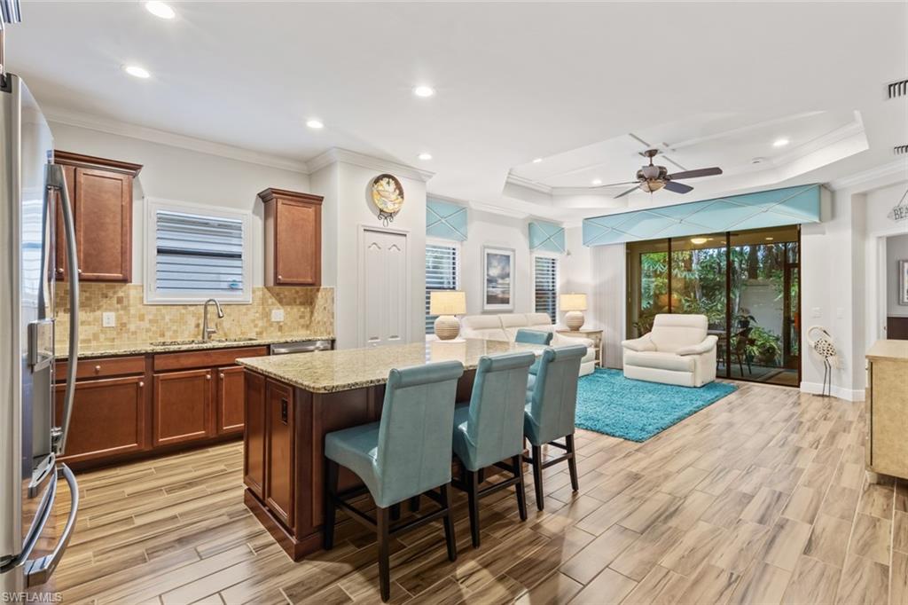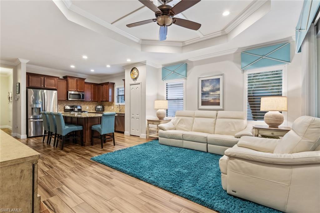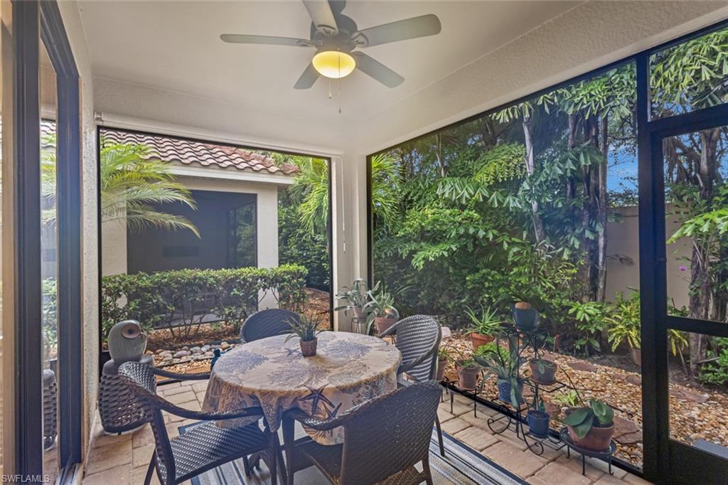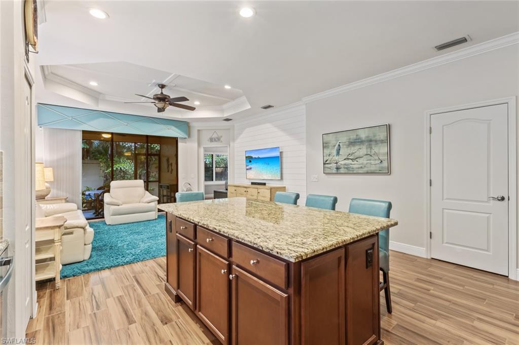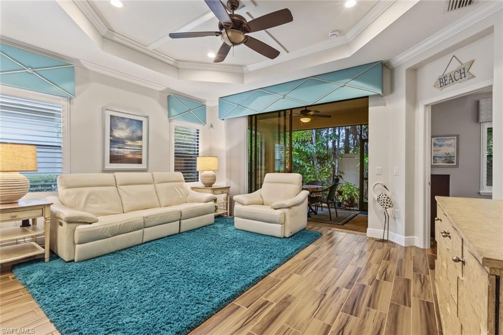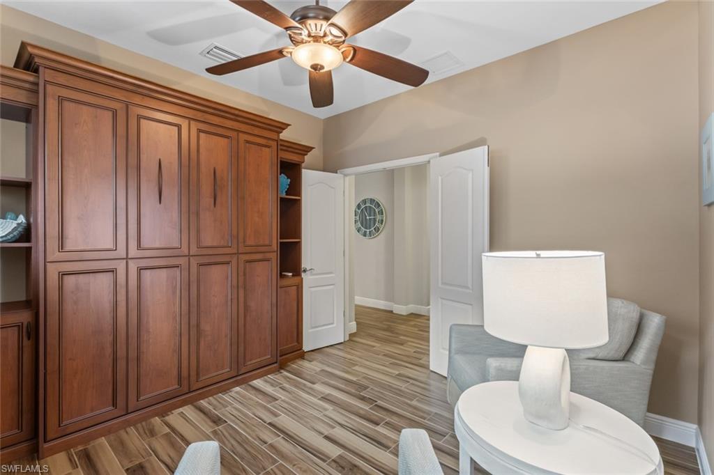 Welcome to Villa Palmeras in Estero— where Florida living meets comfort and style! This well-appointed, Neal-built villa offers the perfect blend of charm, convenience, and low-maintenance living — with NO CDD fees and NO flood zone! With only one owner, this home showcases the Crystal Sand split bedroom floor plan featuring 2 bedrooms, 2 bathrooms, and a versatile den/office that easily converts into a third bedroom with a custom Murphy bed and negotiable furnishings. The open layout highlights a spacious great room and dining area that flow seamlessly to a screened lanai through sliding doors, ideal for entertaining. The kitchen is a chef’s delight with a natural gas stove, granite countertops, stainless steel appliances, a large island, and ample wood cabinetry. The primary suite offers two closets (one walk-in with custom shelving), dual vanities, and a generous walk-in shower for added luxury. Additional features include: Crown molding, Tile flooring throughout, Shiplap accents and a Two-car garage with SafeRack storage. Villa Palmeras offers a community pool/spa, grilling area, cabanas, and a peaceful nature boardwalk. Situated in the heart of Estero, provides easy access to I-75, US-41, the airport, dining, shopping, entertainment, beaches and more!