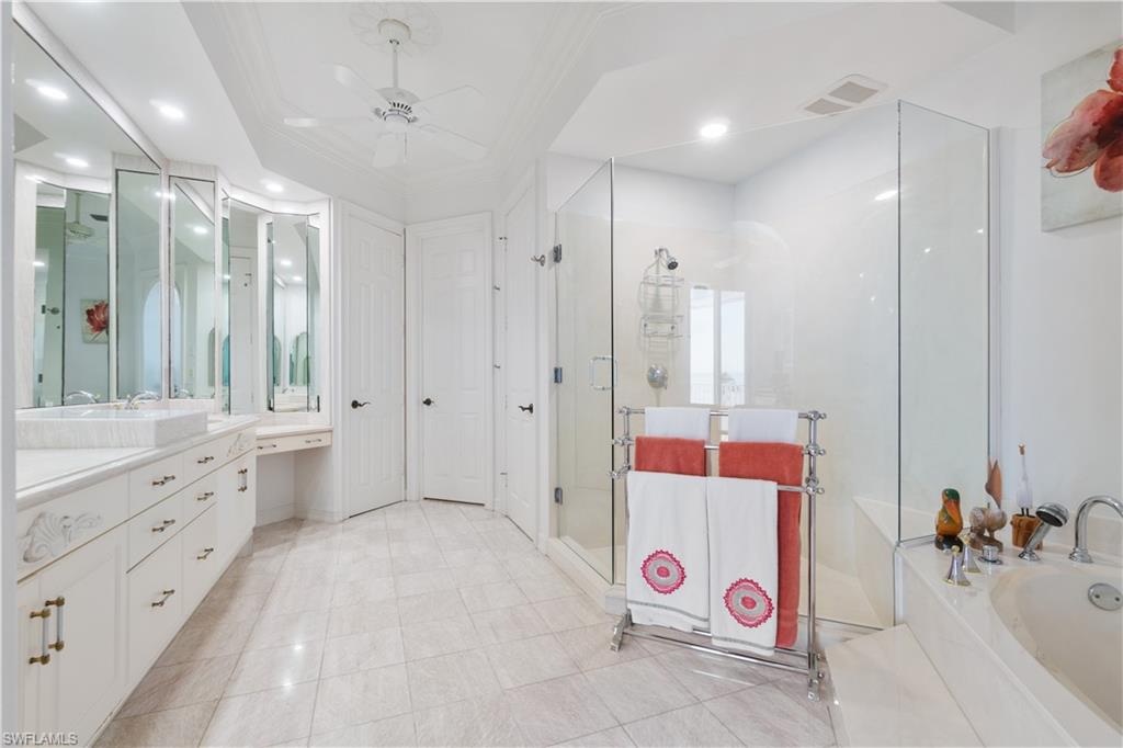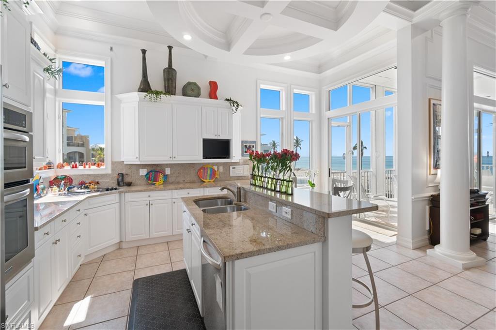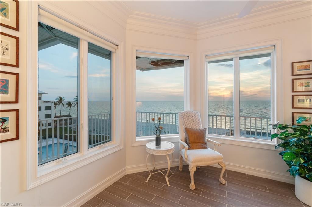 Stunning estate with breathtaking Gulf views in the highly coveted Beach Gardens of North Naples’ Barefoot Beach Community. This remarkable residence offers unparalleled views of pristine sugar sands and the turquoise waters of the Gulf, with private beach access right at your doorstep. This second position home offers coveted Southwestern rear exposure, providing gorgeous natural light throughout the day and stunning sunset views in the evening. This 4 bedroom + a den, 3.5 bathroom coastal retreat boasts hurricane impact windows and sliders, electric hurricane shutters, a private elevator, soaring ceilings, tile flooring, and versatile ground-level flex space. The gourmet chef’s kitchen showcases beautiful coffered ceilings, white cabinetry, granite countertops, an eat-in area, and a breakfast bar for casual dining. The open-concept layout allows for a seamless flow, with a spacious living room and a formal dining area with a domed ceiling and a charming fireplace. Step outside to the second-floor wraparound screened lanai offering a direct west and southwest view, where sweeping views of the Gulf and unforgettable sunsets await. The luxurious primary suite serves as a private retreat, featuring access to its own lanai, dual walk-in closets, a wet bar with a beverage cooler, and a spa-like bathroom with dual vanities, a frameless glass shower, and a separate jetted tub. The Beach Gardens community has undergone a stunning transformation, featuring lush landscaping and a resort-style pool. Optional membership to the exclusive "Club at Barefoot" provides access to tennis, two restaurants, beachside food and beverage service, and more. Conveniently located near fine dining, RSW Airport, Mercato, and Waterside Shops, and just 15 miles from the renowned Fifth Avenue in Naples, this home is a true gem in the heart of Barefoot Beach.