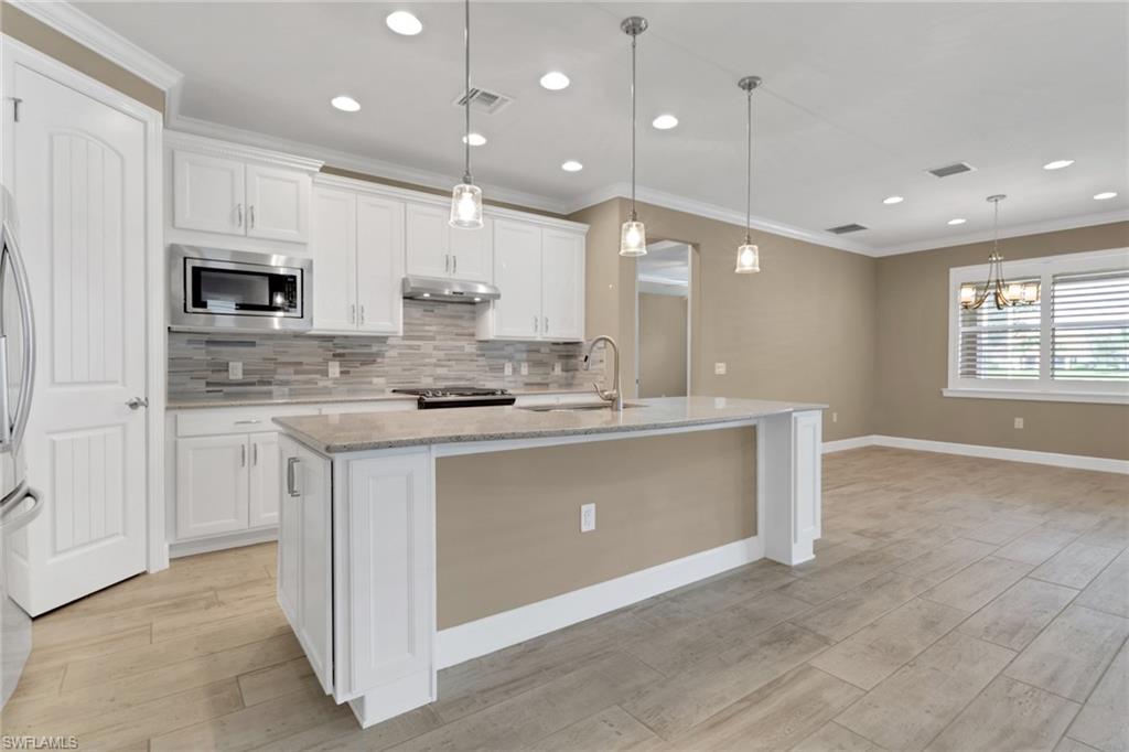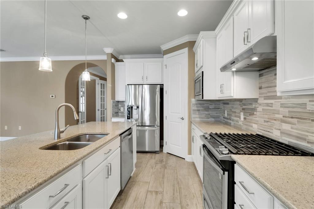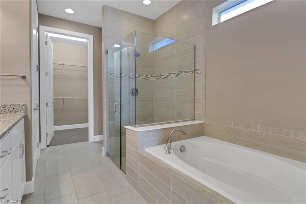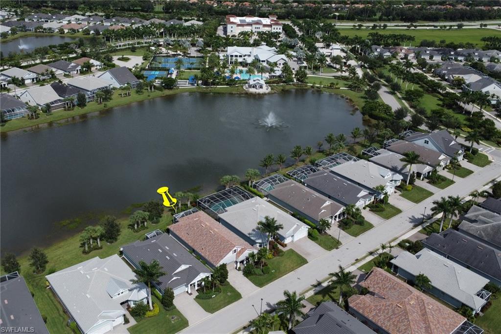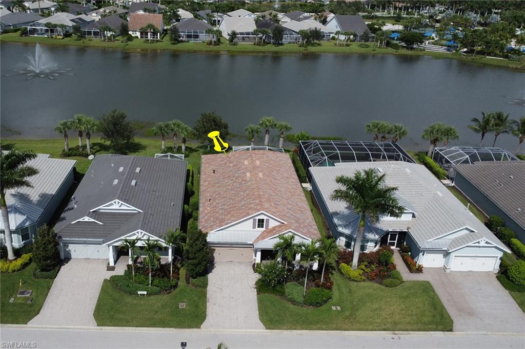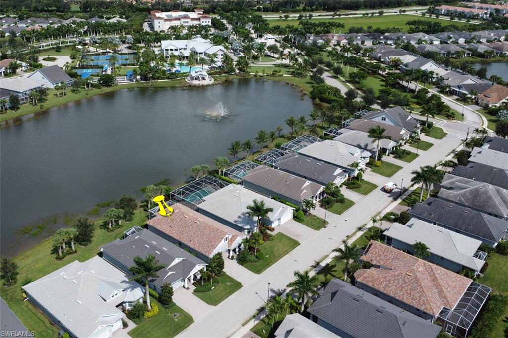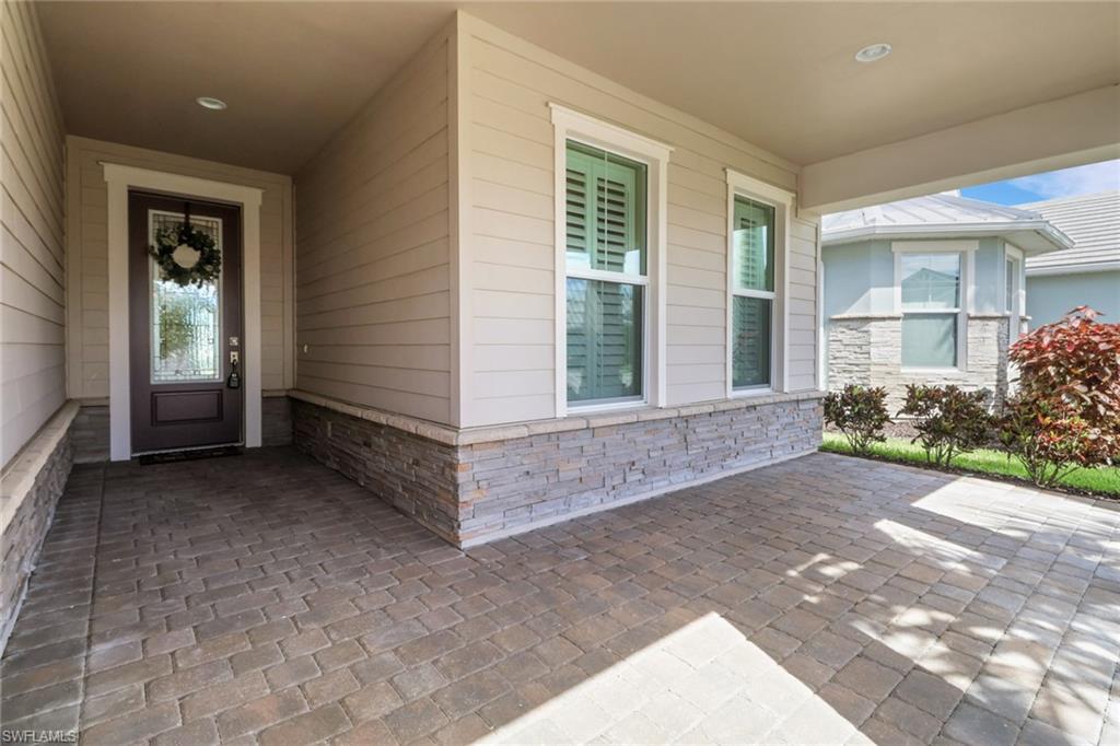 This beautifully upgraded 3-bedroom plus den home offers spectacular lake views and exceptional features throughout. From the welcoming front porch to the expanded lanai, every detail has been thoughtfully designed. The kitchen is the heart of the home, complete with quartz countertops, stainless steel appliances, a natural gas stove, and a large island perfect for entertaining. Structural upgrades include outdoor kitchen plumbing, a 4’ garage extension, 8’ interior doors, zero-corner sliders, impact windows, and an expanded lanai with extended roof cover—ideal for enjoying Florida living at its best. Inside, you’ll find elegant finishes such as upgraded tile in the main living areas, upgraded drywall and paint, plantation shutters, custom glass-insert doors for the den, upgraded slider shades, granite in all bathrooms, and a luxurious master suite with dual sinks, soaking tub, and separate walk-in shower. Additional conveniences include a utility sink in the garage and premium storage solutions. Tidewater, a premier 55+ community, offers resort-style amenities including a sparkling pool and spa, clubhouse, fitness center, and tennis and pickleball courts. The location is unbeatable—within walking distance to Hertz Arena and Miromar Outlets, minutes from Florida Gulf Coast University, dining, and Publix, and only 10 minutes to RSW International Airport. This lakefront gem combines luxury, convenience, and community in one perfect package.